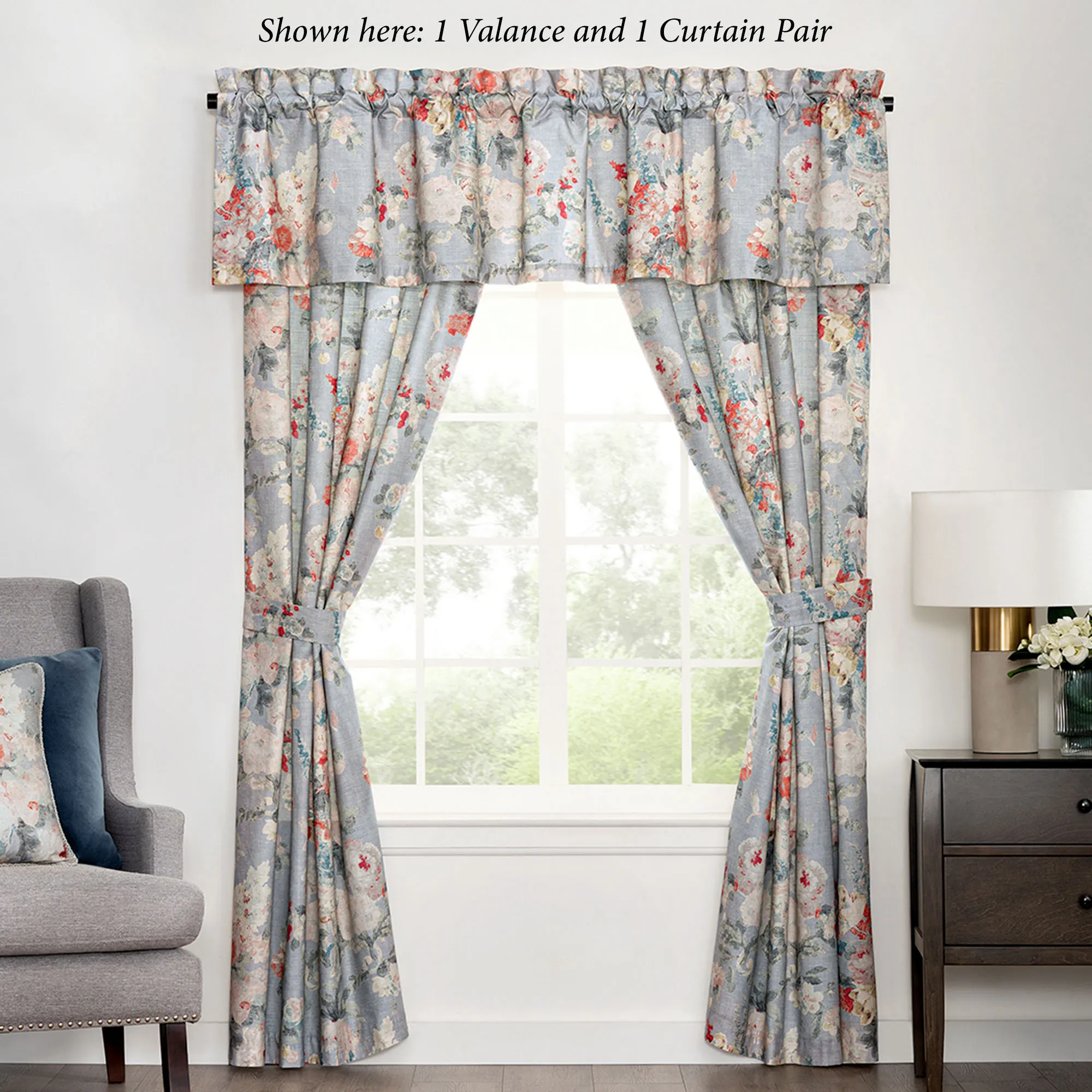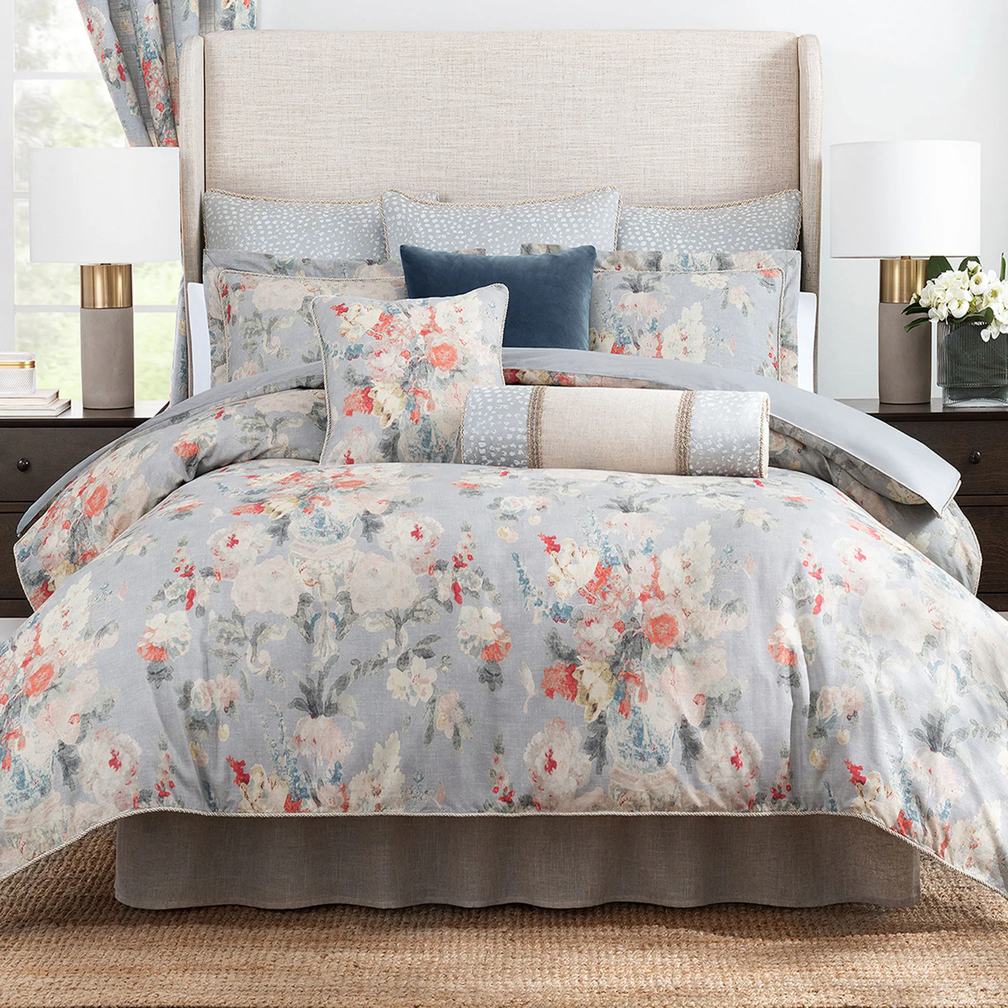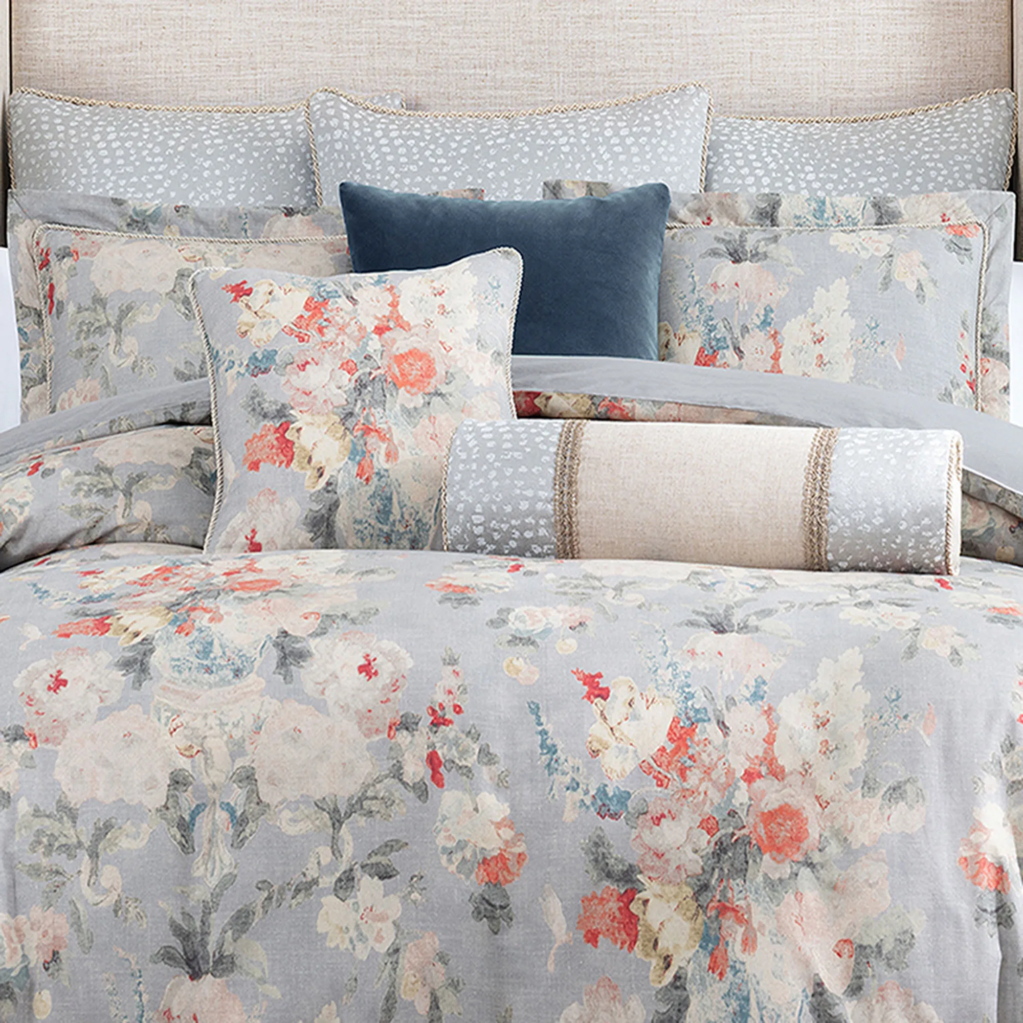 Breathtaking bouquets blossom upon the Penelope Bedding from Rose Tree. In a watercolor style, flourishing floral arrangements in printed hues of red, ivory, gray, blue, and green pattern the gray-blue cotton ground with a sophisticated charm. A gray abstract speckled woven polyester design and blue velvet polyester elements heighten the stylish allure.