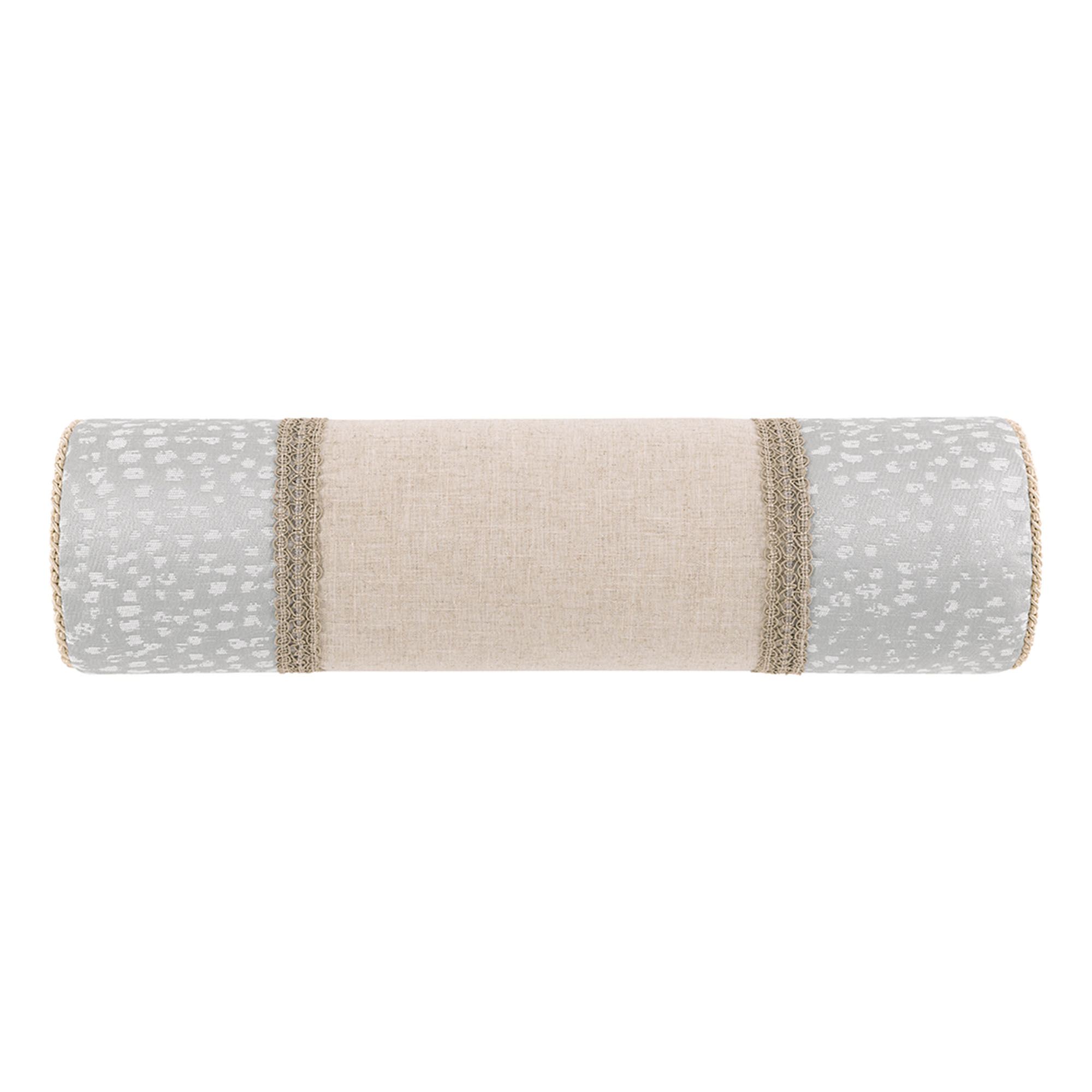 Pillows have zipper closures and polyester inserts. Spot clean. Neckroll has a slubbed beige polyester center, speckled gray sides, gimp trim accents, and twist-cording ends. The reversible 20" Square is blue velvet with tailored edges. The 18" Square features florals and twist-cording edges.
