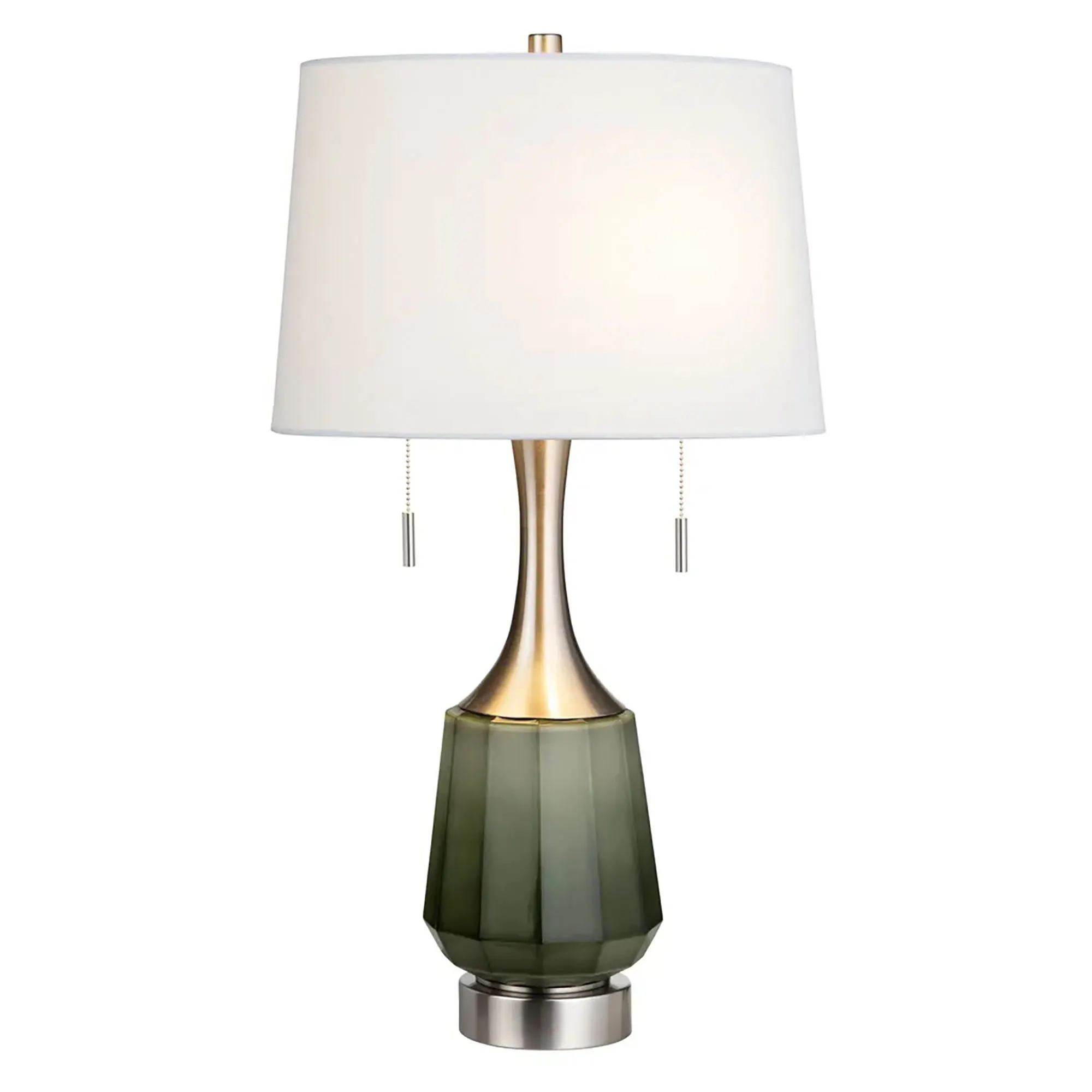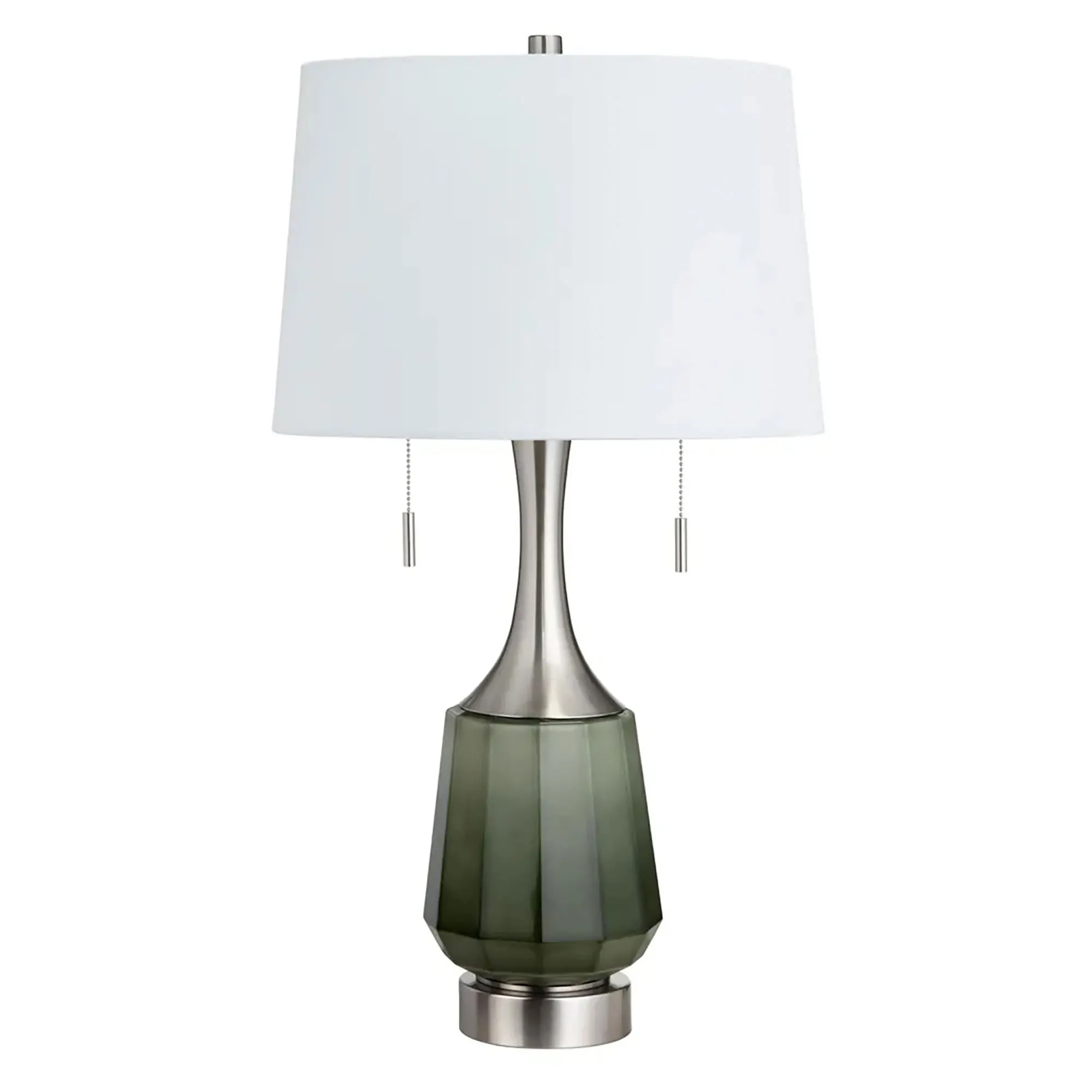 Accentuate any modern space with the Penn Table Lamp Pair. Each stunning table lamp has a faceted glass body with a green ombre finish and brushed nickel metal accents. The shade is white linen fabric. UL listed. Each lamp has dual pull chains, requires two 60W max. bulbs, and measures 16"dia.x29.5"H, including the 1.5"H finial. Pair weighs 13 lbs.