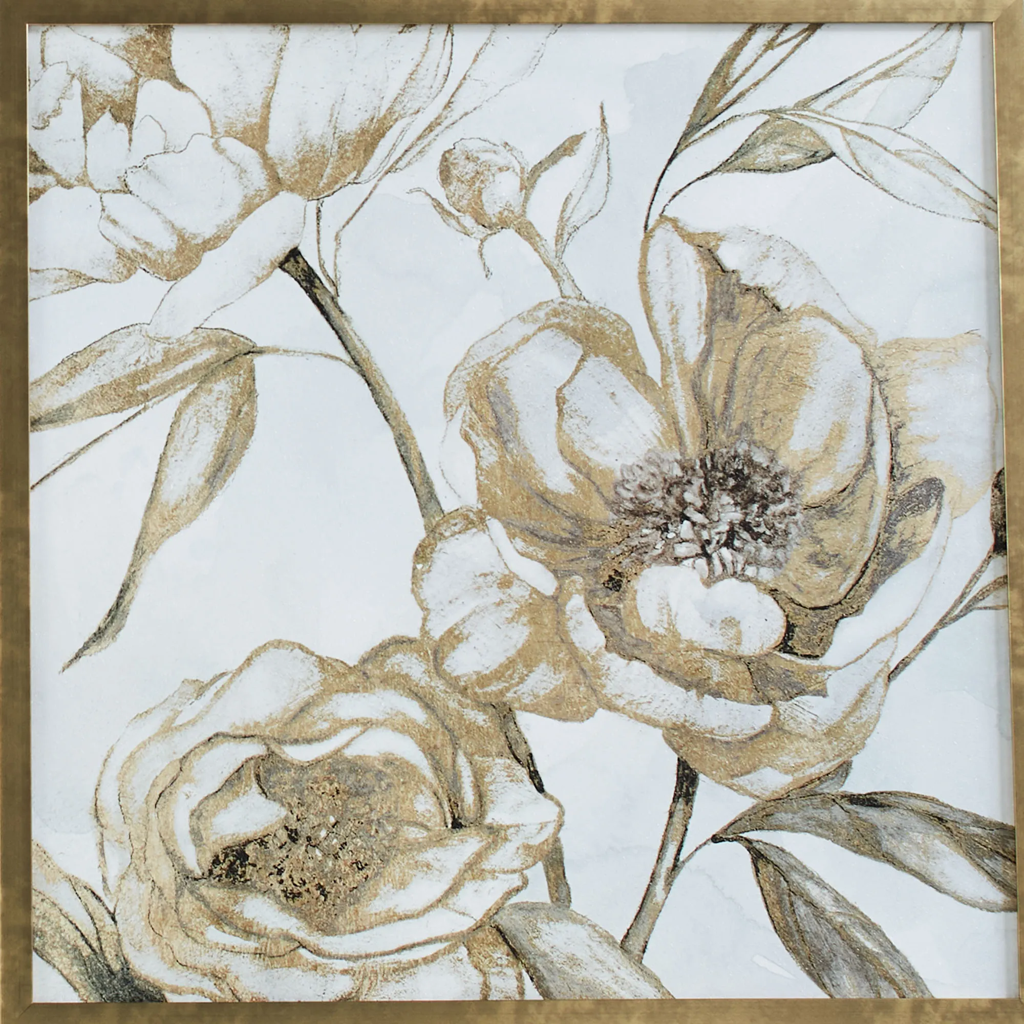 The Peony Glitz Framed Floral Wall Art displays a little bit of glam anywhere it's needed. This framed art is a textured paper print with a gel coating and features peonies in white, taupe, and gold on a white background. Peony Glitz I has a large bloom fully opened on the left side. Peony Glitz II has two large open blooms toward the bottom. The outer polystyrene frame is gold. Each measures 27"sq.x1.5"D.