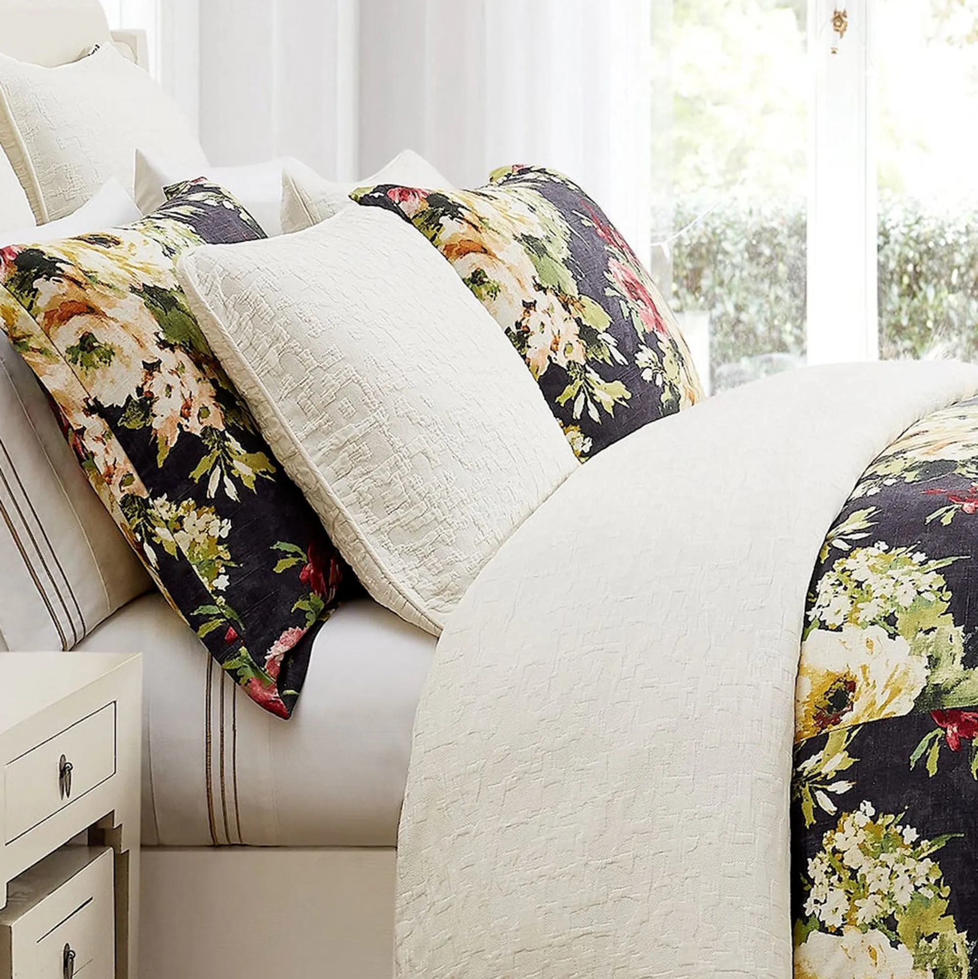 Doze among sweet petals with the Peony II Floral Comforter Bedding. The Mini Comforter Set includes a comforter and shams. With a viscose and linen-blend design, the slubbed, woven black and charcoal bedding features printed watercolor blossoms scattered in shades of burgundy, pink, green, antique gold, and white. Oversized comforter has tailored edges and a black cotton back. Fill is polyester. Machine washable. Imported. Sorry, the white coverlet and accessories shown are not available.