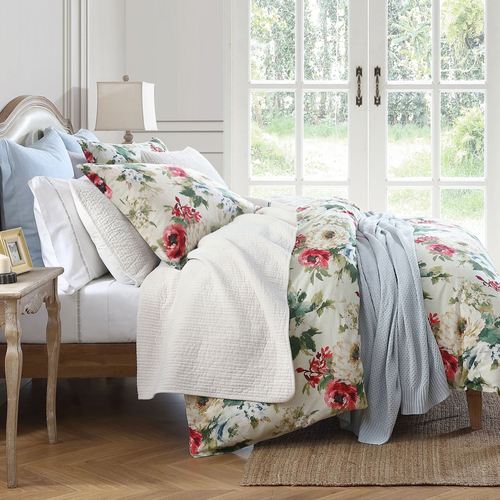Imagine dozing in the sweet, soft petals of a Peony as you rest with this charming floral ensemble. With a viscose and linen-blend design, the slubbed, woven ivory bedding features printed watercolor blossoms scattered in shades of red, green, antique gold, and blue.