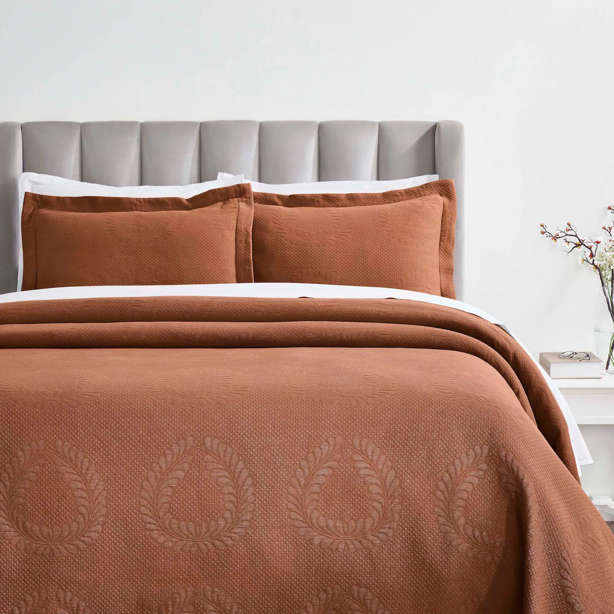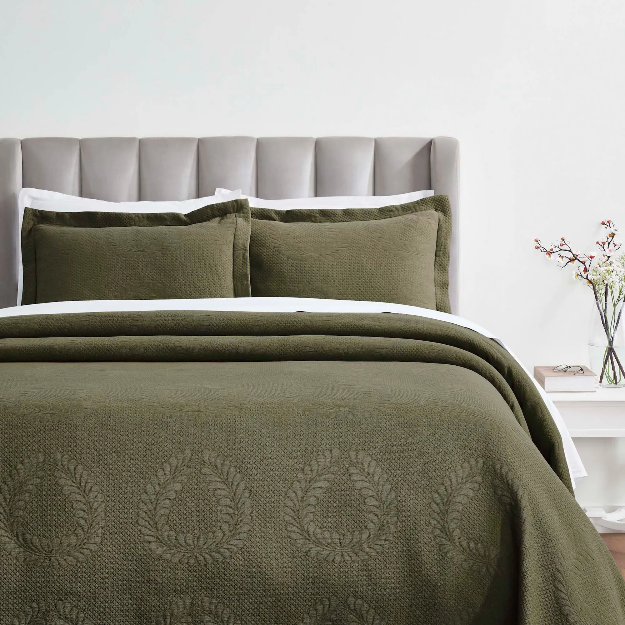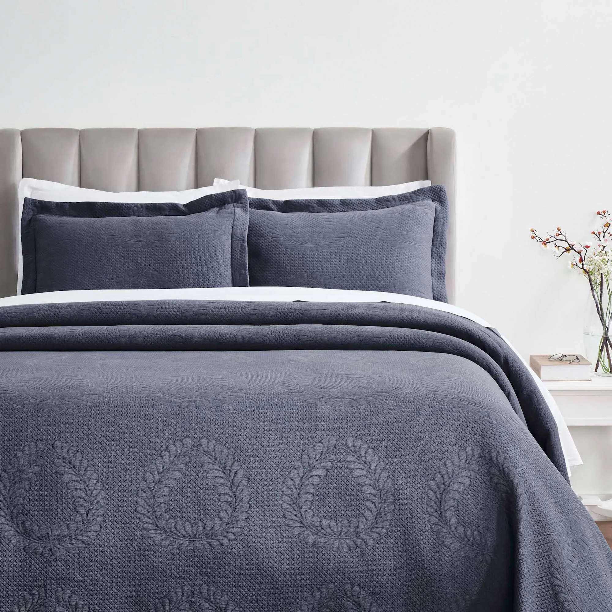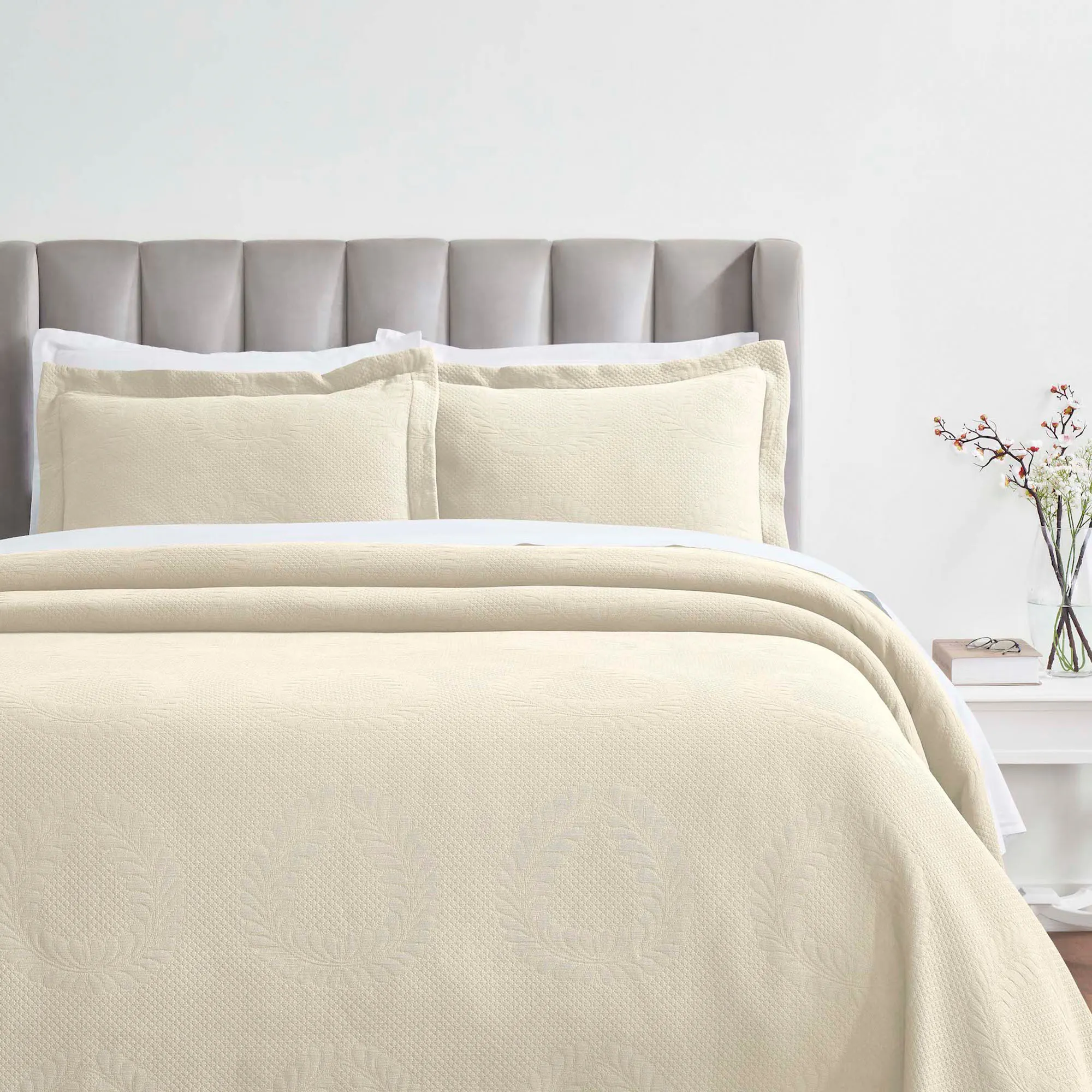 Crown your space with the classic comfort of the Peploi Matelasse Bedding. The Bedspread Set includes a bedspread and shams. In an ultra-soft, pure cotton design, the medium-weight matelasse bedding features a timeless air with a richly textured diamond background and laurel wreath designs. The tone-on-tone, solid color bedding provides a refined look and luxurious feel. Machine washable. Imported.