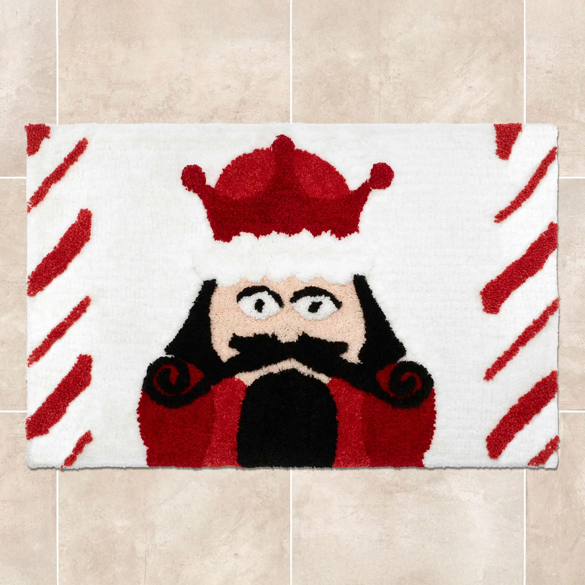 The Peppermint Nutcracker Bath Rug is made of cotton with latex backing. Imported.