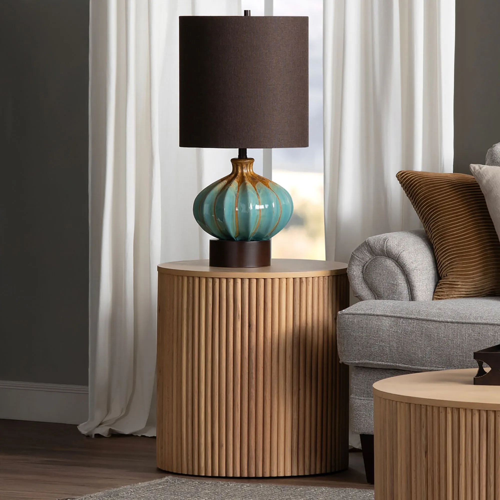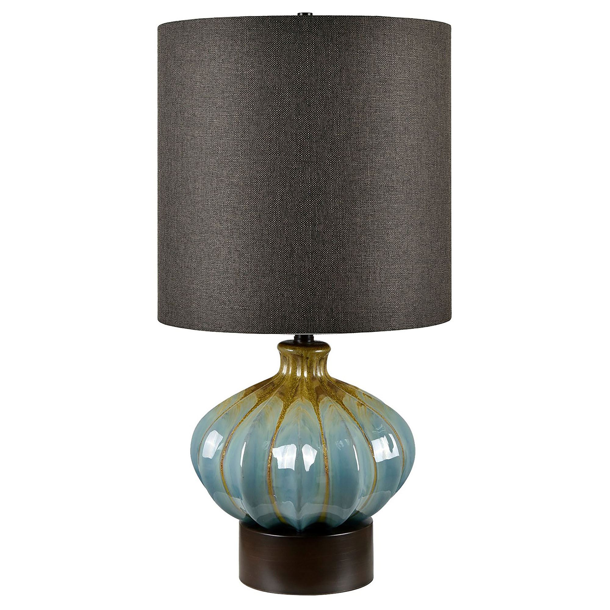 The Pfifer Table Lamp brings an artistic element to any room. This ceramic table lamp has a fluted design with a reactive glaze in hues of aqua and brown on a rich chocolate mounting base. The elongated, linen fabric shade is a rich chocolate color. UL listed. Requires one 150W max. 3-way bulb. Measures 15"dia.x29.5"H, including the 1.25"H finial. Table lamp weighs 10 lbs.