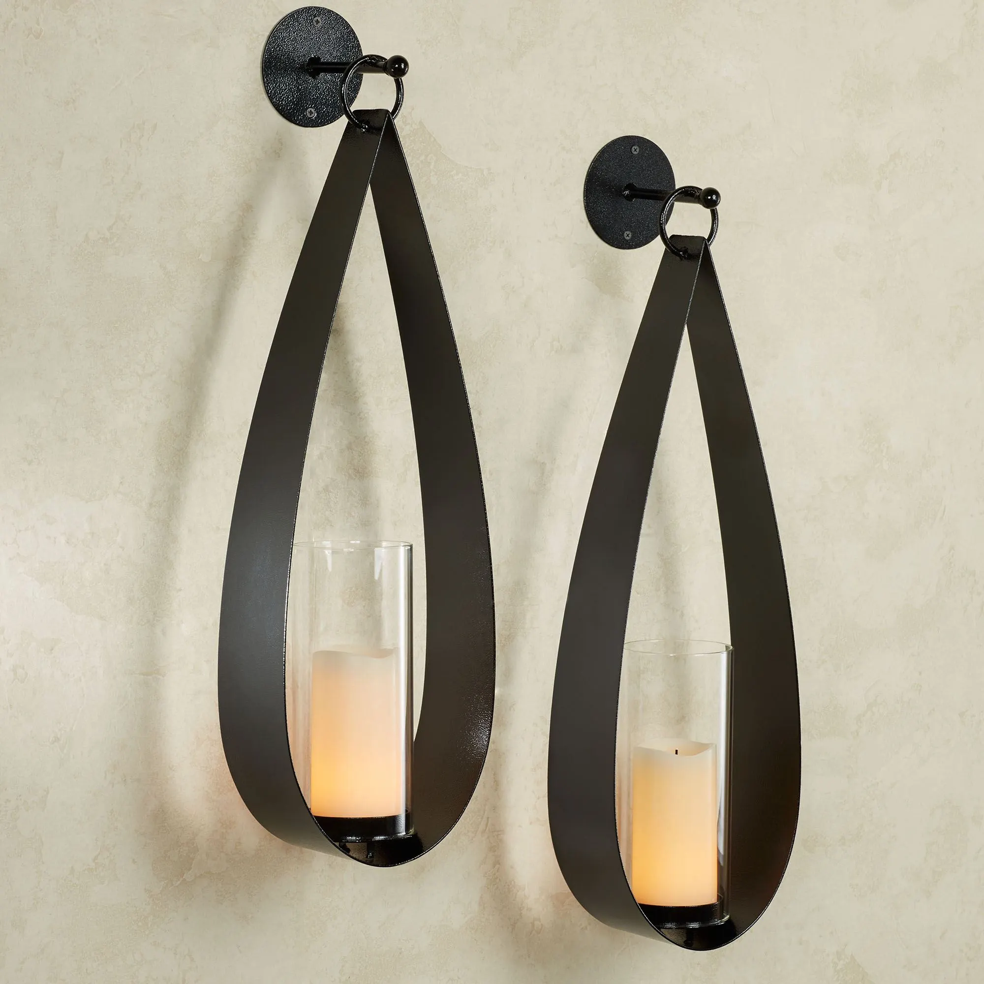 The graceful teardrop shape of the Pharos Black Wall Sconce Pair adds allure to your space. Hanging from an attached round bracket, each large openwork teardrop cradles an included 4"dia.x9.5"H glass hurricane, which holds your 3" dia. pillar candle. Designed by JasonW Studios(R), the unique design is handcrafted by American craftsmen of 14-gauge steel. The teardrop shapes are finished in black with a UV-, weather-, and tarnish-resistant powder-coat hue that complements your decor. Each wall sconce measures 9"Wx5"Dx27"H.