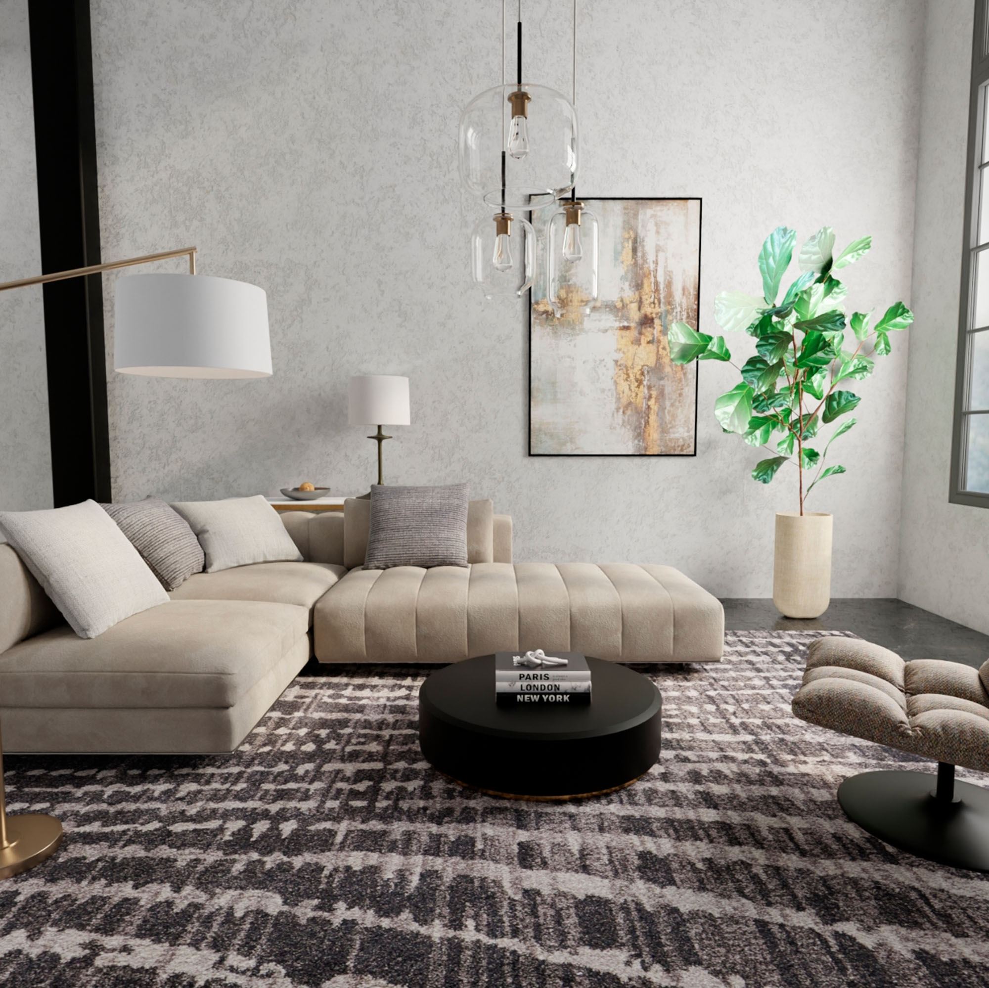 • Easy-care polypropylene rugs are kid- and pet-friendly