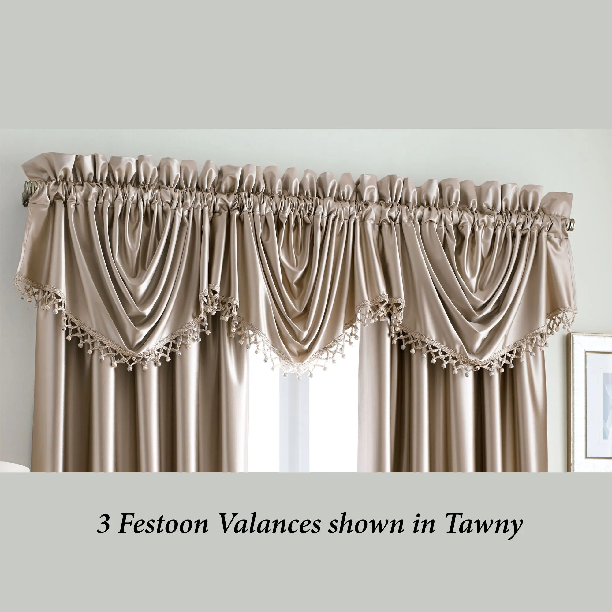 The glossy texture of the Phoenixx Window Treatment radiates a glamorous elegance from the luxurious fabric. Each solid color polyester window accent has a faux satin appearance and a 3" rod pocket. Specify Curtain Panel or Festoon Valance (no longer available). Sold individually, each lined Panel measures 50"W. Festoon Valance features ball tassel trim; each measures 43"Wx26"L. Machine washable. Imported.