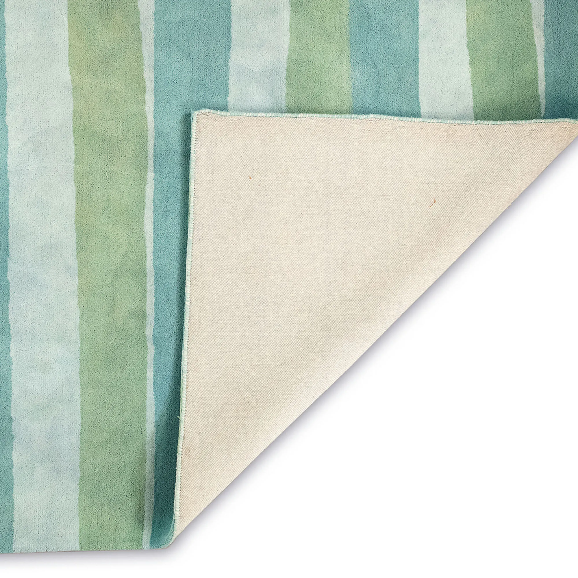 The bold color of the Piazza Stripe Area Rug freshens a space with pizzazz. Hand-tufted from hand-dipped dyed wool, the .5" thick rug, designed by Liora Manne, features an irregular stripe pattern in artistic cool shades of blue and green. Backing is cotton. We recommend professional cleaning by a rug cleaner. Imported.