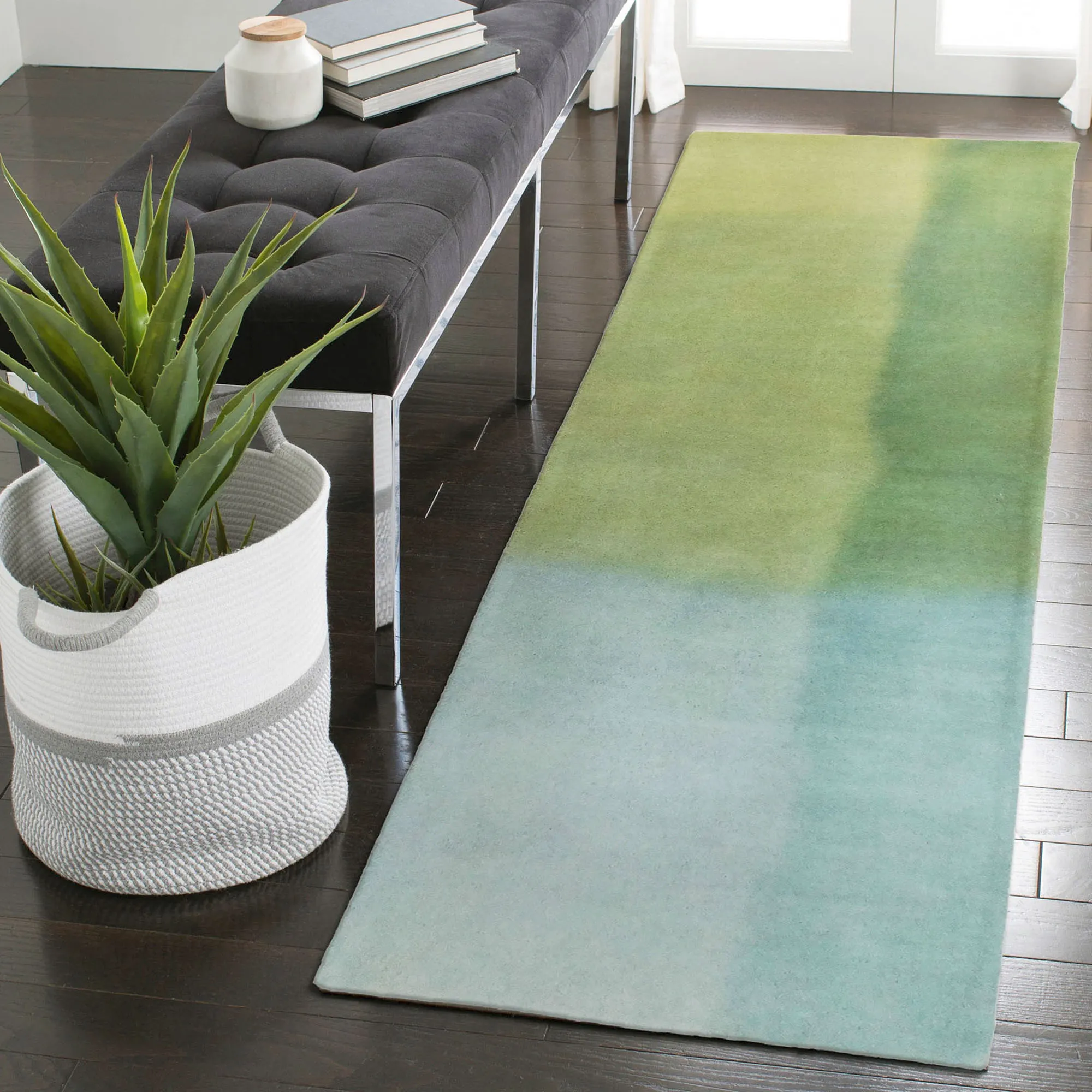 Hand-dipped and dyed shades of cool blue and green mingle to form the unique look on the Piazza Watercolor Area Rug. The plush, hand-tufted wool rug, .5" thick, is by Liora Manne and features block designs that resemble a stunning work of art. Backing is cotton. We recommend professional cleaning by a rug cleaner. Imported.