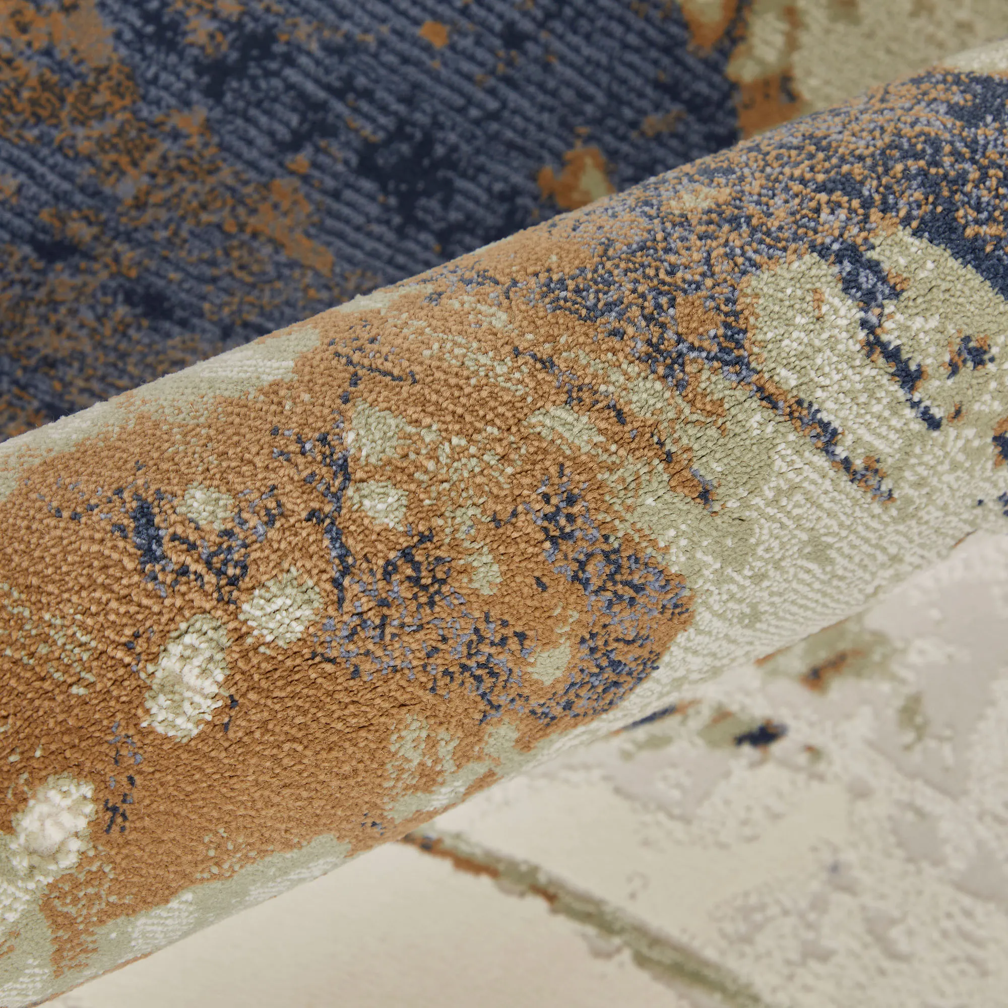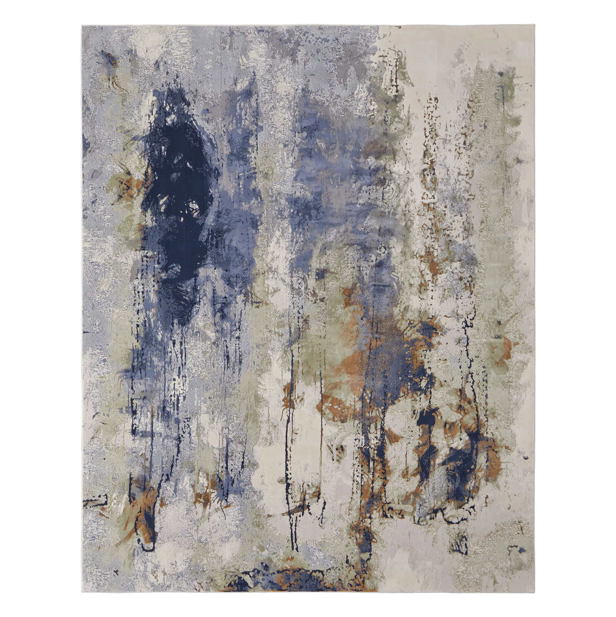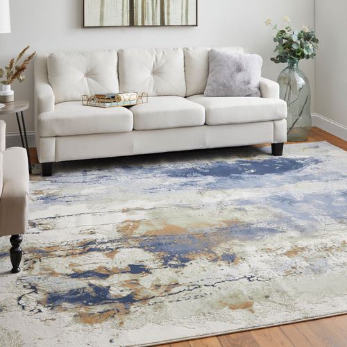 Mottled designs create the abstract, contemporary look of the Pierce Rug. The power-loomed, polypropylene and polyester area rug has a cut hi-lo pile, .39" thick, and includes the colors of blue, copper, latte, ivory, and gray. Backing is latex. We recommend professional cleaning by a rug cleaner. Imported.