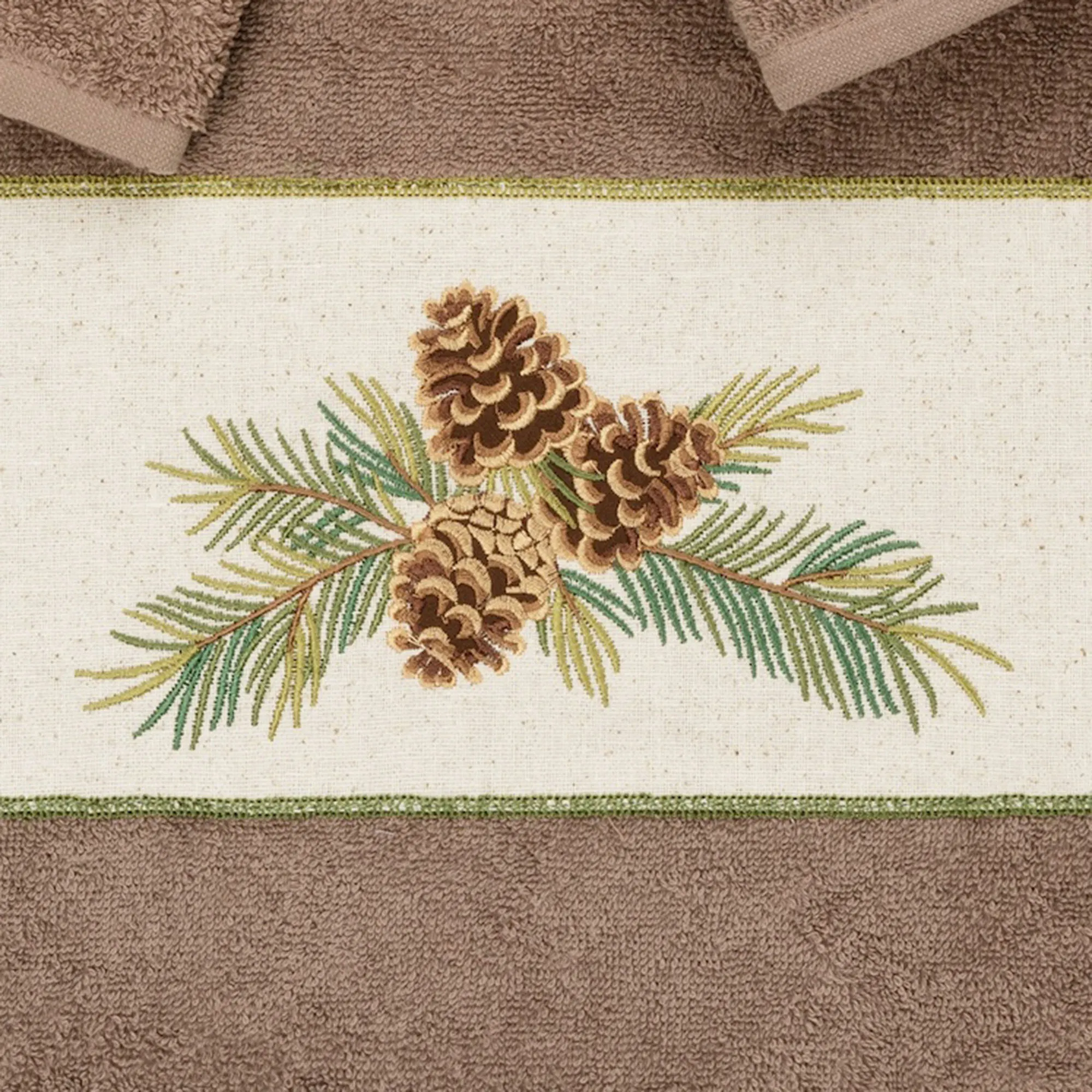 The Pierre Bath Towel Set displays woodland beauty. These super-absorbent and quick-drying towels are made from premium Turkish cotton and have 500 GSM. Towels feature embroidered branch motifs; most also have embroidered pine cones on a cotton osnaburg cloth. These super-soft towels and washcloth are durable and keep their plush appearance after washing. The rustic, three-piece towel set includes one bath towel, 27"x54"; one hand towel, 16"x30"; and one washcloth, 13" sq. Machine washable. Imported/USA.