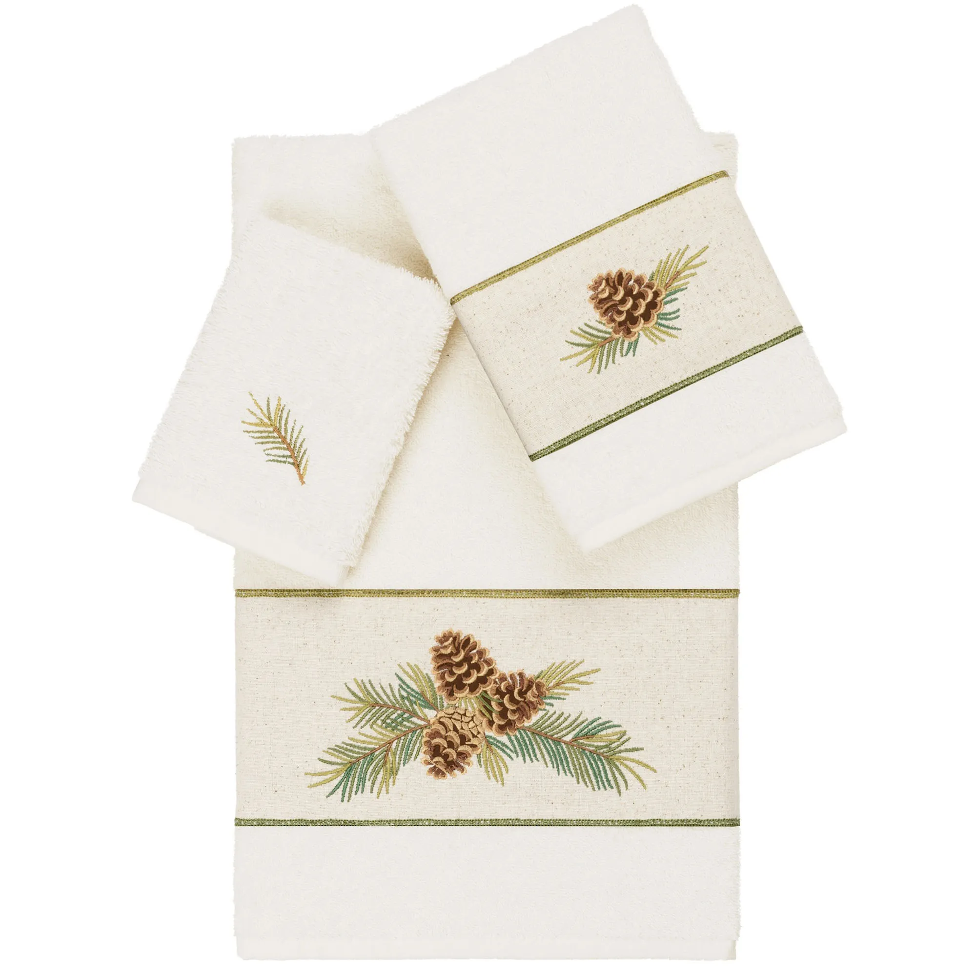 The Pierre Pine Cone Towel Set is made of Turkish cotton. Imported/USA.