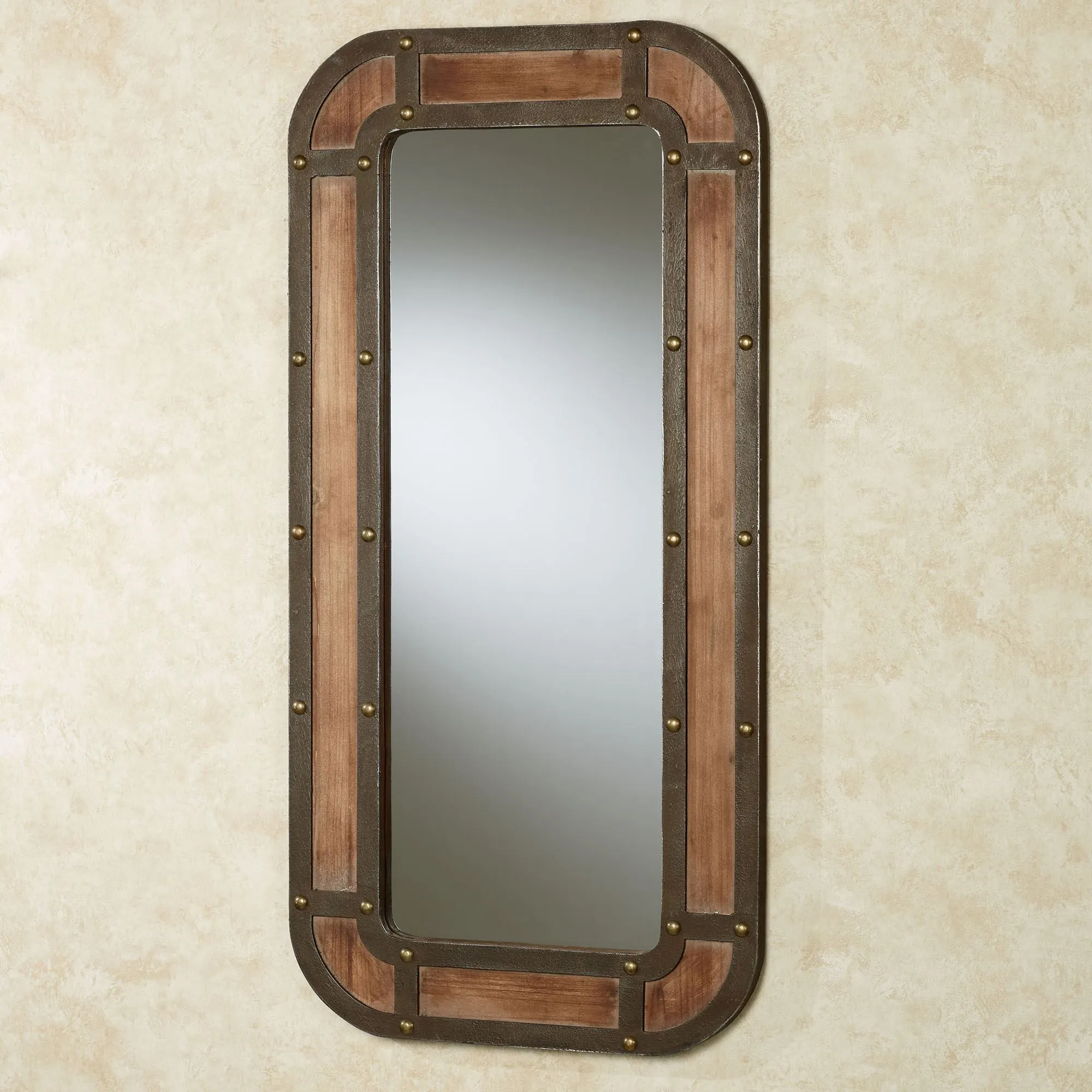 The Pikeville Wall Mirror is wooden with metal nailheads and glass.