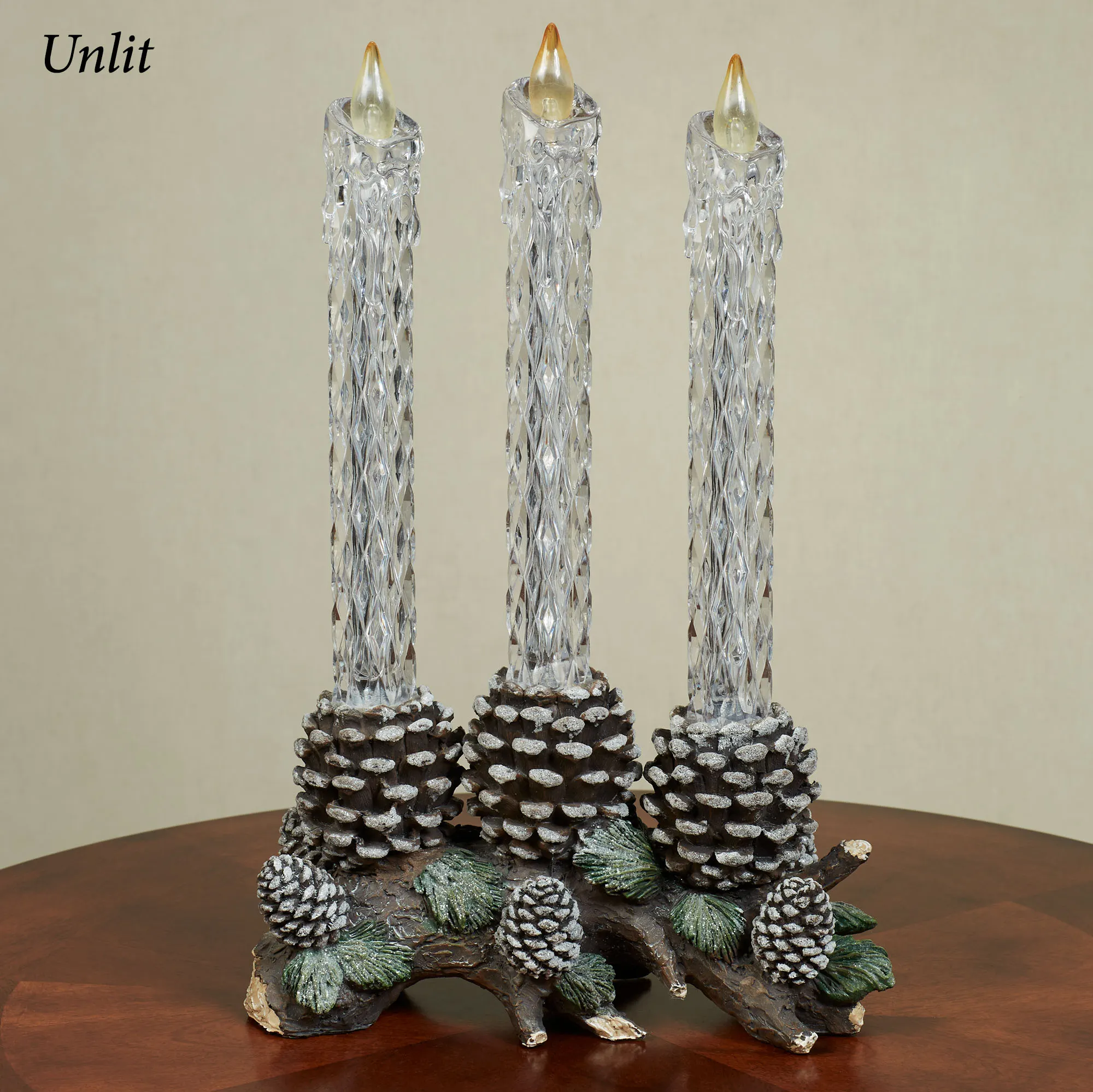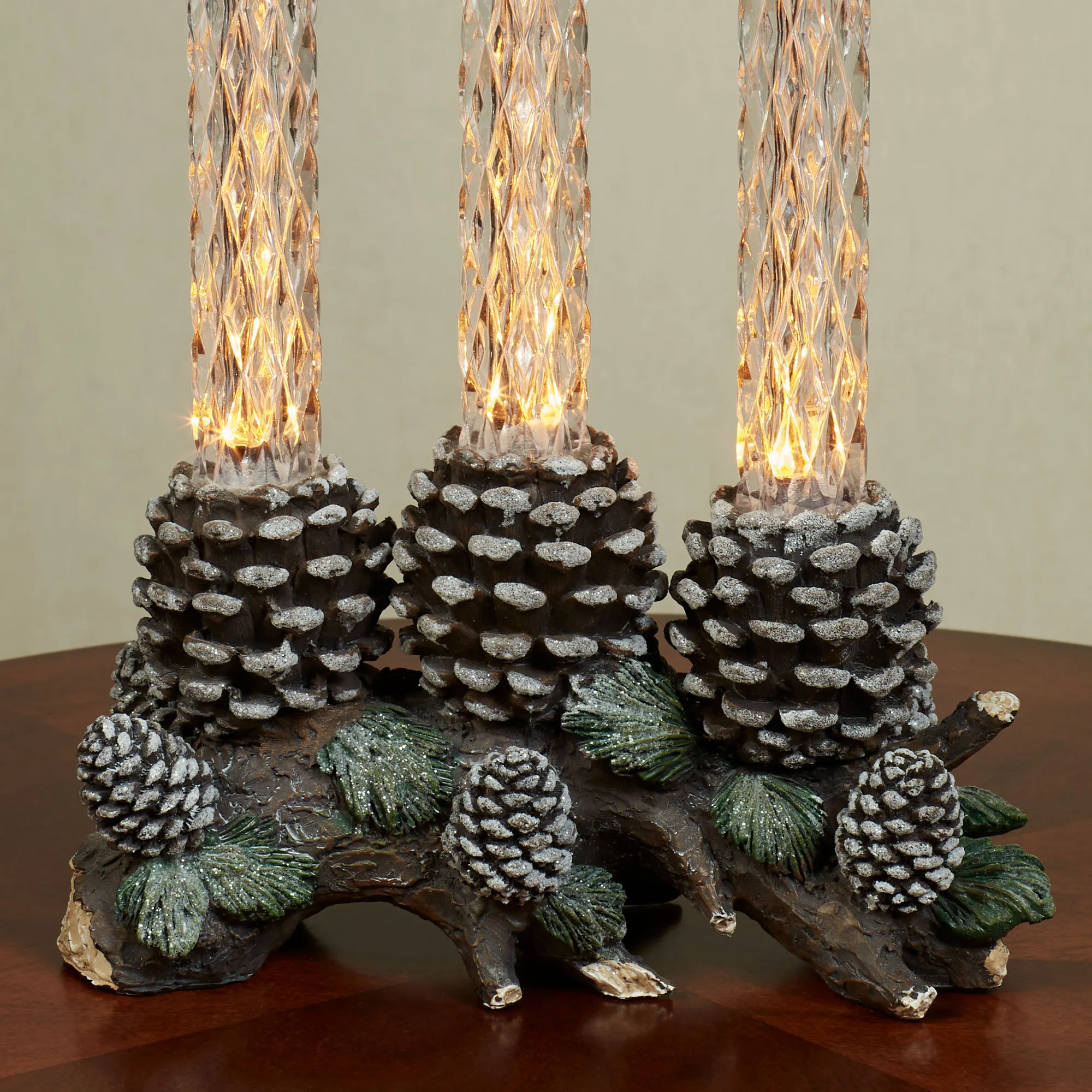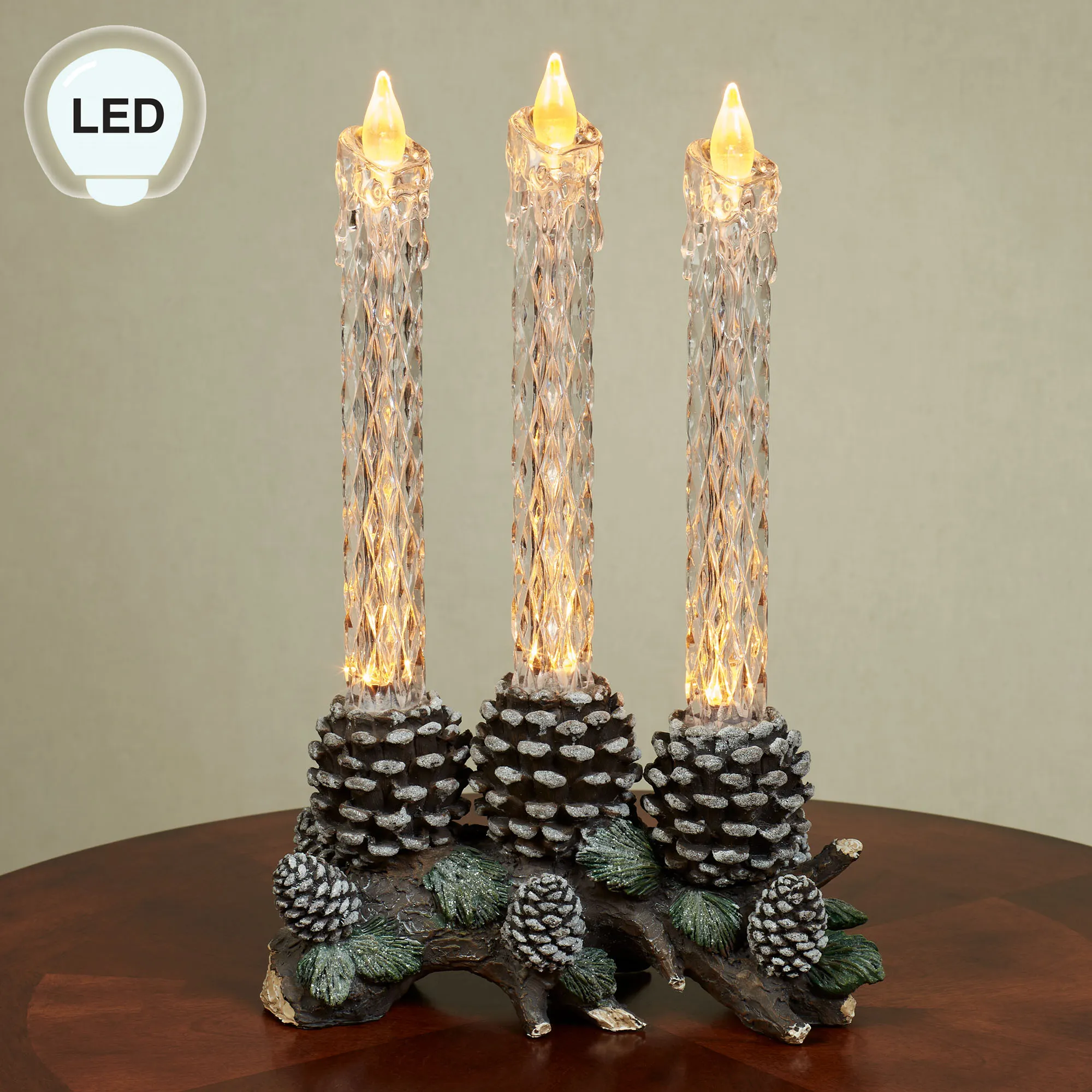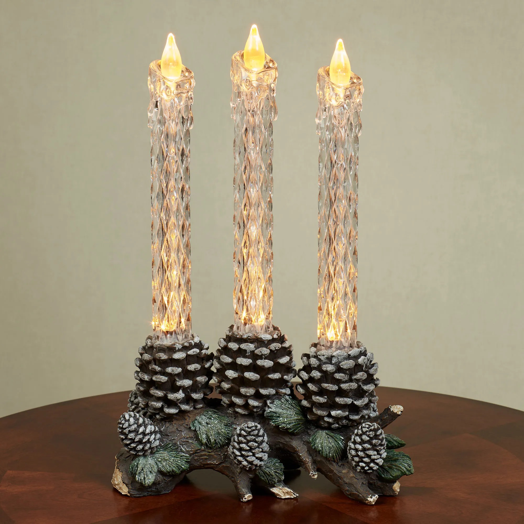 The Pine Bough with LED Taper Candles Tabletop Accent glows with rustic winter charm. Crafted from resin, the lighted decorative accent resembles a brown branch laden with glittering green pine needles and brown pine cones. Three large pine cones hold clear molded plastic flameless LED candles with a unique faceted texture and melted appearance around the golden flickering flame. Operates via an on/off/six-hour timer switch on the bottom and requires two of your AA batteries or your adapter for use with the included USB cord. Measures 10"Wx5"Dx15.5"H.