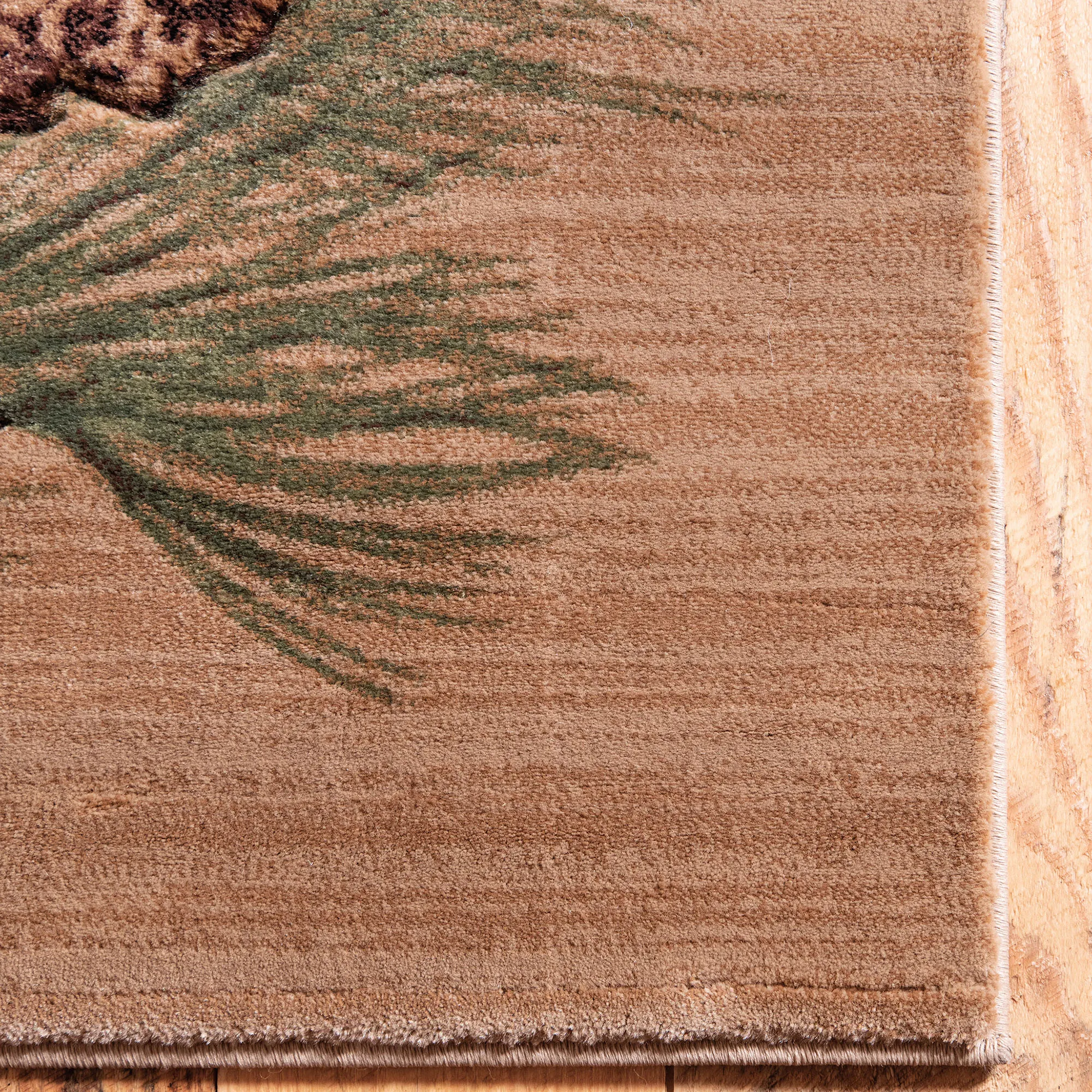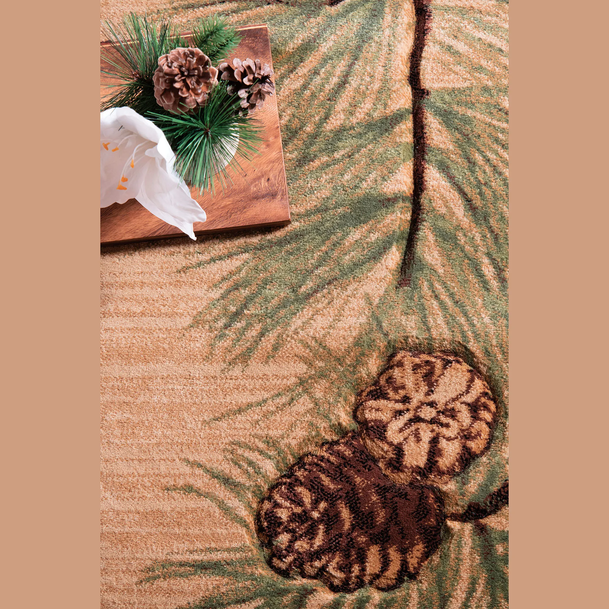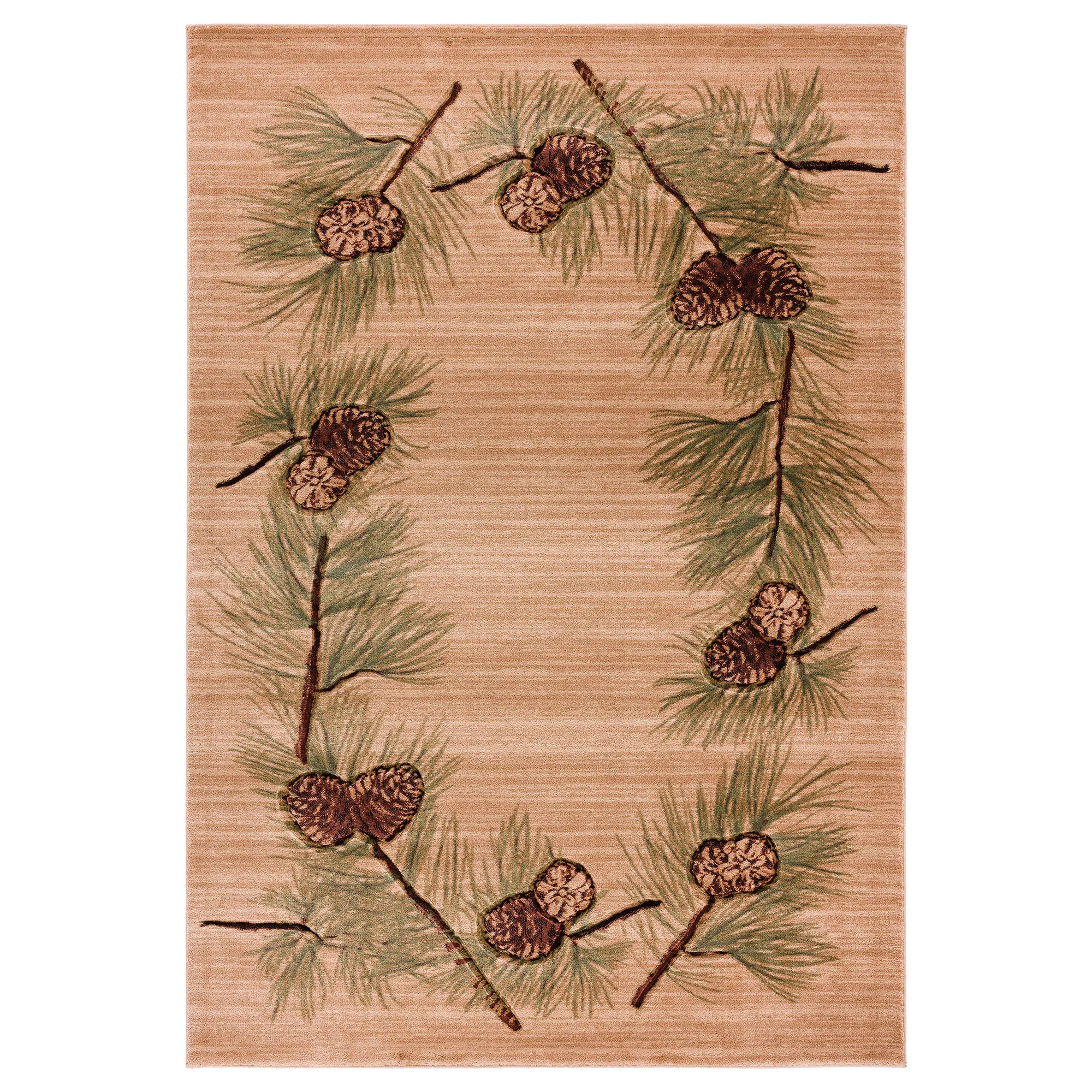 Deep carving adds unique dimension to the rustic Pine Cone Border Area Rug. Power-loomed from polypropylene, the .53" thick rug features a beige striated background bordered with pine cones, branches, and needles in natural shades of chocolate, mocha, ivory, sage, beige, and dark beige. We recommend professional cleaning by a rug cleaner. Imported.