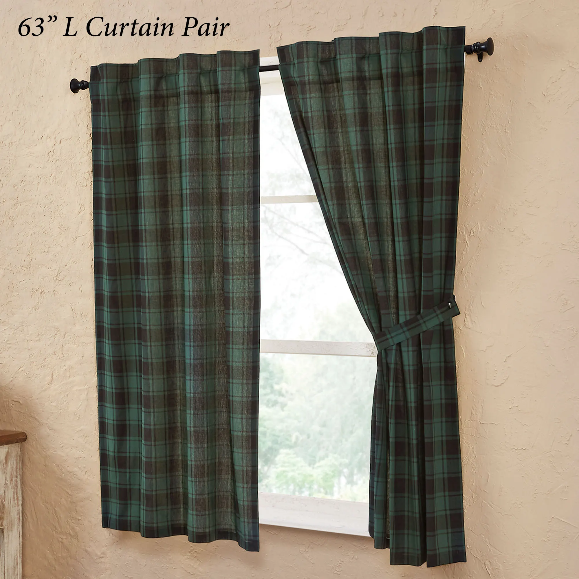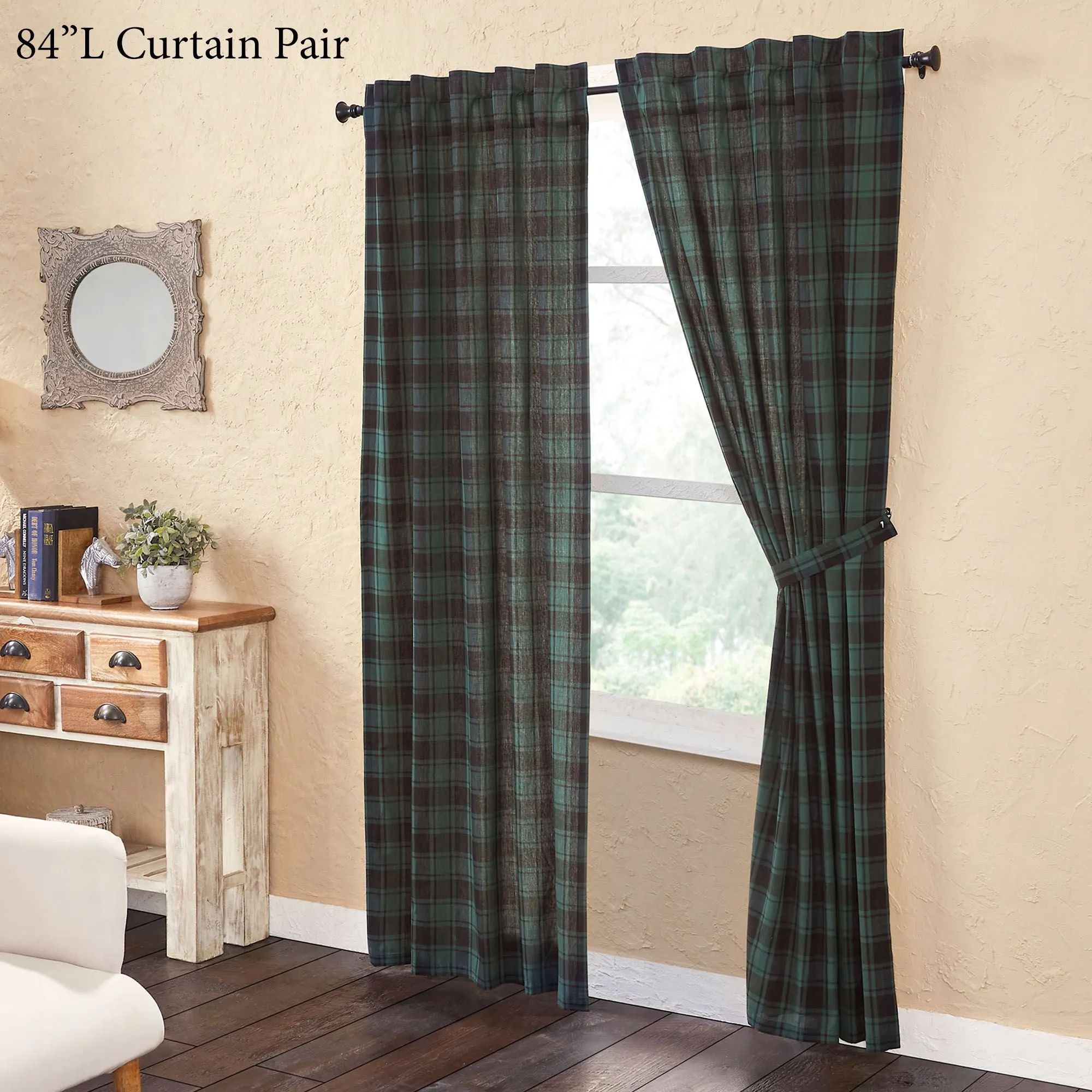 Lined Window Treatment is buffalo plaid with tailored edges and 3.25" rod pockets. Curtain Pair includes tiebacks. Curtains are available in two sizes. Valance is available in two widths.