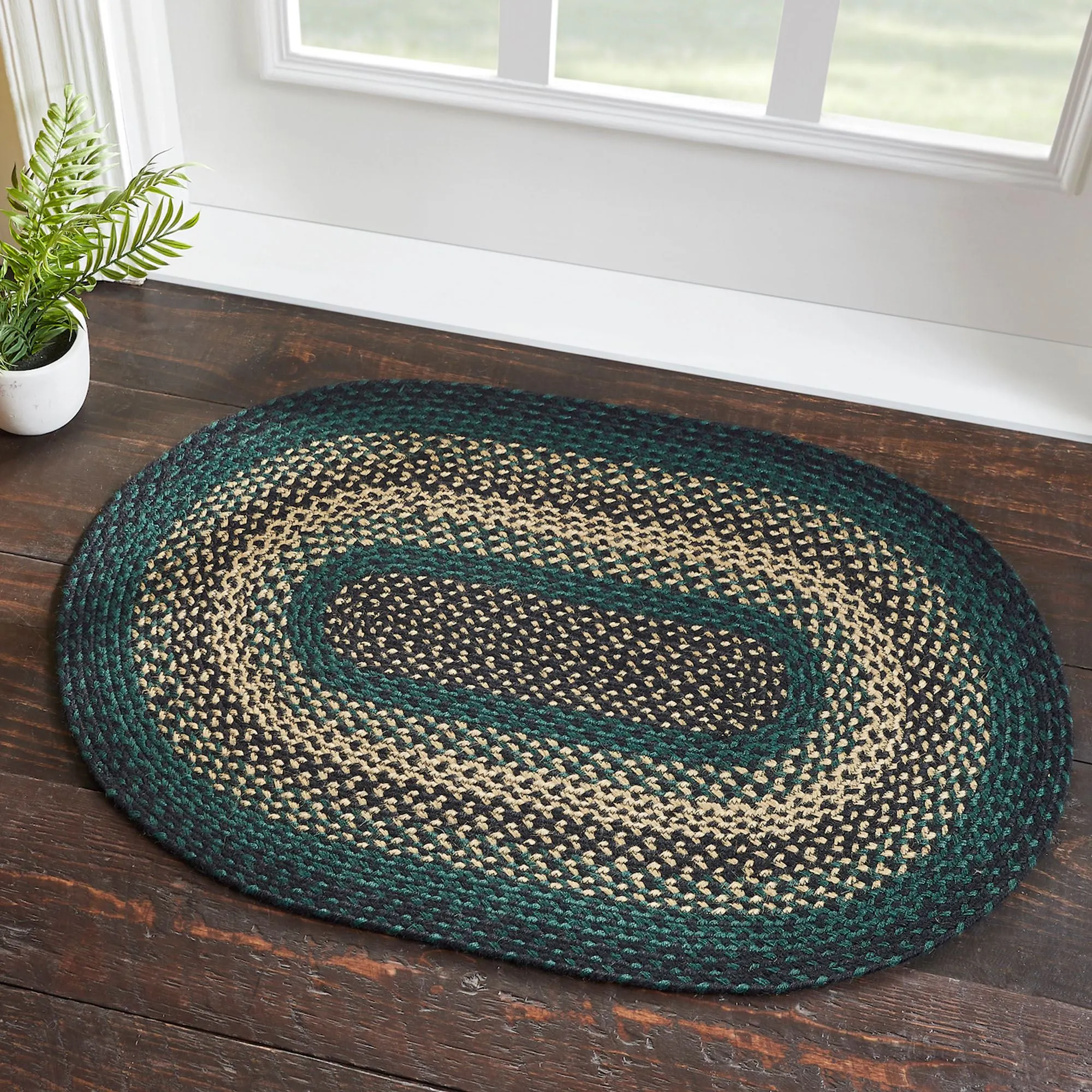 Showcase a rustic look with the concentric braid design on the Pine Grove Rug. The jute/cotton blend/acrylic rug, by Oak & Asher, is .25" thick and machine-stitched for durability. Colors include green, tan, and black. Braided rug includes a nonslip PVC rug pad. Spot clean. Made in India.