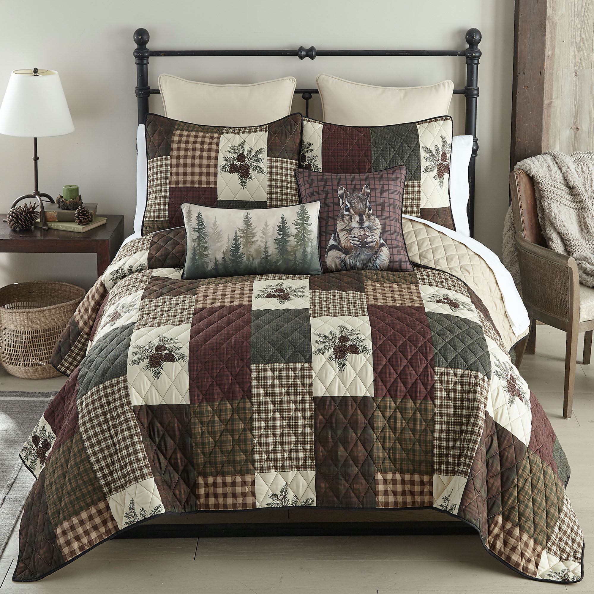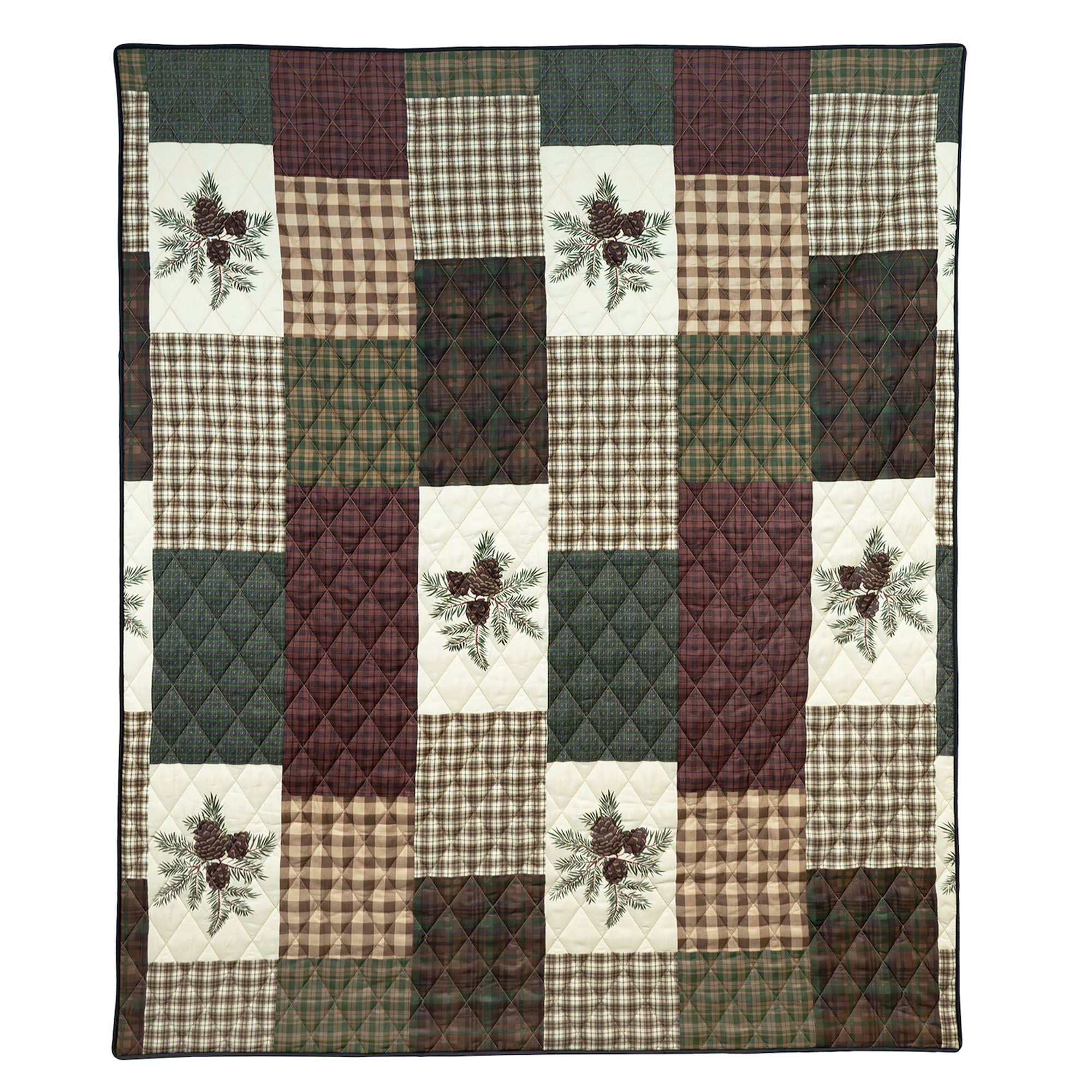 Pine Panels, plaid blocks, and rustic charm combine to create a timeless design from Your Lifestyle(R) by Donna Sharp(R). Adorned with diamond quilting, the printed polyester bedding features various burgundy, brown, green, tan, and ivory plaid blocks alongside solid ivory blocks with pine cones and pine needles. Bound edges finish each quilted element.