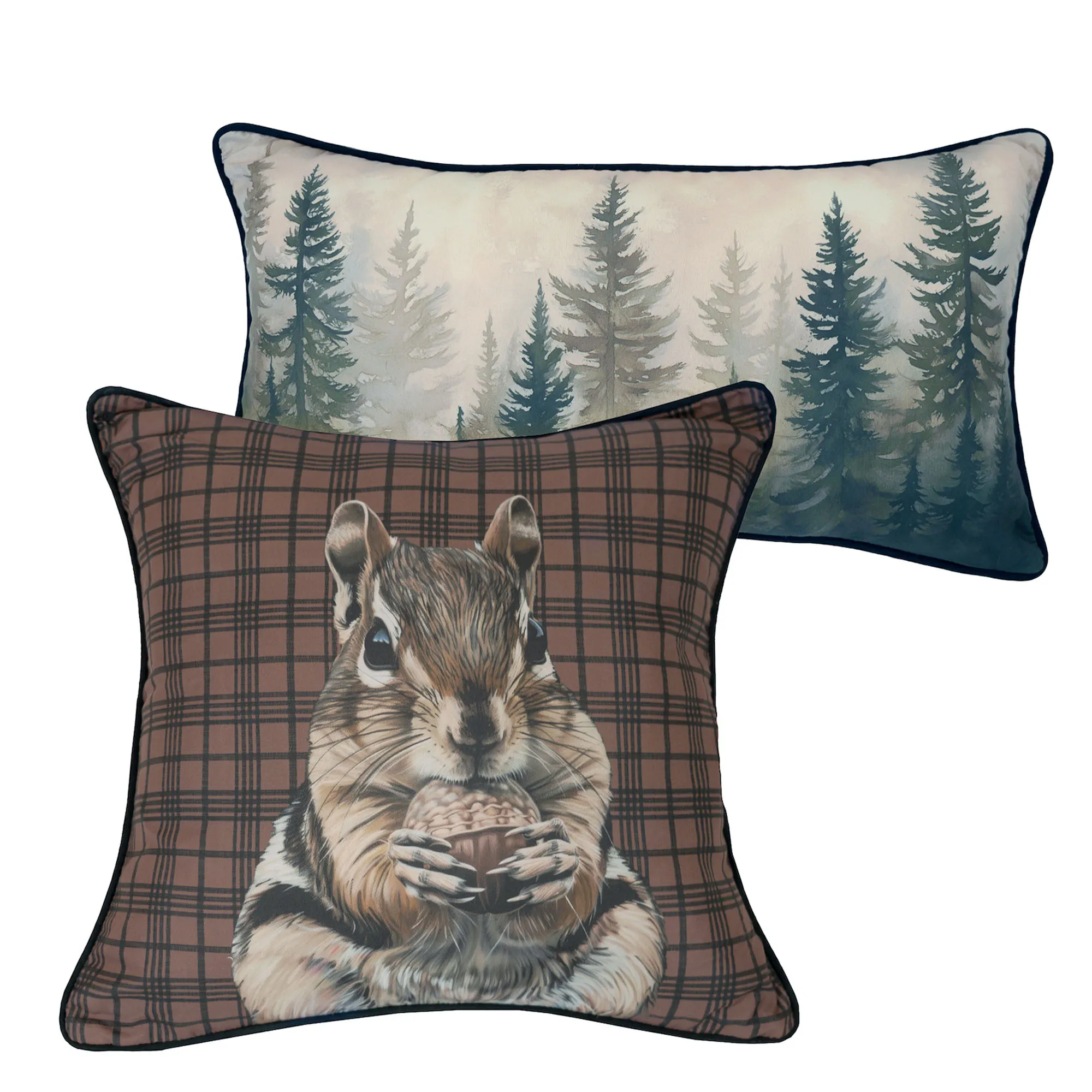 Reversible Pillow Set has printed designs and piped edges; set includes one square pillow and one rectangle pillow. Pillow fill is polyester. Spot clean. Square pillow has a brown, ivory, and black squirrel on a black and brown plaid ground. Rectangle pillow has green-hued pine tree silhouettes on a natural-colored ground.