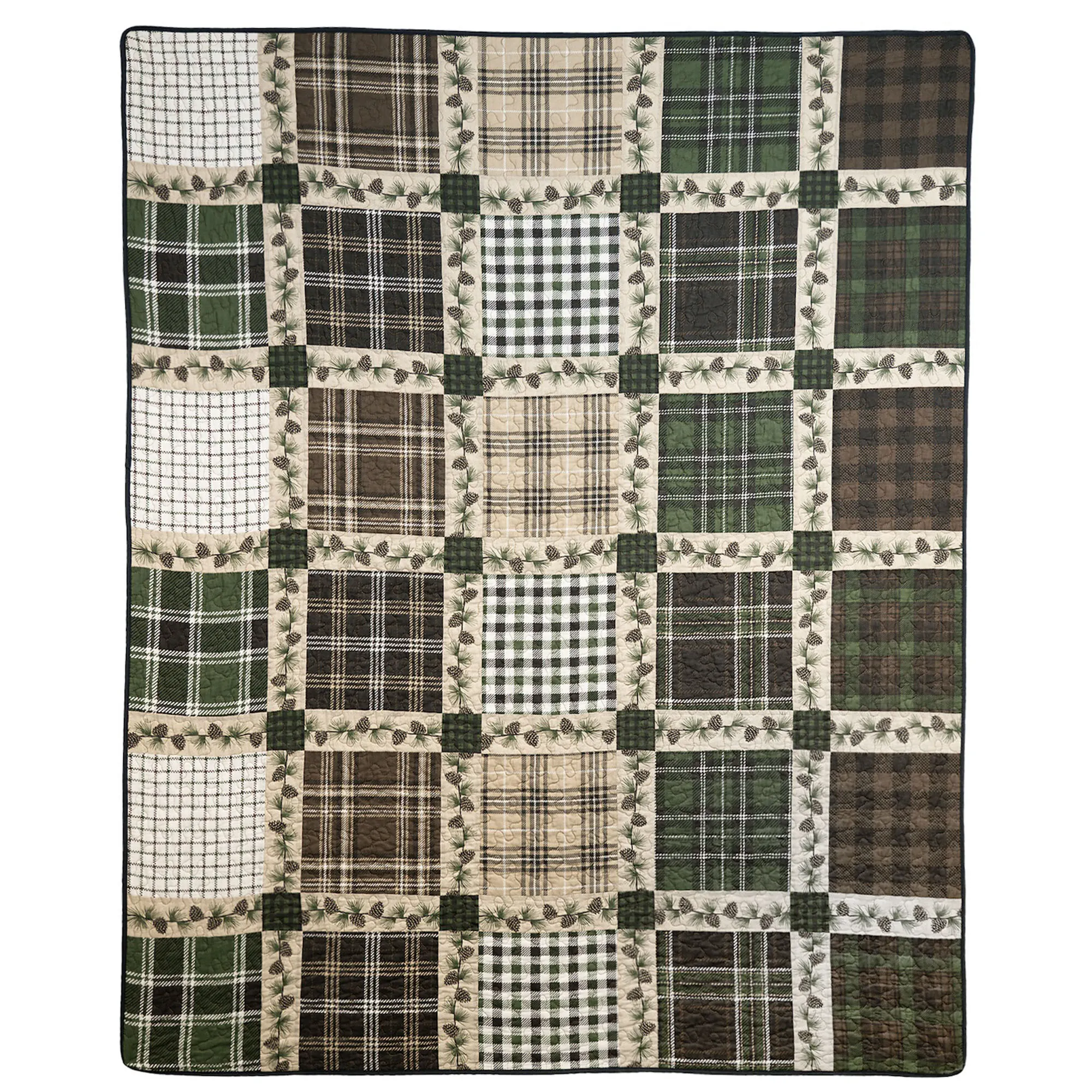 Plaid patterns along with pine cones and greenery create the rustic look of the Pine Patch Bedding. This cotton ensemble, from Your Lifestyle(R) by Donna Sharp(R), features pieced blocks with printed designs. Colors include shades of white, black, dark chocolate, brown, beige, and green.