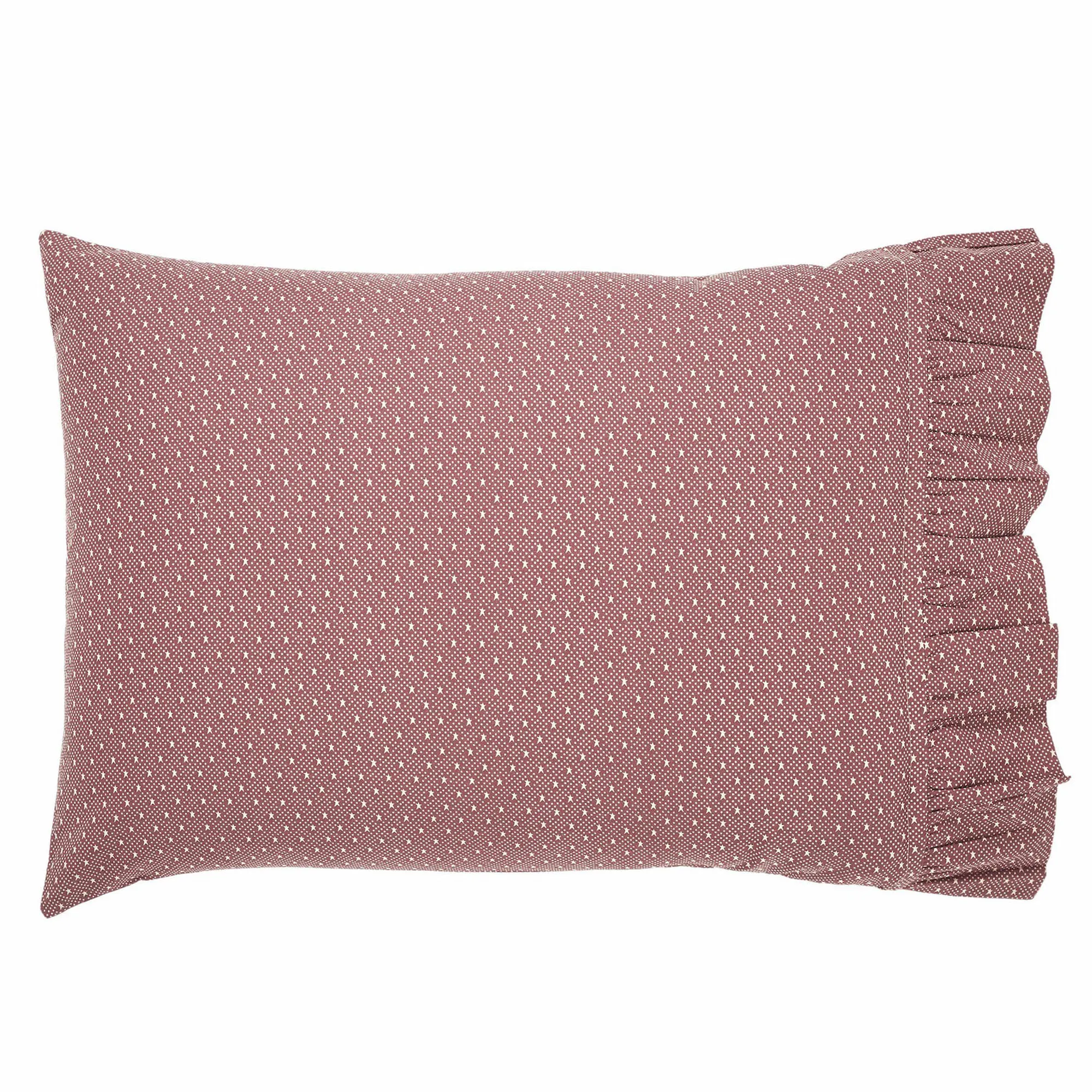 Pillowcase Pair is rich burgundy with ivory stars and a ruffled flange end. Choose Standard Pair or King Pair.