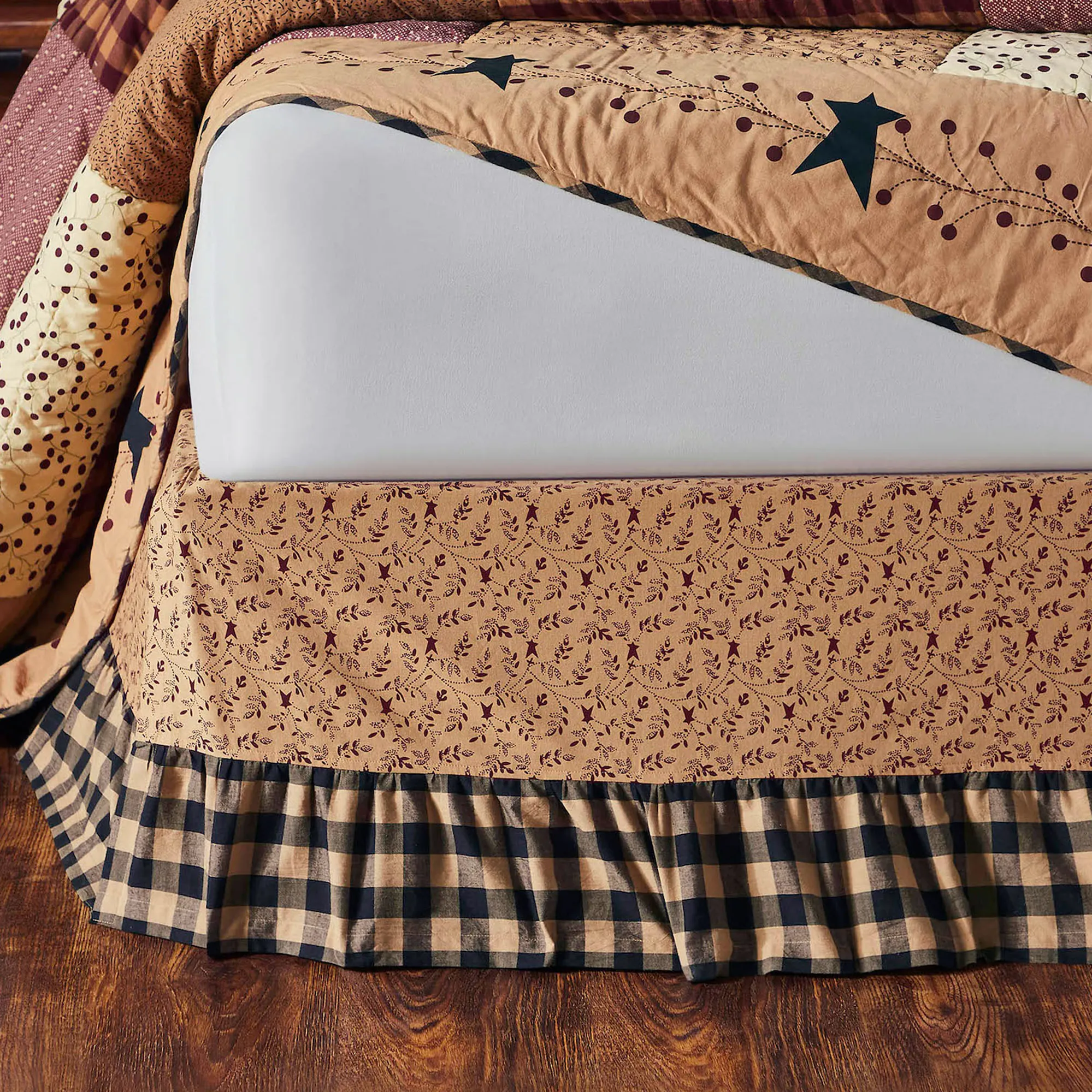 The Bedskirt has a burgundy primitive star and vine print on tan pieced with black and tan plaid to create a gathered 16" drop with split corners. Choose Queen or King.