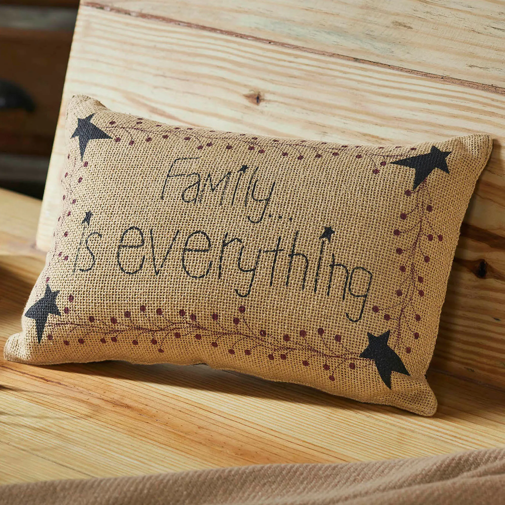 Rectangle Pillow is woven tan printed with "Family is everything" in black framed in primitive stars, a vining berry frame, and tailored edges. Fill is polyester. Spot clean.
