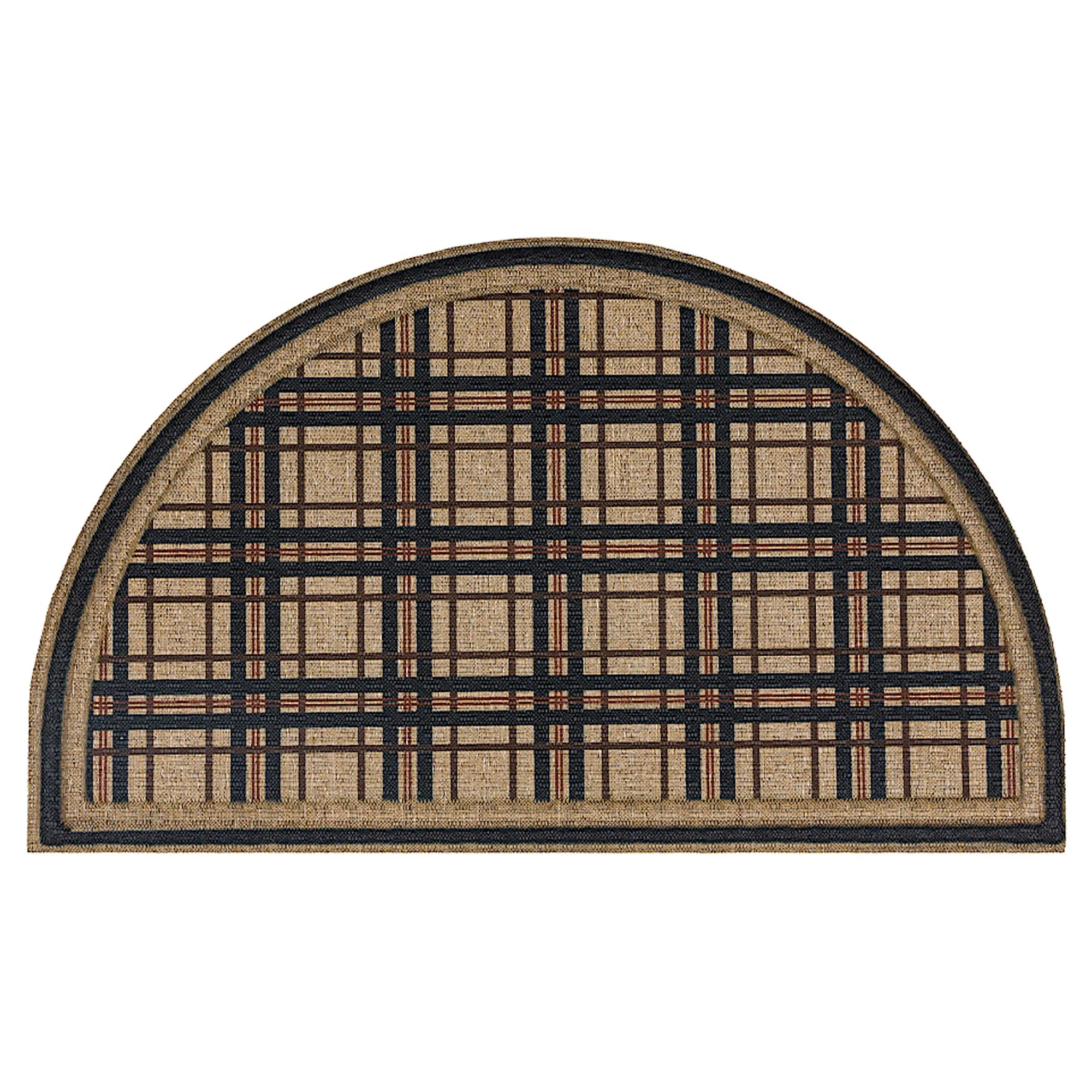 Everyone will enjoy the classic look of the Plaid Ticking Stripe Slice Doormat. Designed to withstand everyday wear, this ultra-durable, low-profile mat, .32" thick, has a polyester surface that provides safe traction underfoot along with a recycled rubber backing to deliver extra grip that minimizes slipping and sliding. The weather- and slip-resistant mat features a plaid print and includes shades of black, brown, burnt orange, and natural. Slice doormat measures 30"x18". May be used indoors or outdoors year round. Shake or rinse with a garden hose to clean.
