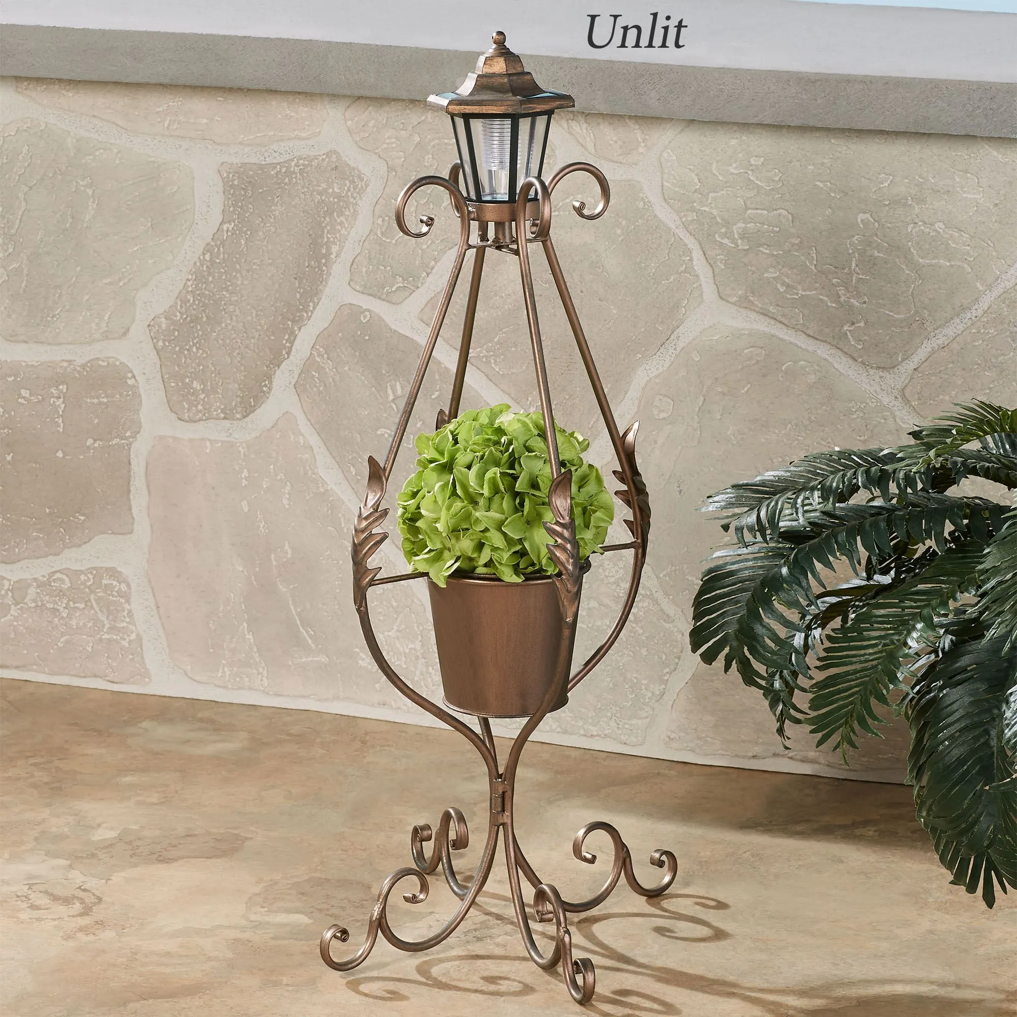 The handcrafted Outdoor Planter with Solar Lantern illuminates any landscape with elegance. Featuring a light copper powder-coat finish, this outdoor accent piece combines functionality with aesthetic appeal through its intricate scrolling design and acanthus leaf embellishments. The solar lantern offers ambient lighting after charging in sunlight, creating a captivating evening glow. A removable pot, nestled within the stand, awaits the addition of your chosen flora. Ideal for year-round outdoor embellishment, this metal plant stand with lantern enriches garden spaces with a touch of sophistication and renewable illumination.