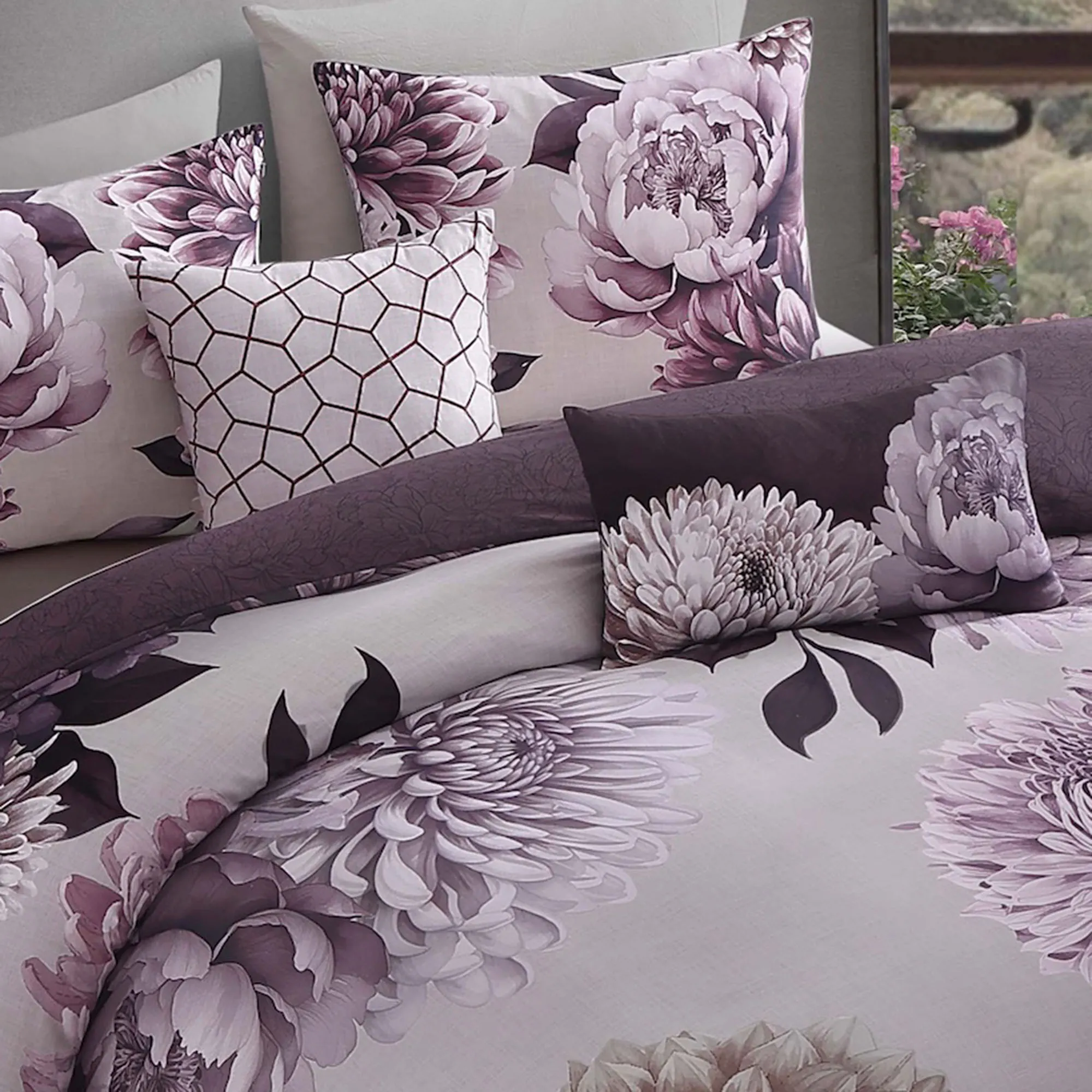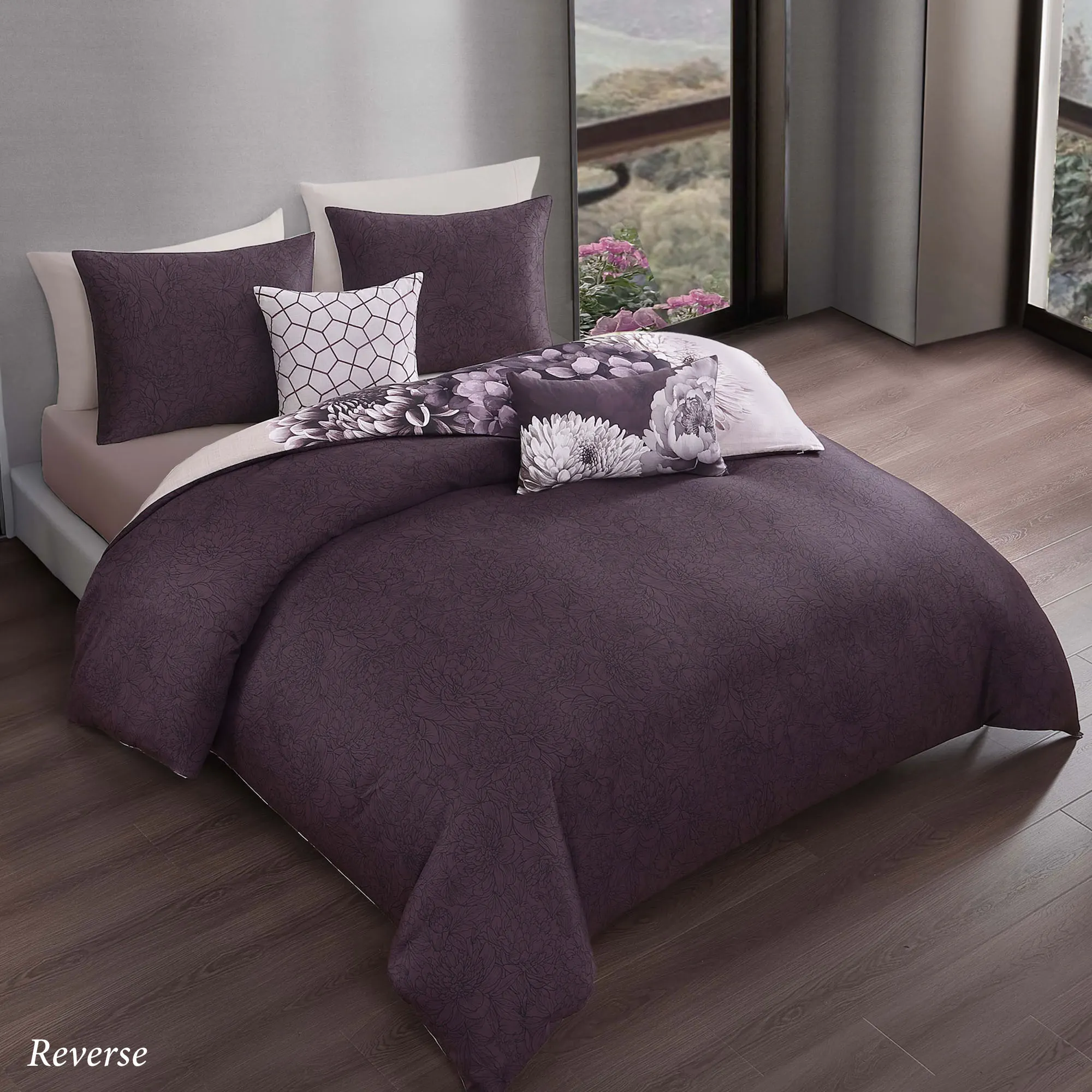 • Comforter and shams reverse to plum floral outlines