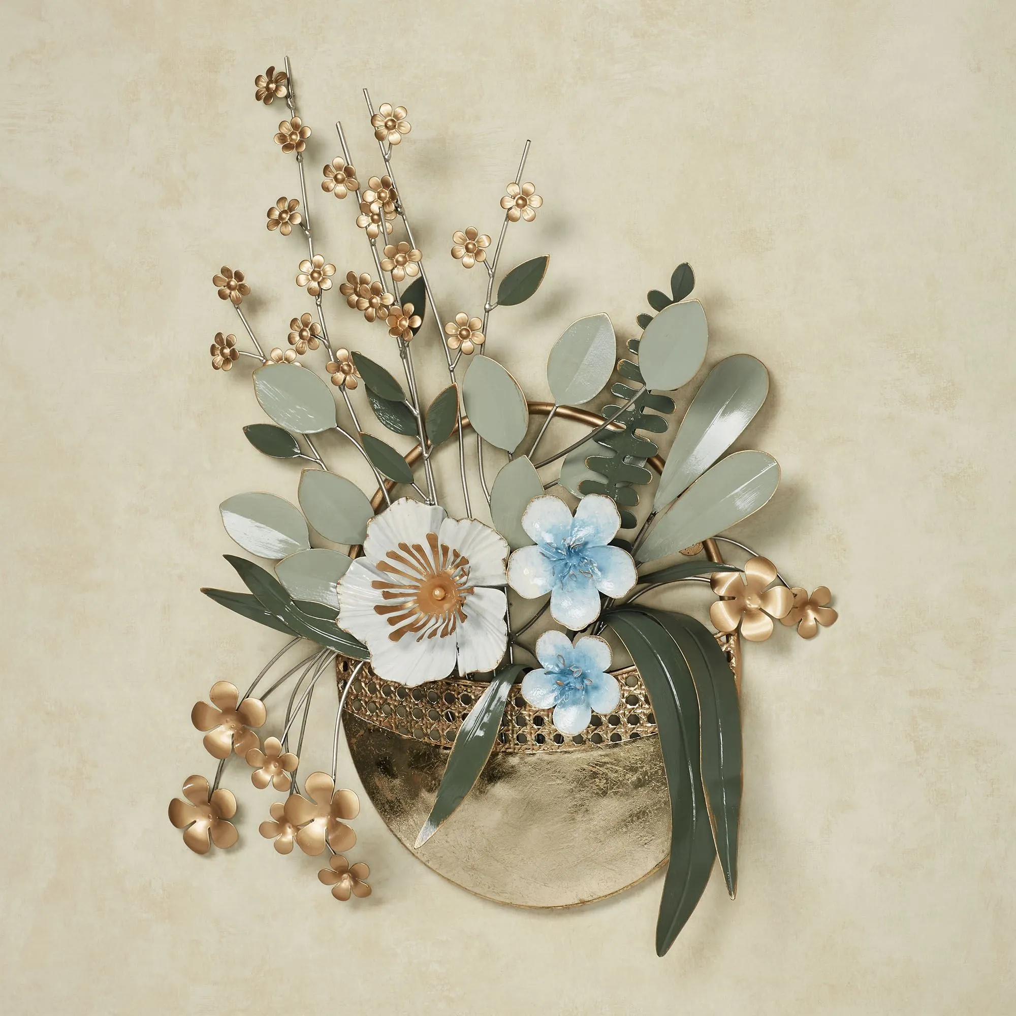 A Pocket of Posies blooms with splendor from your wall. Crafted from metal, the wall art features a metallic gold foil pocket stuffed with beautiful foliage and blossoming flowers. Handpainted hues of green, gold, ivory, and blue bring the design to life. Floral wall art measures 18"Wx3"Dx24"H.