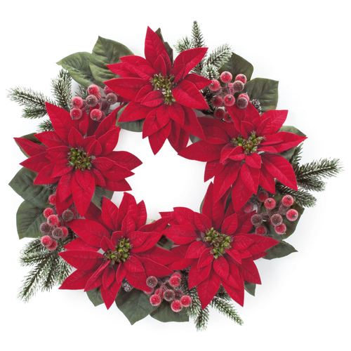 Robust Christmas hues blossom from the Poinsettia and Berry Wreath. Crafted from polyester faux greenery, the winter wreath features blooming red poinsettia flowers, icy berries, iced pine boughs, pine cones, and leaves. Indoor use only. This item will need to be fluffed upon arrival. Overall, the Christmas wreath measures approx. 23"dia.x5"D.