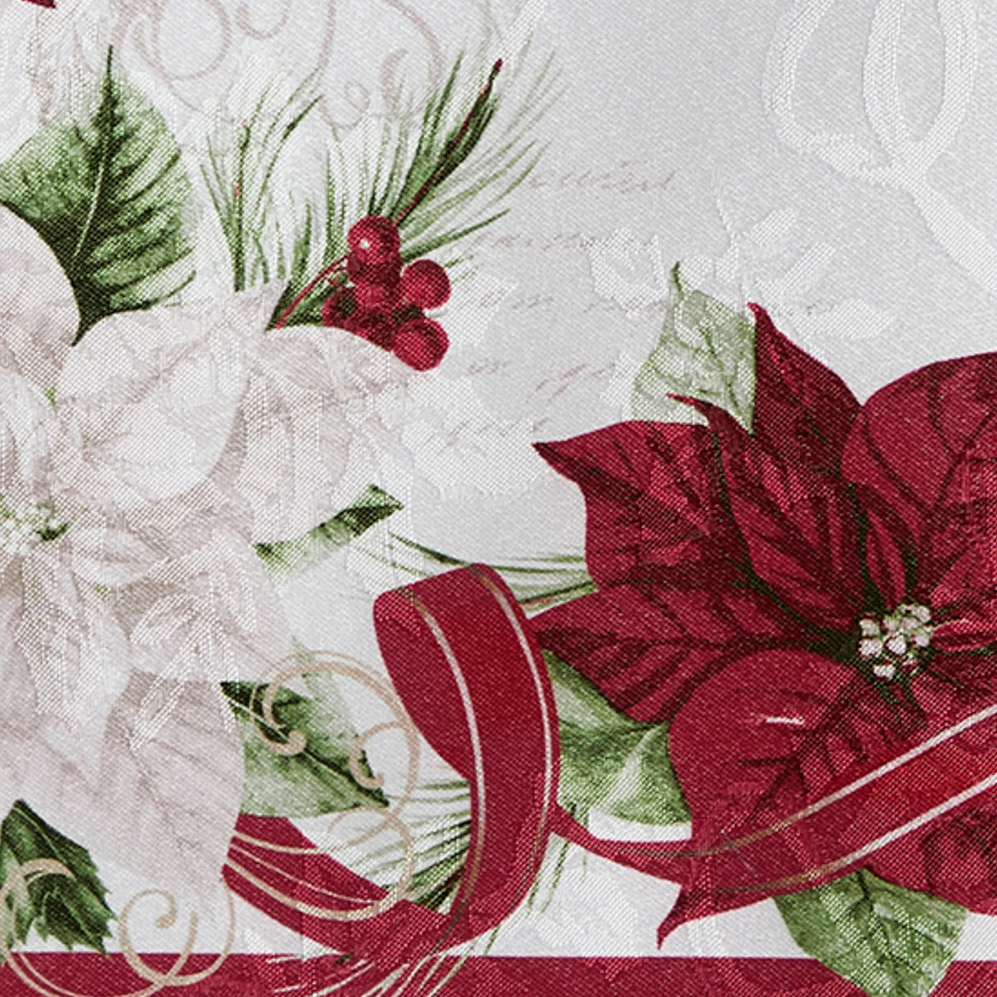 Let Poinsettias Bloom during the festive holiday season. These tailored polyester table linens have printed poinsettia flowers, holly leaves, pine greenery, berries, ribbons, and gold script on a white damask background. Colors include red, green, and gold. Choose Round Tablecloth, Rectangle Tablecloth, Table Runner, Placemat Set of 4, or Napkin Set of 4. Machine washable. Imported.