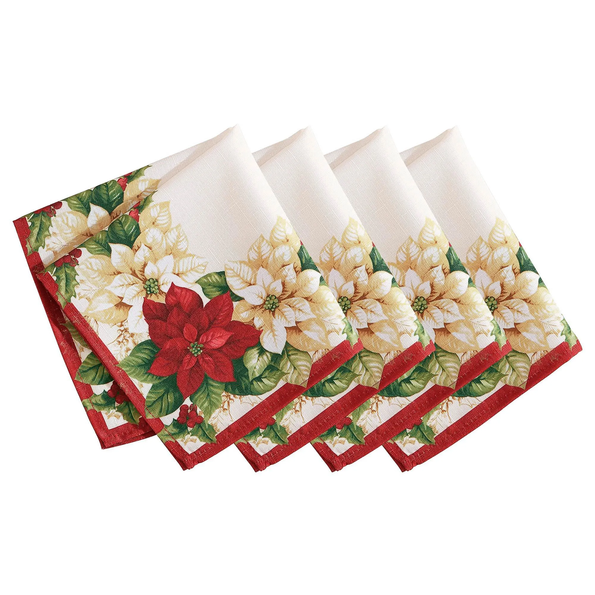 Red and white flower bouquets display sophisticated Poinsettia Elegance at any holiday dining table. The tailored polyester table linens feature vibrant poinsettia flowers along with green leaves, berries, and touches of gold. Choose Round Tablecloth, Rectangle Tablecloth, Oval Tablecloth, Placemat Set of 4, or Napkin Set of 4. Machine washable. Imported.