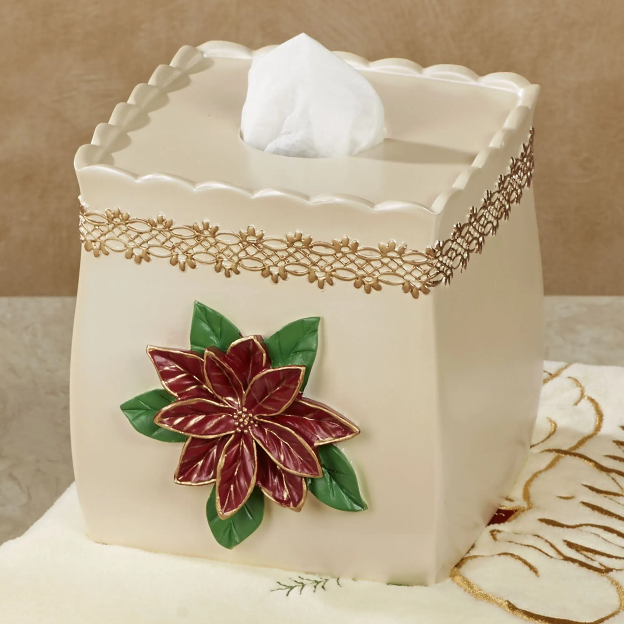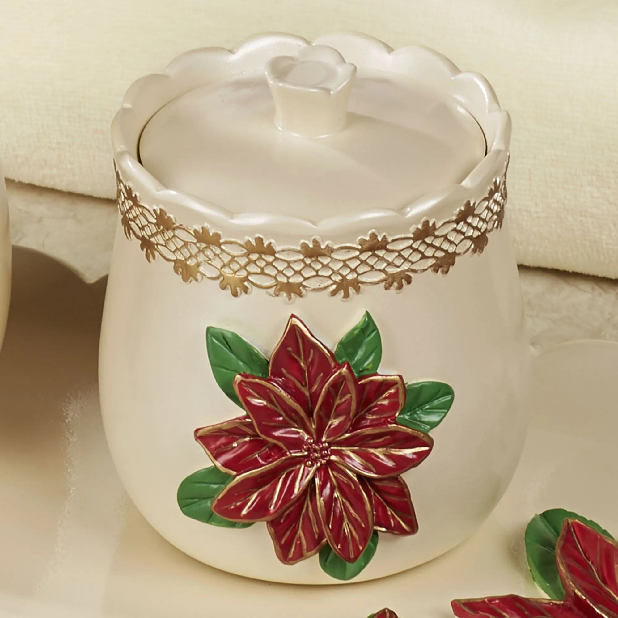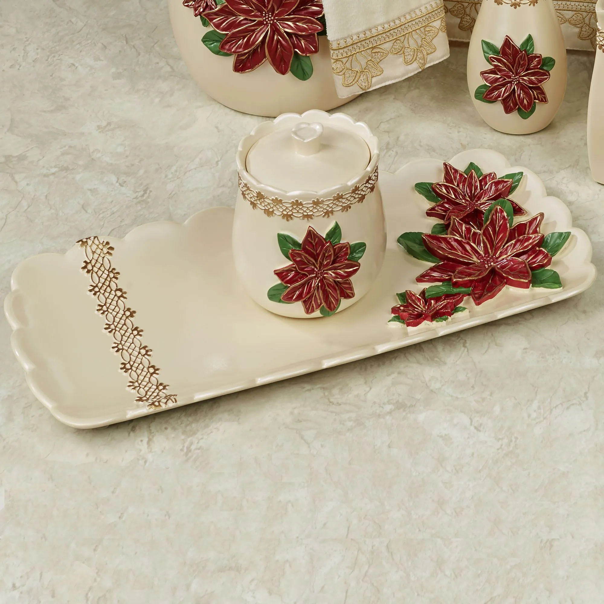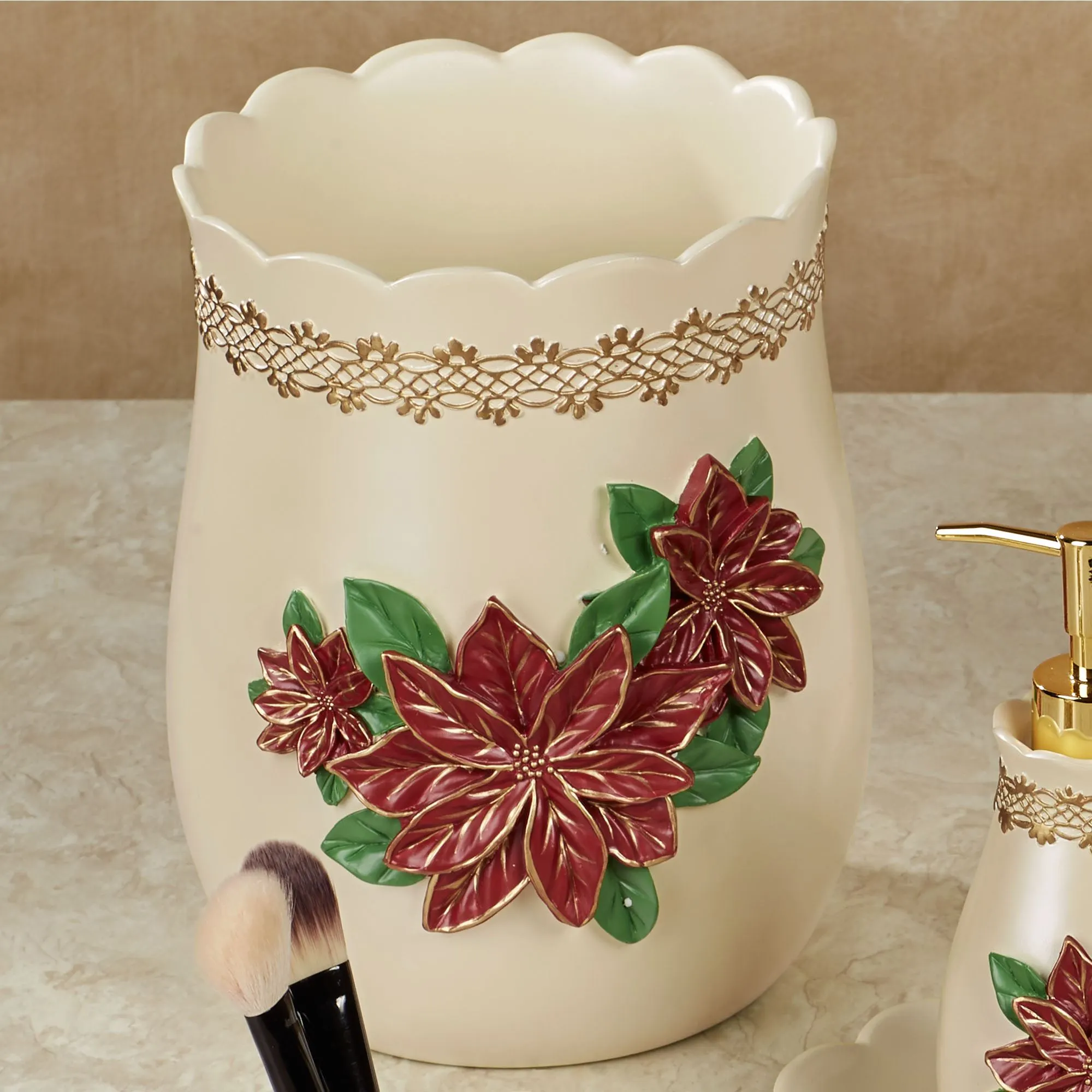 Burgundy blossoms embellished with gold exude Poinsettia Grace upon these holiday bath accessories. With a shaped design, these light cream resin bath accents feature scalloped edges, dimensional lace-like golden trim, and large poinsettias with green leaves. Specify Brush Holder, Covered Jar, Lotion/Soap Dispenser, Tissue Cover, Tray, or Wastebasket.