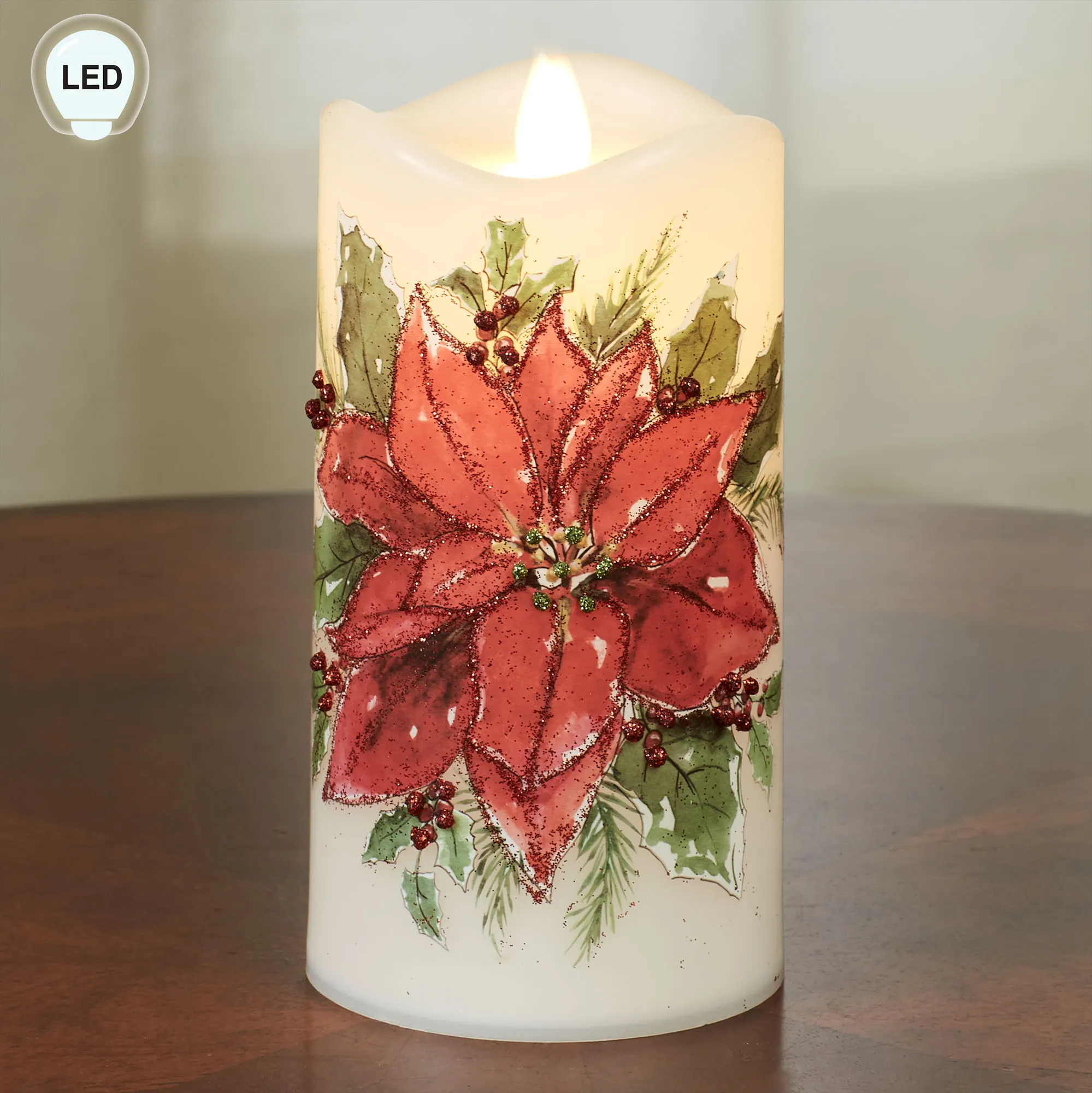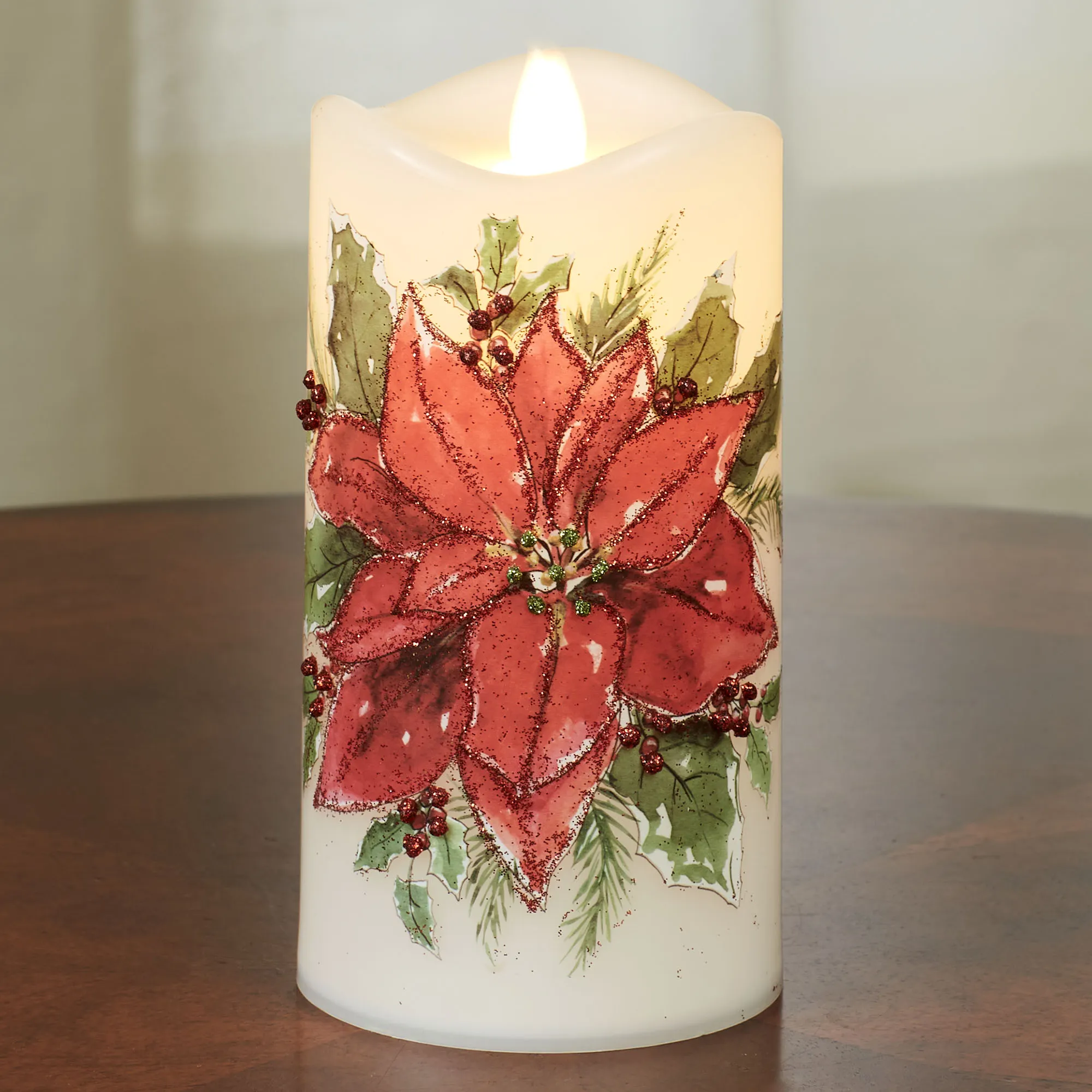 The Poinsettia LED Holiday Candle looks pretty. Made of molded plastic, this flameless LED candle features a decal design with a red poinsettia, leaves, red glitter outlines, and dimensional detailing. The candle has a wavy top and a flicker flame effect. Requires your three AAA batteries. The on/off/six-hour timer switch is located on the bottom. Measures 3"dia.x6"H.