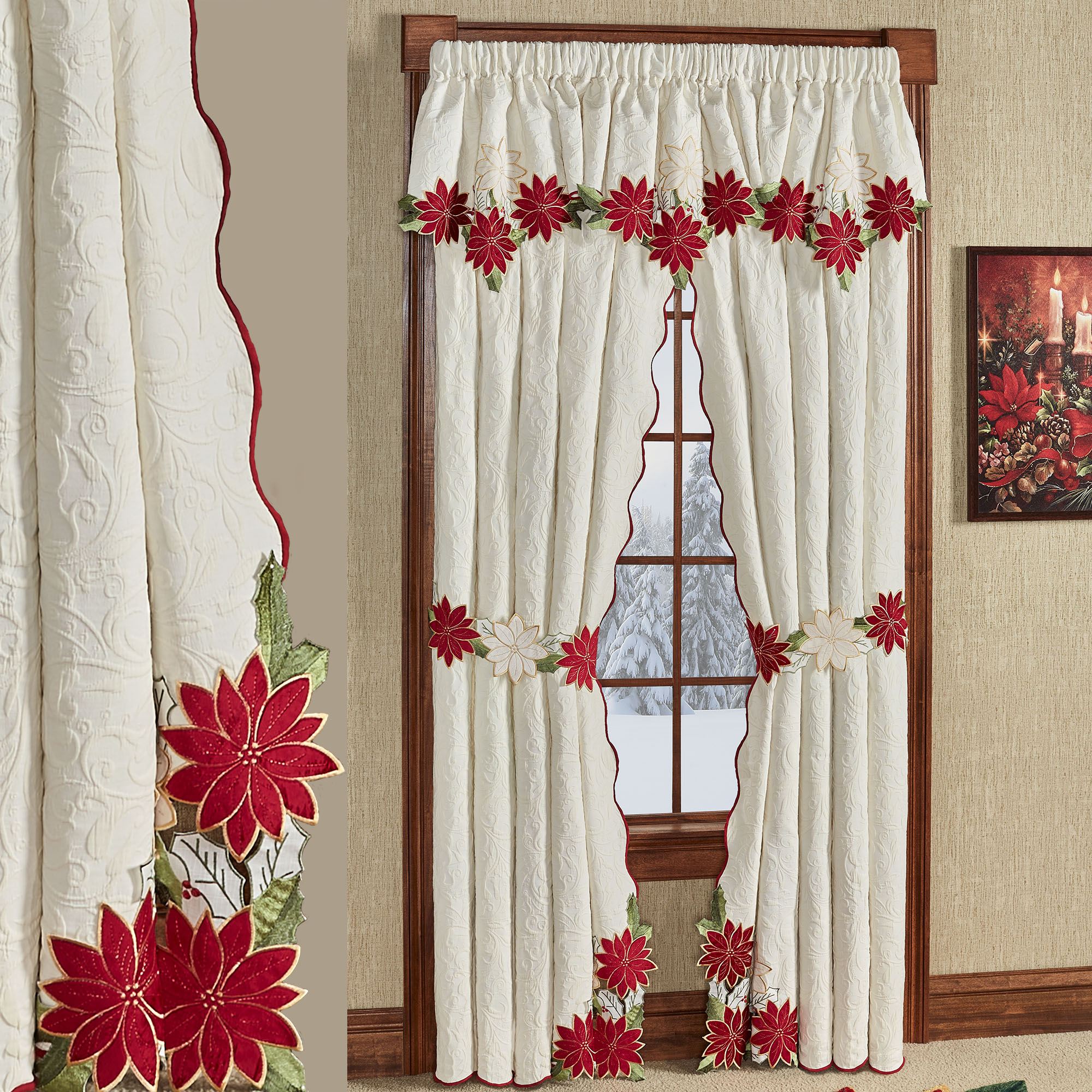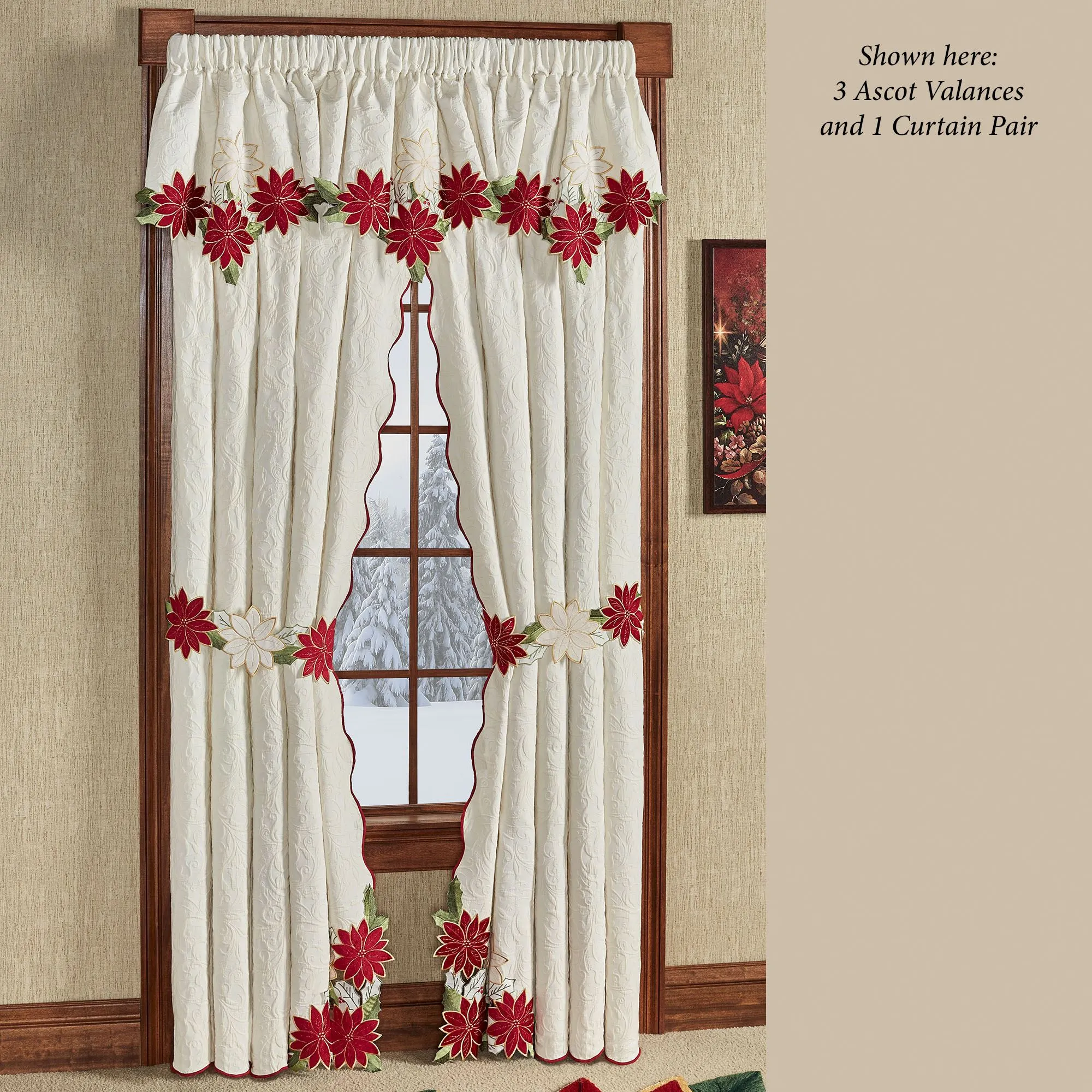 Pretty Poinsettia flowers blossom with festive grandeur upon this holiday window treatment. The cotton/polyester woven matelasse window treatment features velvet poinsettia appliques, embroidery, and woven scrolls on light cream. The scalloped edges are accented with dark red stitching. Accent colors include shades of ivory, dark red, champagne, and green. Rod pockets are 3". Specify Ascot Valance or Curtain Pair. Each Ascot Valance has scalloped bottom edges. The Curtain Pair has scalloped inside and bottom edges and includes tiebacks. Machine washable. Imported. The curtain pair width is the total width of two panels together.