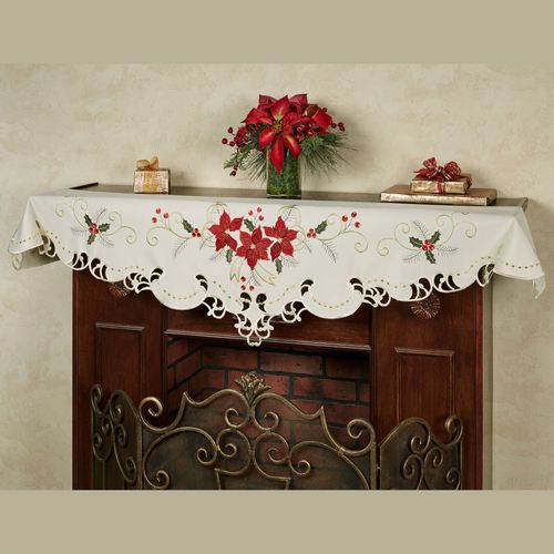 Elegantly transform any space into a Poinsettia Palace with this lavishly festive holiday mantel scarf. The light cream, polyester faux silk mantel scarf has contour-cut edges and features embroidered poinsettias, green holly leaves, red berries, pine sprigs, and gold ribbon motifs. Measures 72"x22". Machine washable. Imported.