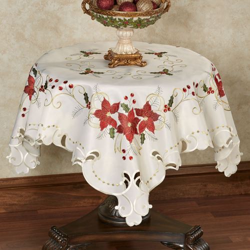 Transform your space into a Poinsettia Palace with this lavishly festive table topper. The polyester faux silk table accent features embroidered elegant red poinsettia blossoms, green holly leaves, berries, pine sprigs, and golden ribbon motifs on light cream. Holiday table topper has a cutwork style with openwork scroll edges. Measures 42" sq. Machine washable. Imported.
