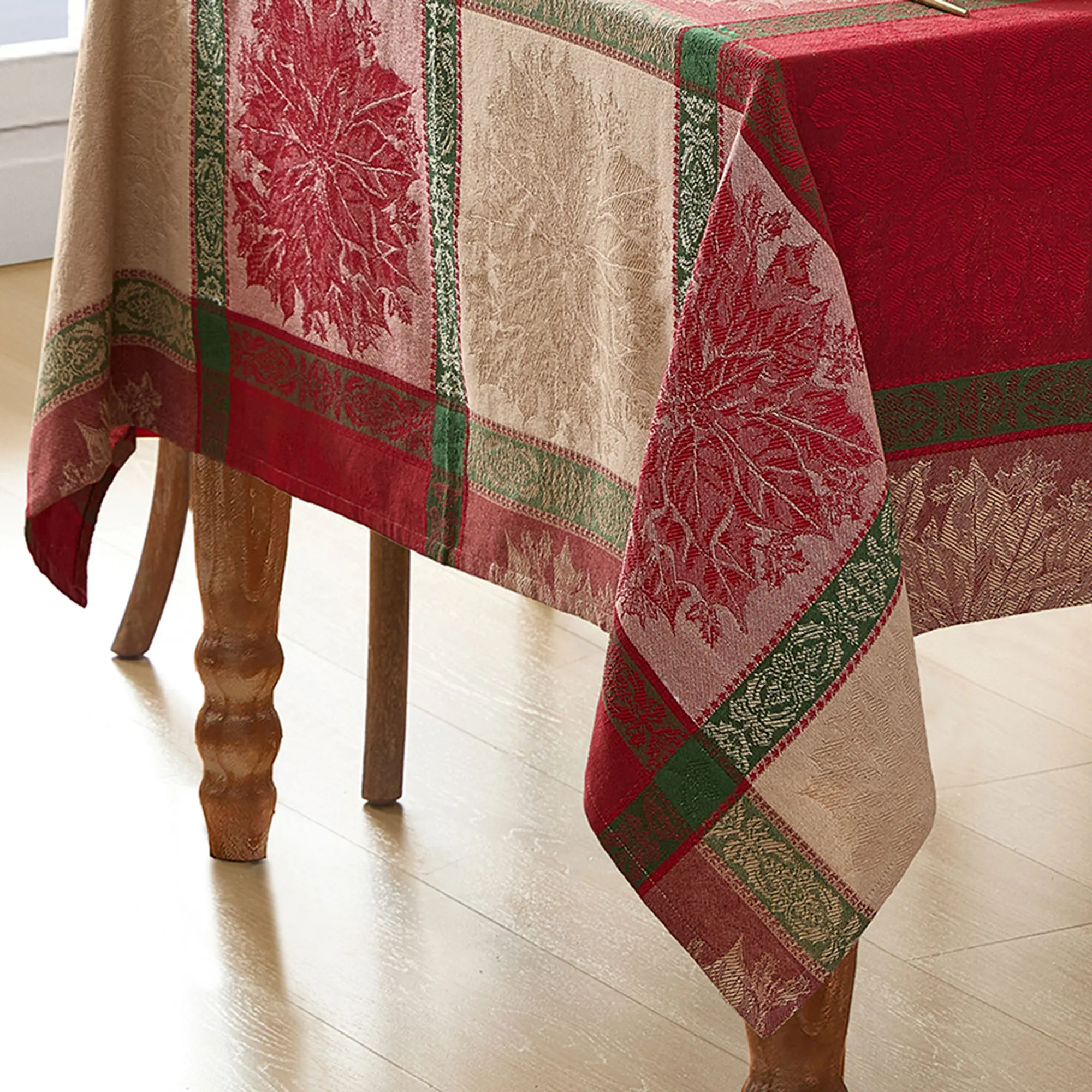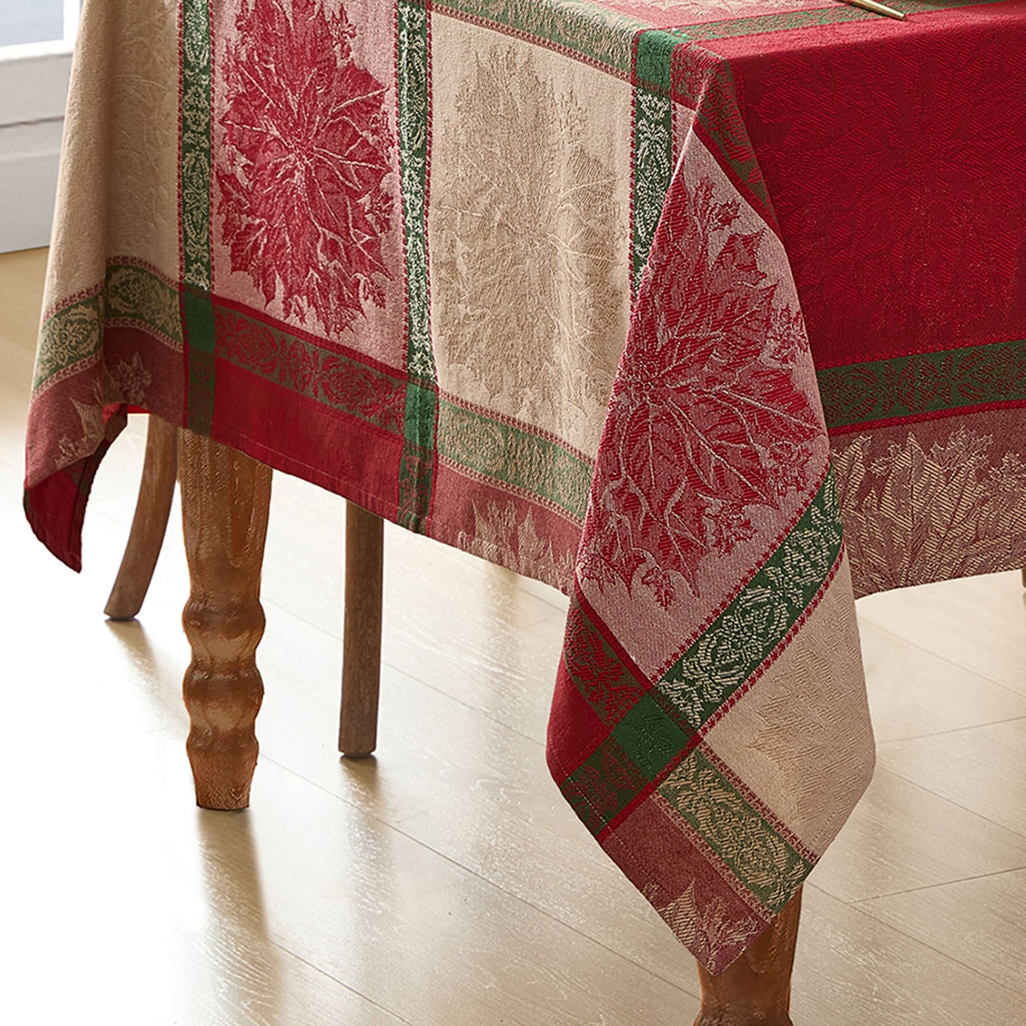 The Poinsettia Plaid Tabletop Accessories are cotton jacquard. Imported.