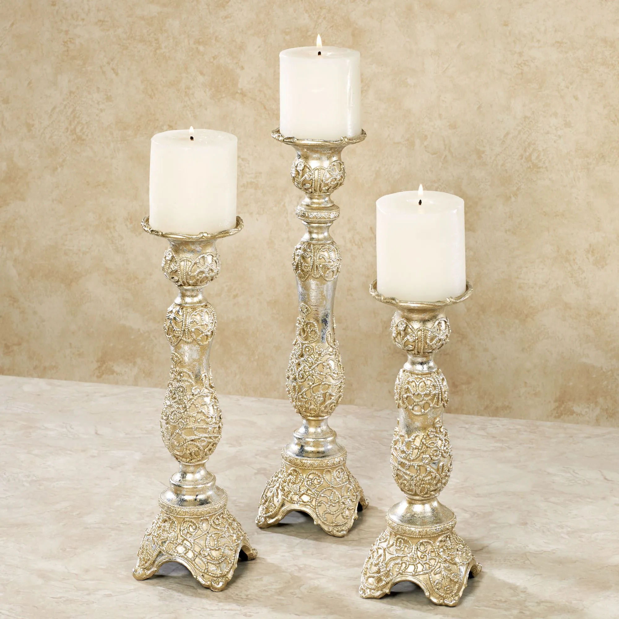 The exquisite designs on the Polianna Candleholder Set make any space look stunning. Resin candleholders have a champagne gold and silver leaf finish with a textured, embossed design. Each 3.5" dia. candleholder will hold your candle up to 3" dia. Small is 10"H; medium is 12"H; large is 14"H.