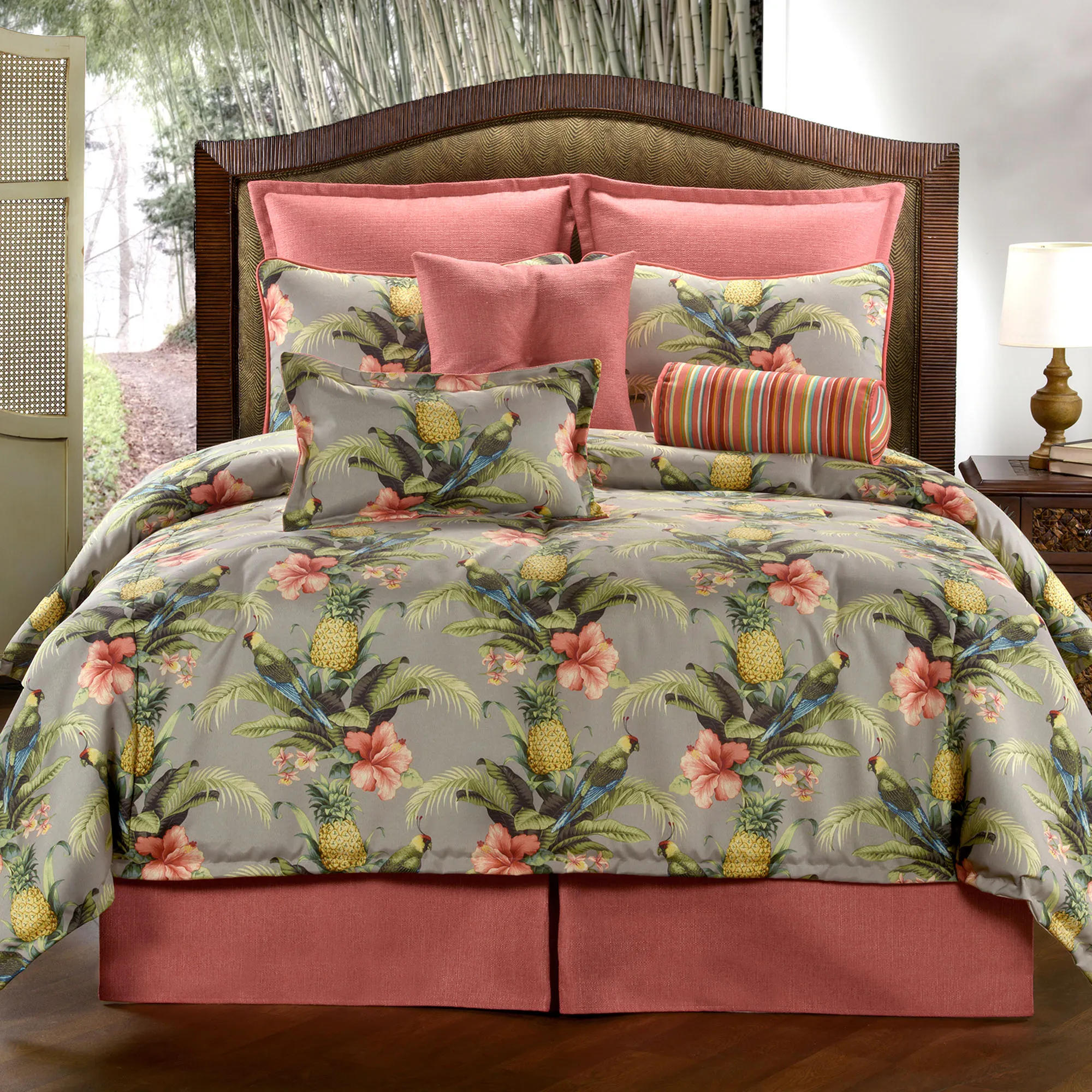 The Polly Island Tropical Comforter Set includes a comforter, bedskirt, and sham(s). Oversized comforter fits mattresses up to 15". Comforter features a tropical floral, leaf, parrot, and pineapple print on a woven eucalyptus polyester ground with coral piping. Comforter is backed in solid eggshell cotton; fill is polyester. The 15" drop bedskirt is woven dark coral with kick pleats and split corners. Sham(s) mimic the comforter face trimmed in coral piping; French back closure. For comforter set, choose Twin, Full, Queen, King, or Cal King.