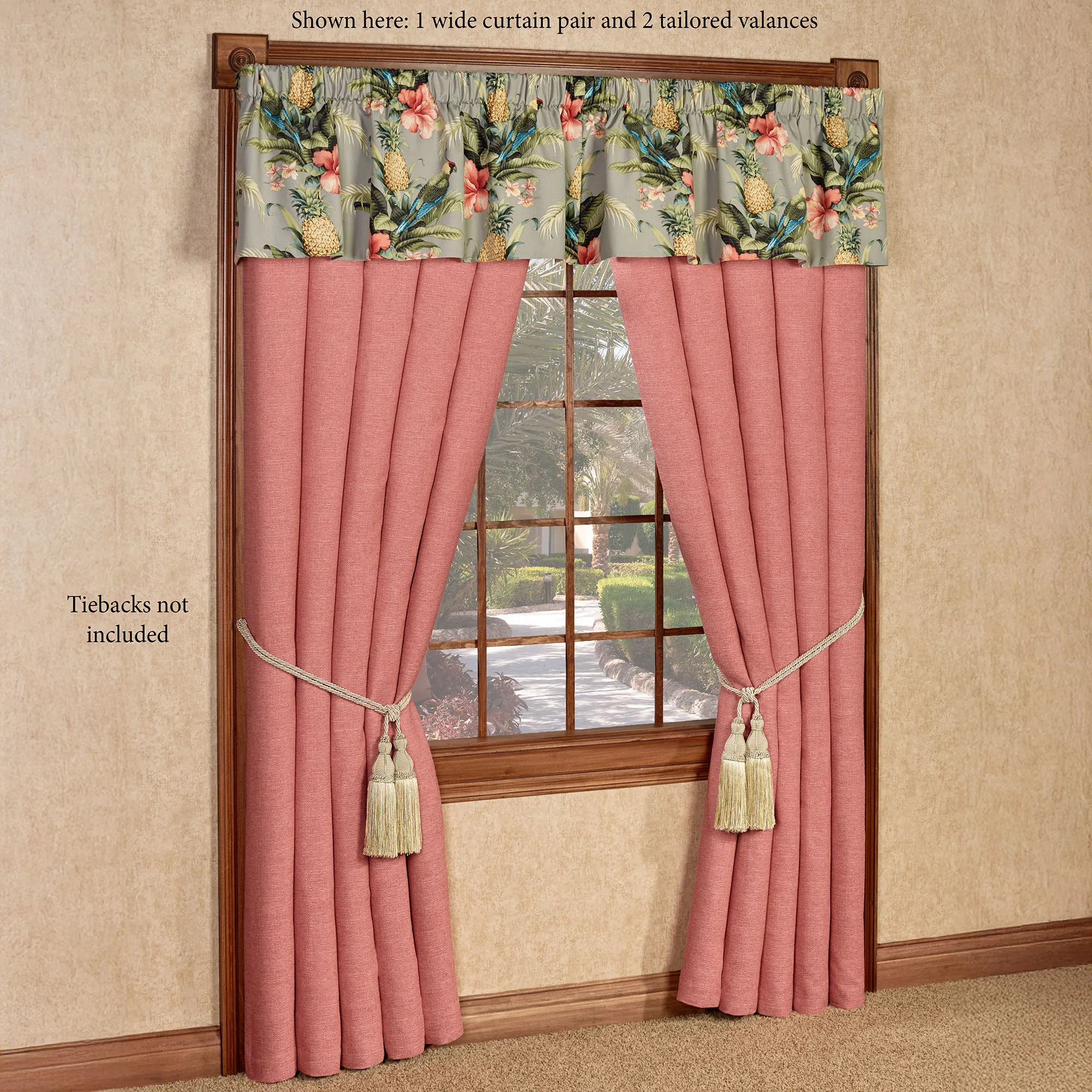 Lined Window Treatments have 3" rod pockets. Wide Curtains are woven solid dark coral with tailored edges; tiebacks are not included. Shaped Valance mimics the comforter face with a piped edge. Tailored Valance mimics the comforter face.