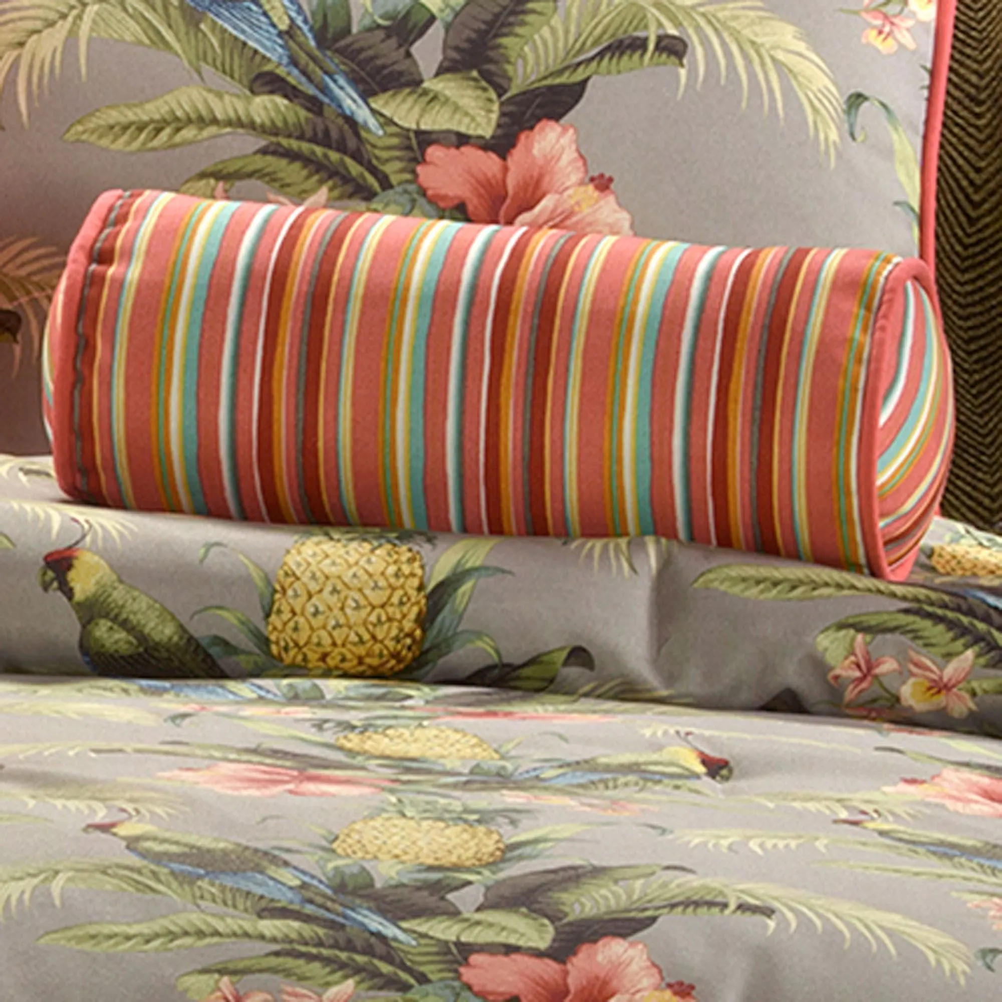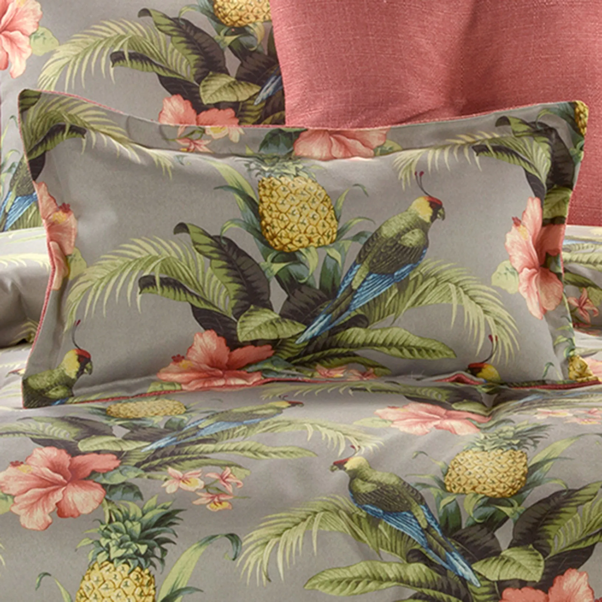 Turn in for the night and be whisked away to Polly Island, a true paradise waiting in your dreams. A truly lovely getaway, the tropical isle contains lush green fronds, ripe golden yellow pineapples, blossoming coral hibiscus, and native bright parrots. Proudly made in the USA, this tropical bedding ensemble pulls upon these exotic delights in bold dark coral, harvest gold, sapphire, French blue, and red hues on eucalyptus polyester grounds to transport your dreams nightly.