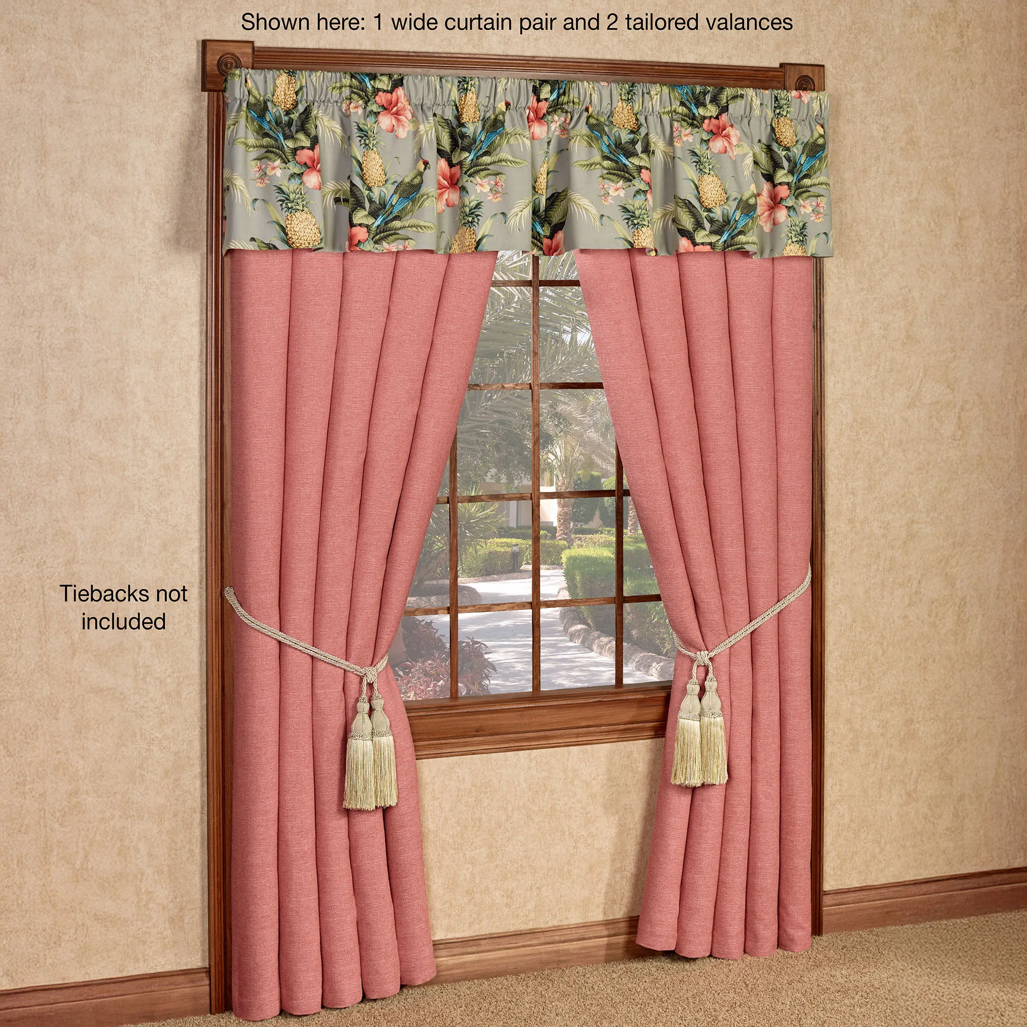 Be whisked away to Polly Island with this tropical window treatment. Specify Wide Curtain Pair, Shaped Valance, or Tailored Valance. Wide Curtains are woven solid dark coral with tailored edges; tiebacks are not included. Valances feature a tropical floral, leaf, parrot, and pineapple print on a woven eucalyptus ground. Accent colors include bold dark coral, golden yellow, harvest gold, sapphire, French blue, green, and red. Shaped Valance has a piped edge. Lined, polyester window treatments have 3" rod pockets. Dry clean only. The curtain pair width is the total width of two panels together.