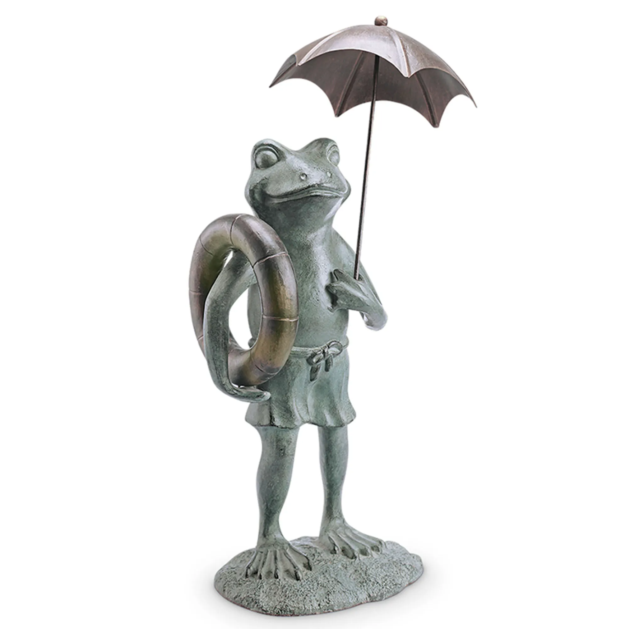 This darling frog is in search of a Pool Partner that's up for a swim even in the rain. Hand-cast from aluminum, the hand-rubbed verdi green frog wears swim trunks and is ready for a dip with his bronze pool floatie and umbrella. Perfect indoors or outdoors year round, the charming frog garden sculpture measures 12.5"Wx8.5"Dx24.5"H.