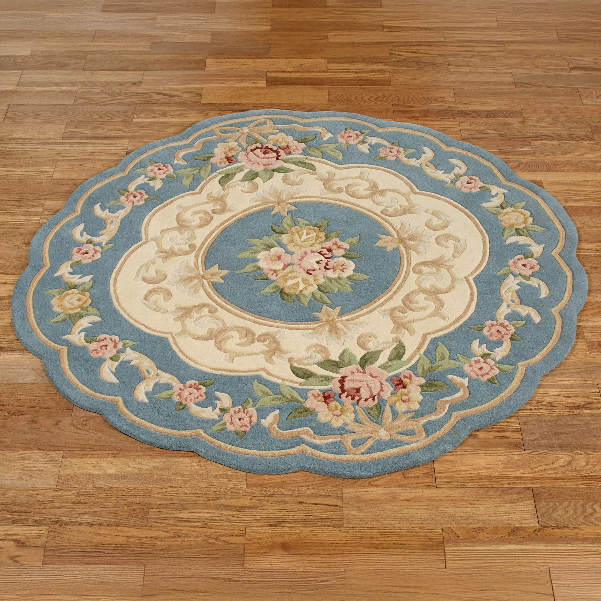 Vines, blooming flowers, and leafy scrolls blossom on the Portia Rose Sapphire Aubusson Rugs. These handcrafted and hand-tufted pure wool rugs, .5" thick, have a handcarved rose Aubusson design. Common colors include shades of rose, gold, green, and champagne; center and outer border are sapphire. Runner has sculpted corners; round rug is scalloped. Backs are cloth-covered latex. We recommend professional cleaning by a rug cleaner. Imported.