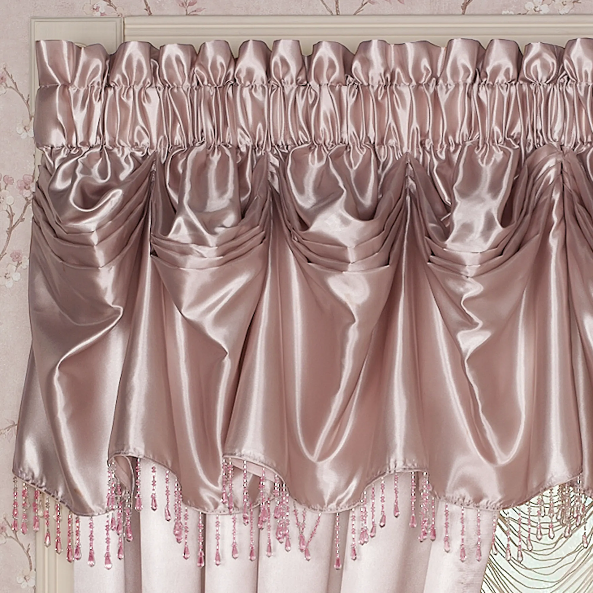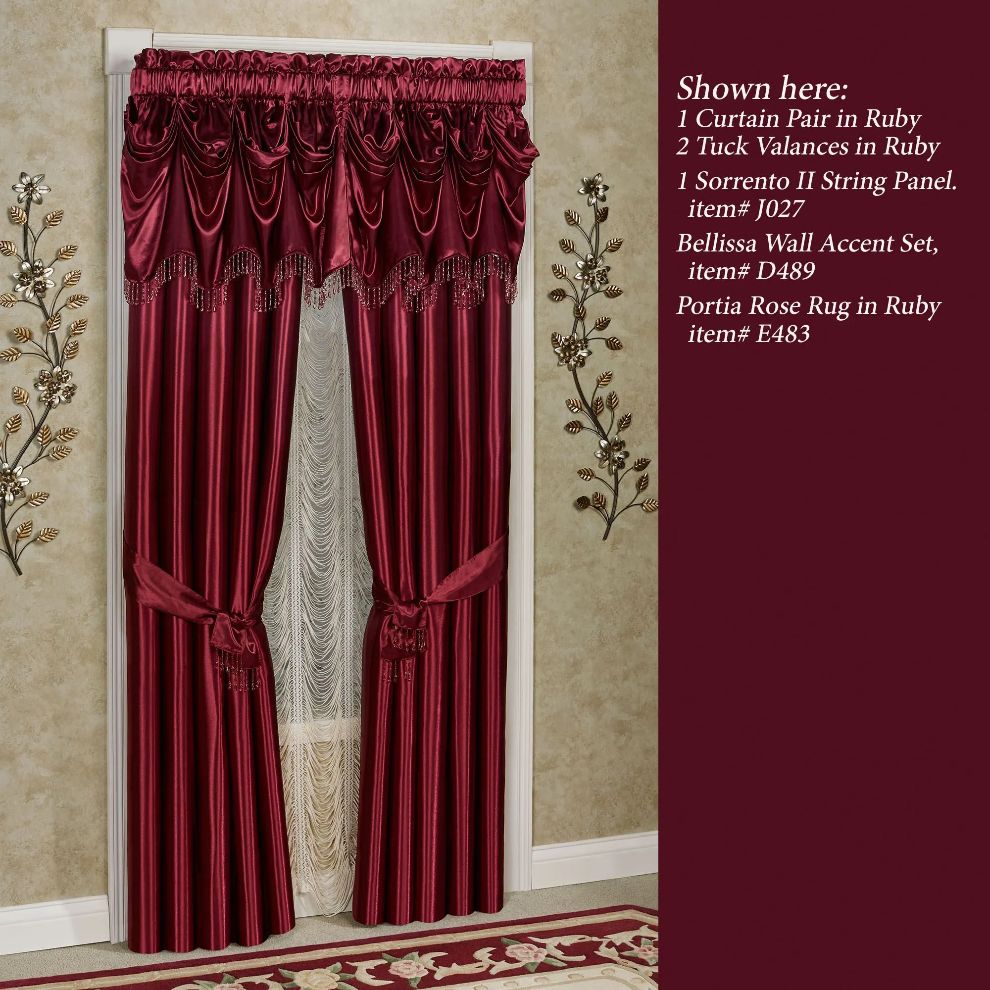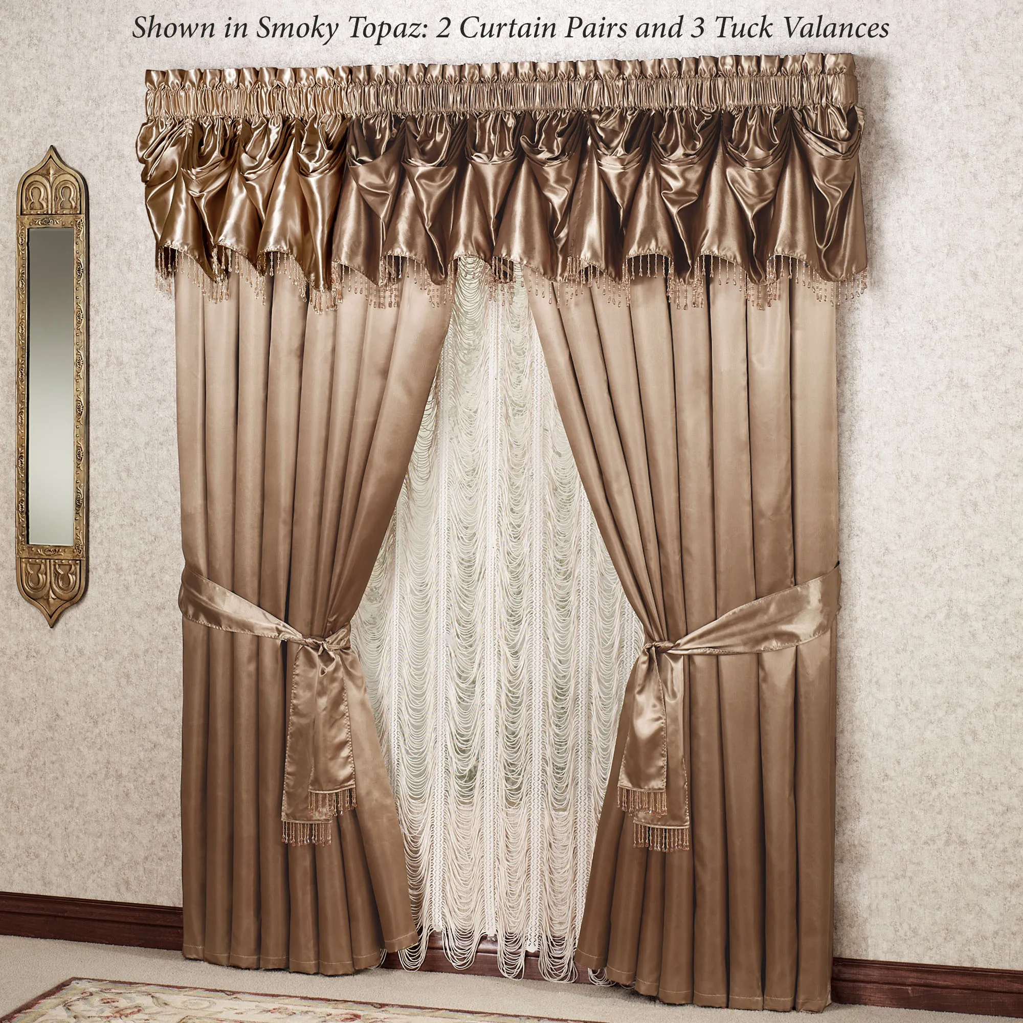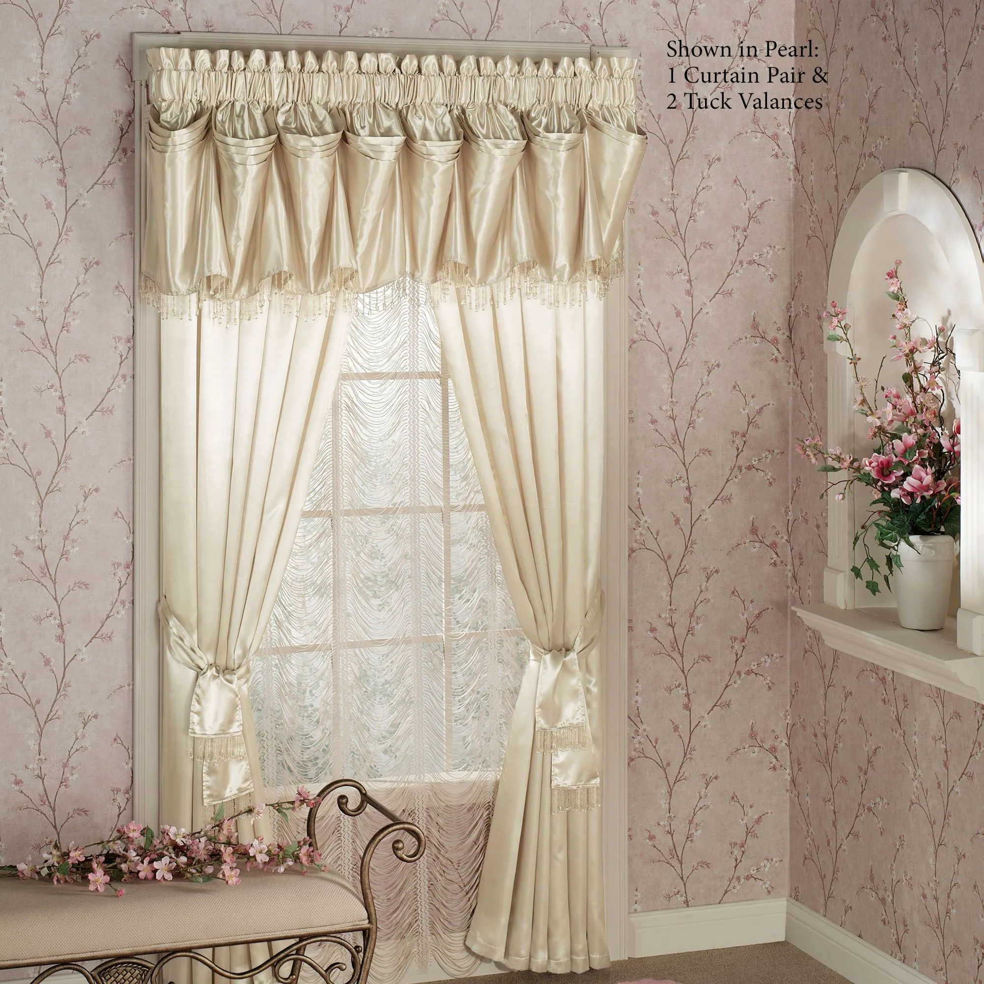The polyester satin Portia II Window Treatment brings to mind wistful visions of French cafes and grand ballrooms. Specify Tuck Valance or Wide Curtain Pair. Tuck Valance has beaded trim. Tailored, lined Wide Curtains include sash tiebacks with beaded fringe. Specify Smoky Topaz, Pearl, Rose Quartz, Ruby, or Sapphire. Window treatment has 2.5" rod pockets. Machine wash. Imported. The curtain pair width is the total width of two panels together.