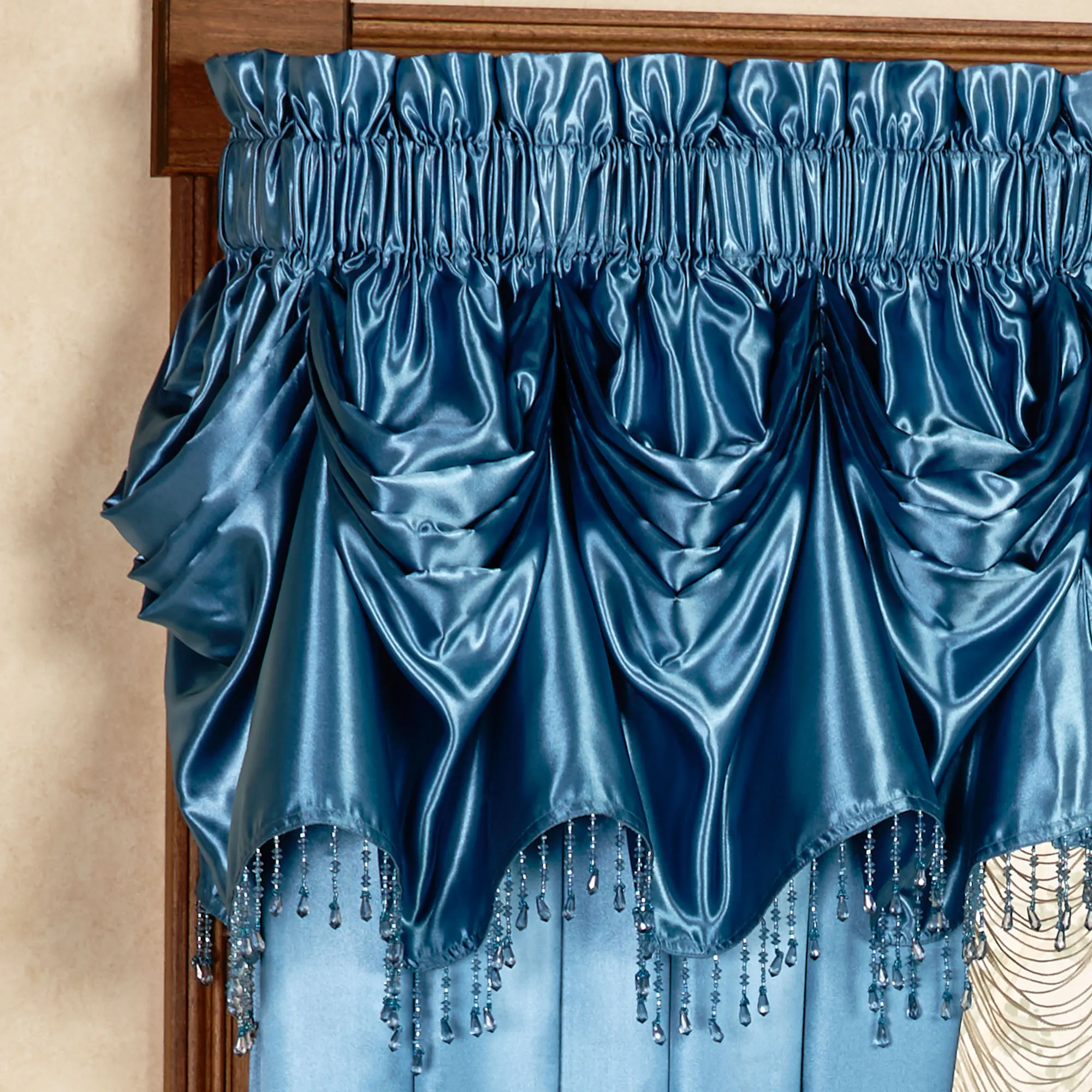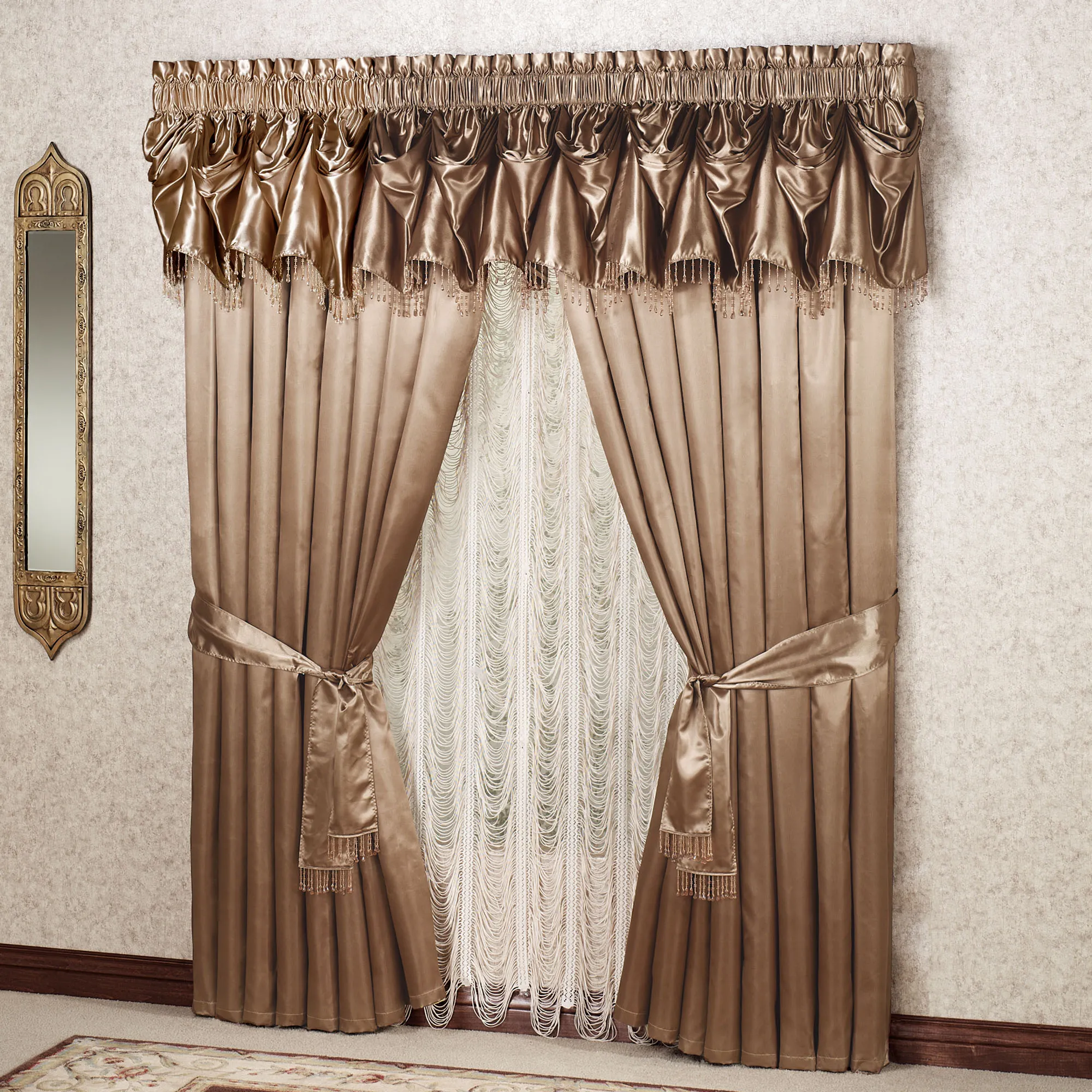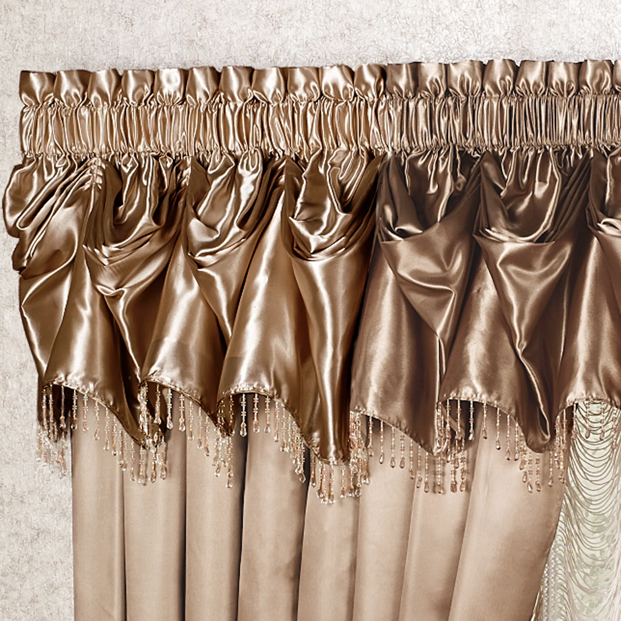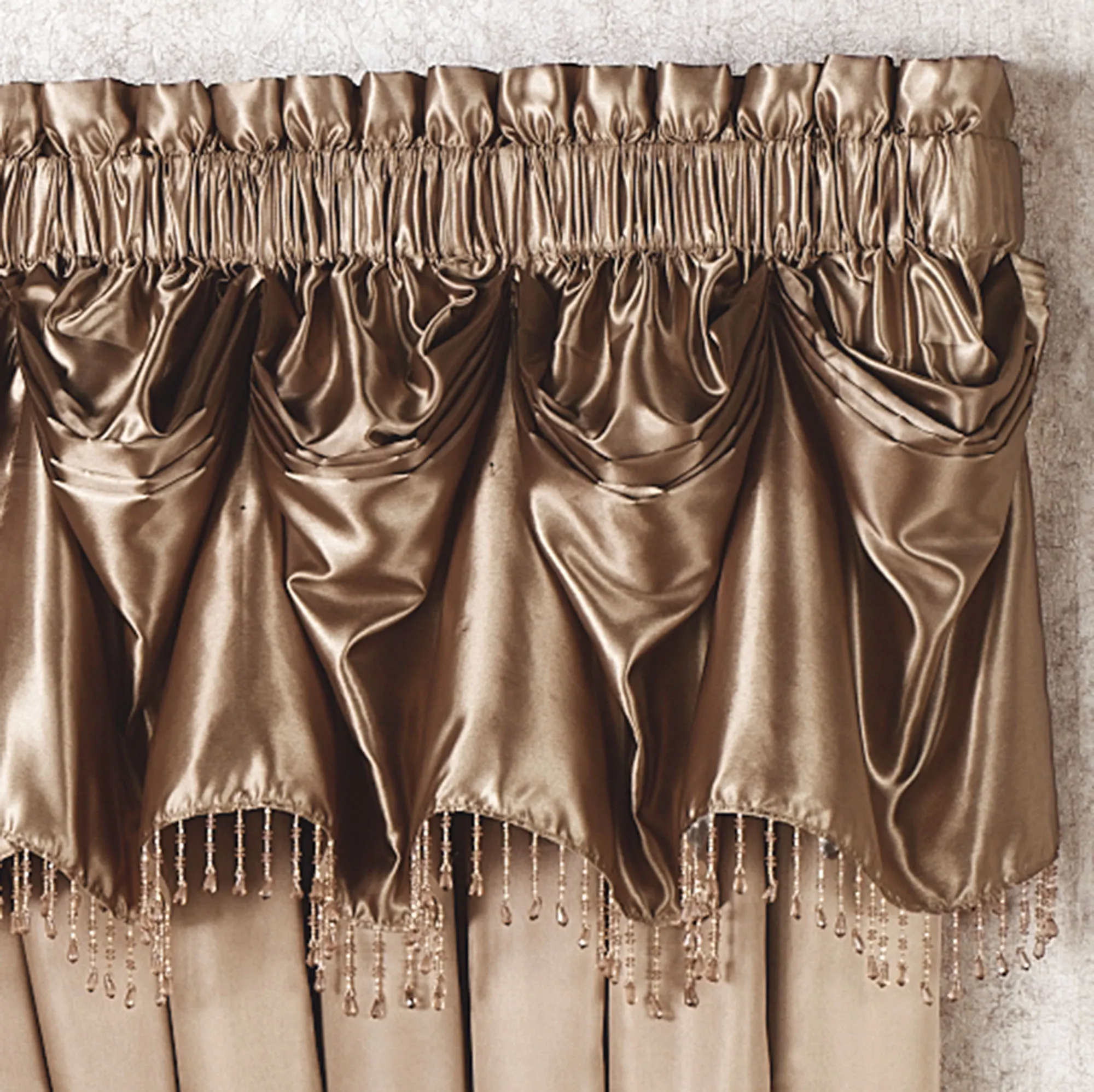 The polyester satin Portia II Window Treatment brings to mind wistful visions of French cafes and grand ballrooms. Specify Tuck Valance or Wide Curtain Pair. Tuck Valance has beaded trim. Tailored, lined Wide Curtains include sash tiebacks with beaded fringe. Specify Smoky Topaz, Pearl, Rose Quartz, Ruby, or Sapphire. Window treatment has 2.5" rod pockets. Machine wash. Imported. The curtain pair width is the total width of two panels together.